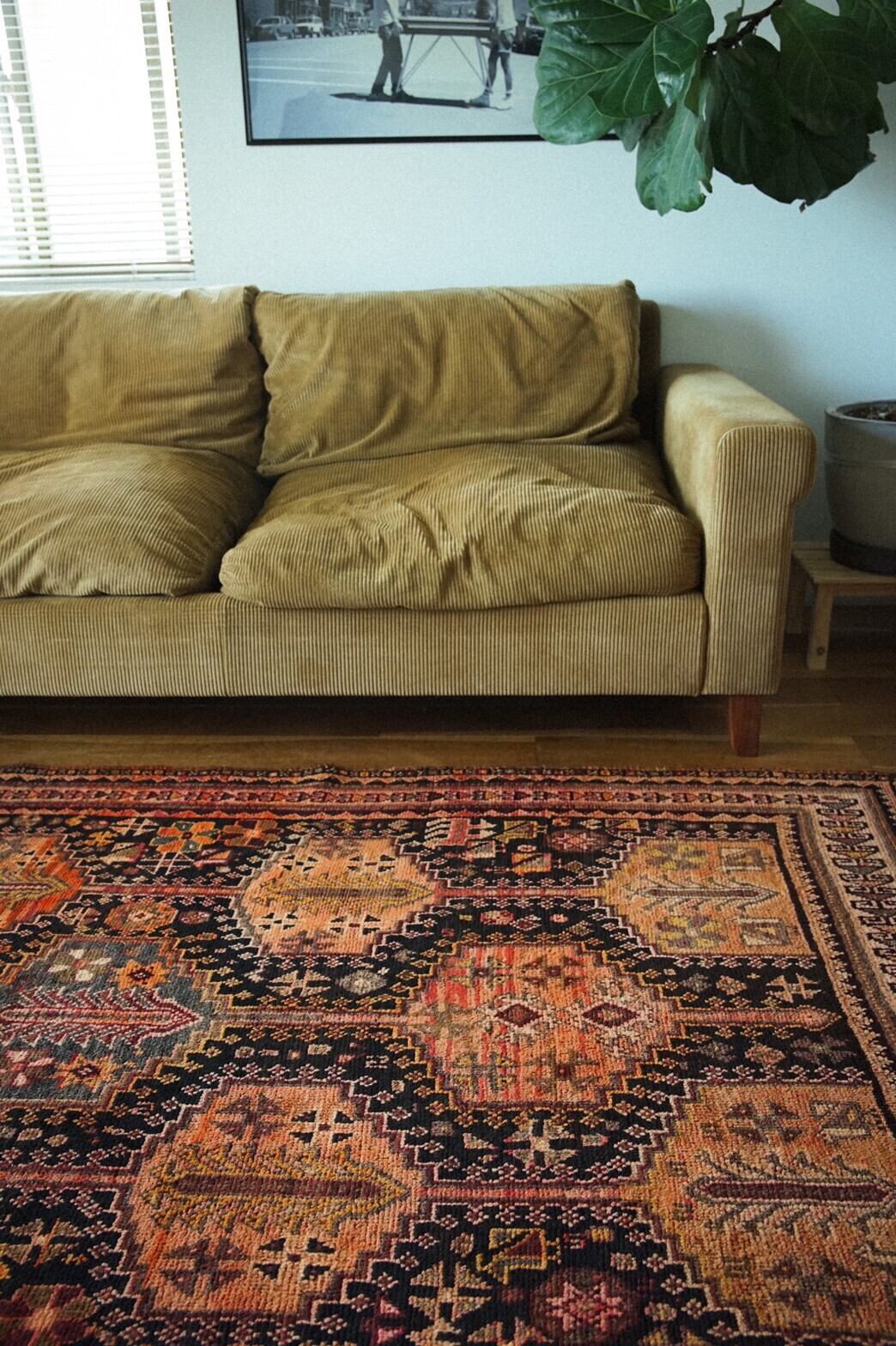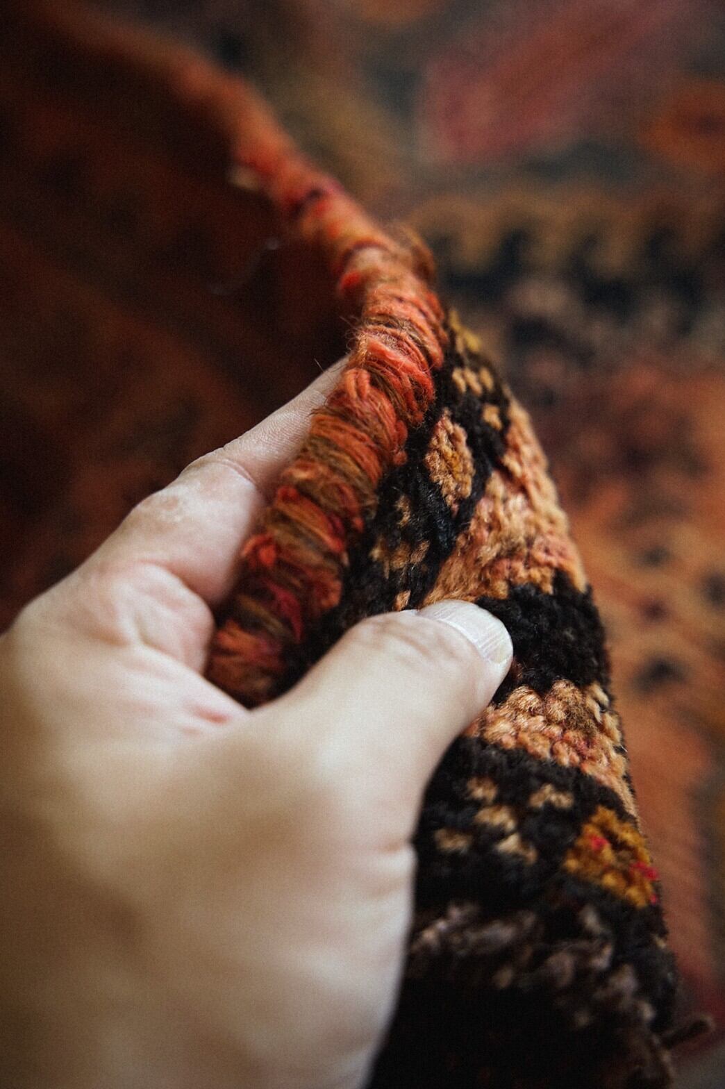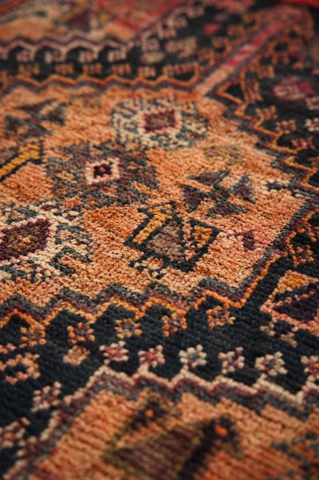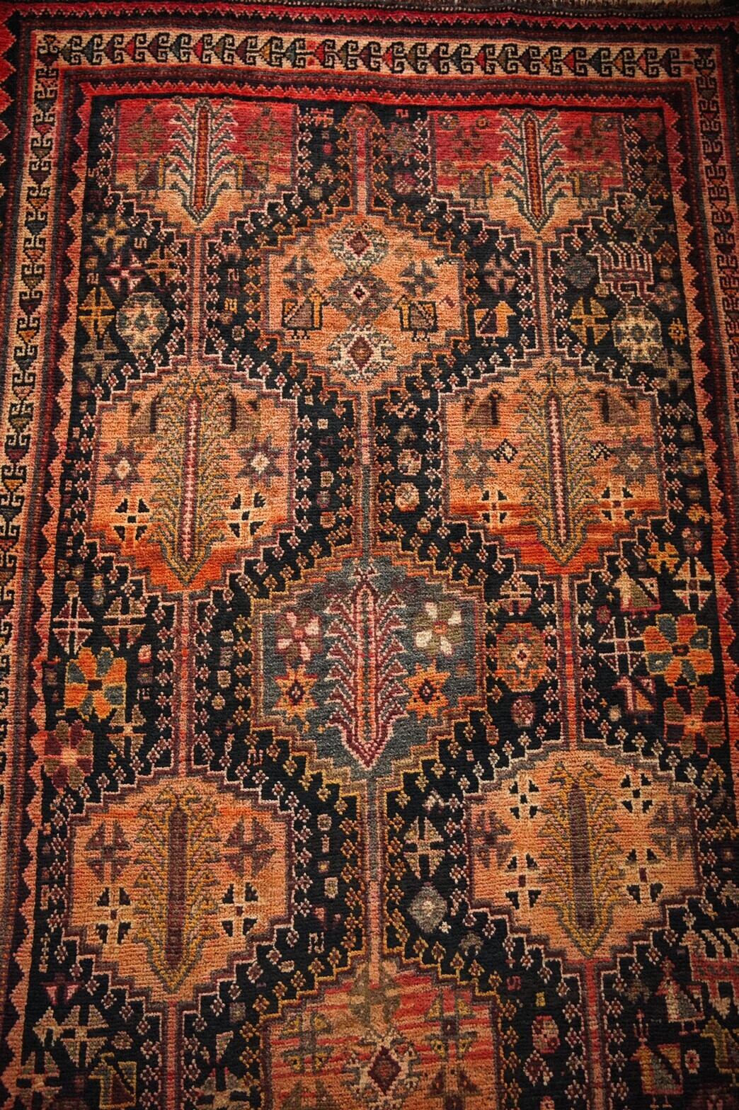 茜色~オレンジの夕焼け色のようなアブラッシュがとても美しいヤラメラグ。フィールドの墨黒の落ち着いた色合いが全体を引き締めています。シンプルな色使いながらも濃い部分、淡い部分のグラデーションはついつい見惚れてしまいます。ラグ全体はクールな印象ですが、よく見ると鳥や生命の樹、花や八角星などたくさんのモチーフが並んでいます。パイルは長すぎず短すぎずのちょうど良い厚みあり。ダメージや補修跡もなくグッドコンディション。リビングに敷いたり、ダイニングテーブルの下、書斎やソファ前におすすめのサイズです。渋かっこいいラグをお探しの方はぜひ♪