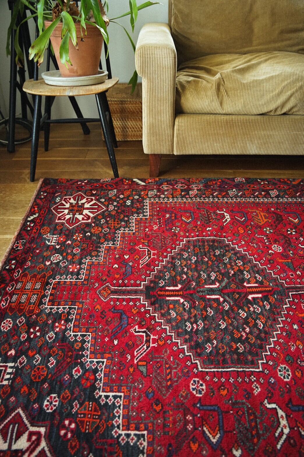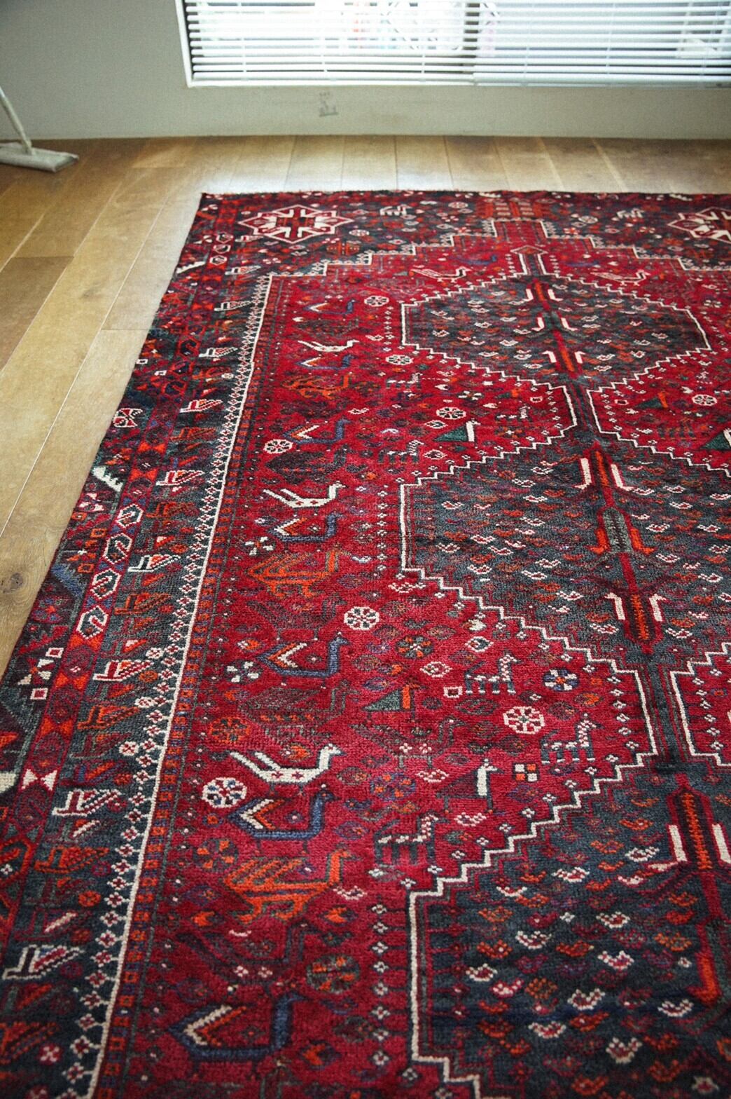 落ち着いたトーンの赤系カシュガイラグ。フィールドには花やたくさんの鳥や動物がいて華やかながらも色使いがシンプルにまとめられているので主張しすぎずインテリアにも取り入れやすいかと思います。3つ並んだメダリオンの墨黒もシックで素敵です。状態はとても良くダメージや補修跡、擦れも無し。パイルは少し短めでサラッとしていますが厚みがありラグの上でゴロゴロするにはぴったりの大判サイズ。リビングに敷いたり、ダイニングテーブルの下、書斎やソファ前におすすめです。北欧インテリアにも馴染みそうな雰囲気ですよ♪