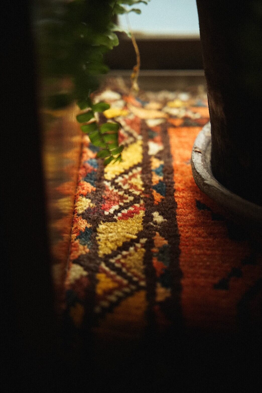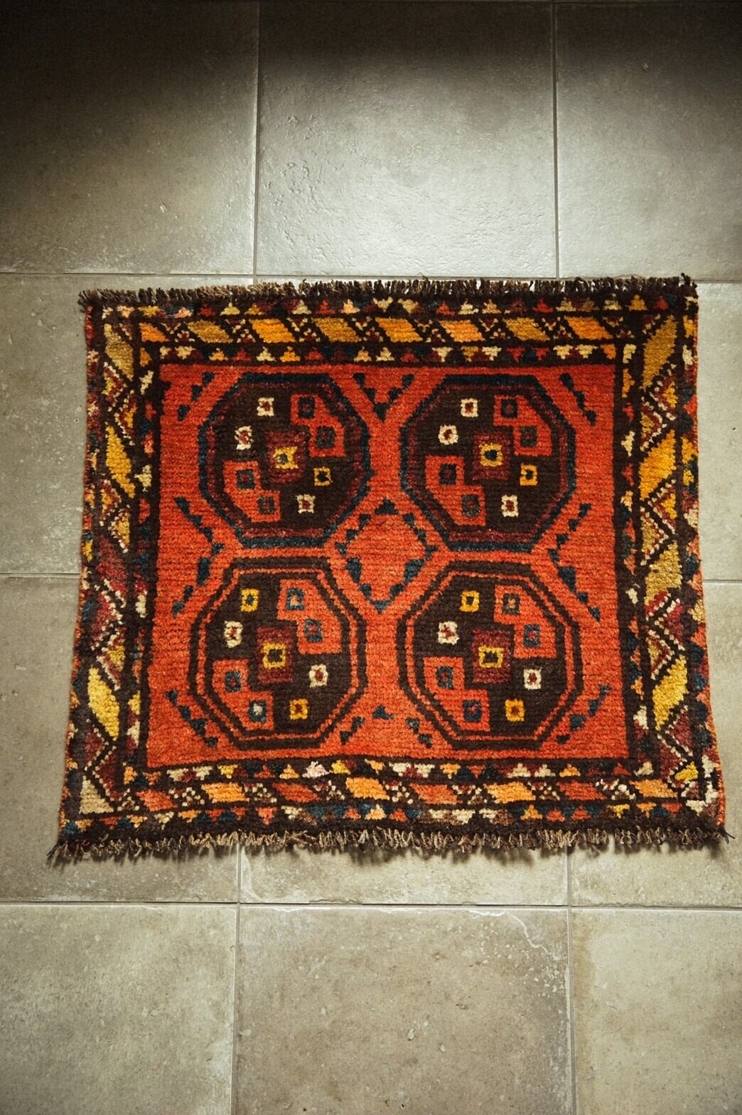 オレンジとイエローのビタミンカラーが元気になれそうなマルダリラグ。太めのパイルで織られているためか油絵具で描かれたような雰囲気が魅力的。ボーダー部分のジグザグ模様のカラフルな色合いも何とも言えずかわいいです。ラインは黒ではなくブラウンなので暖色系でまとまっています。ダメージや補修跡もなくフカフカ感もあります。パイルもきれいに残っていますよ。足元に敷いたり、姿見の前や他のラグとの重ね敷きやインテリアのアクセントにどうぞ♪