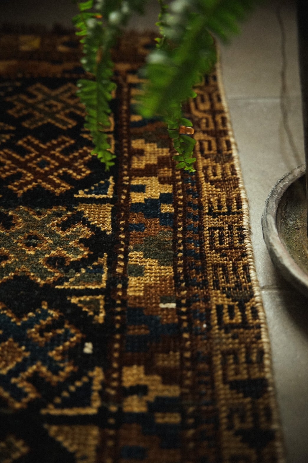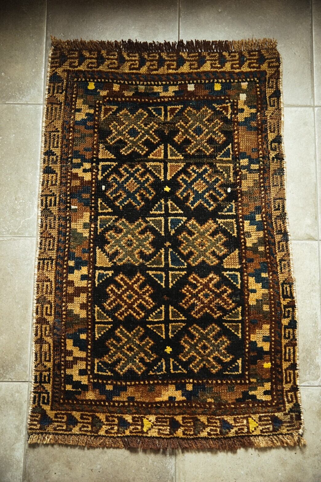 ブラウン×インディゴブルーの落ち着いた色合いのタイマニラグ。ボーダー部分のモザイクタイルのような配色がおもしろいですね。ポイントで使われているイエローもアクセントになっていてかわいいんです。目立ったダメージや補修跡はなくパイルもしっかり残っています。パイルは短めなのでサラッとした手触り。玄関やキッチンに、また姿見の前や植物と一緒に窓辺に敷いてみてはいかがでしょうか?