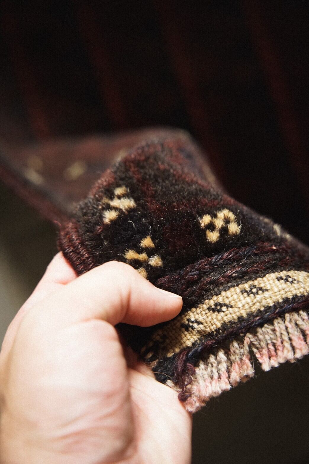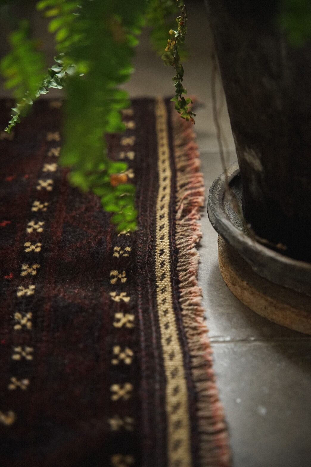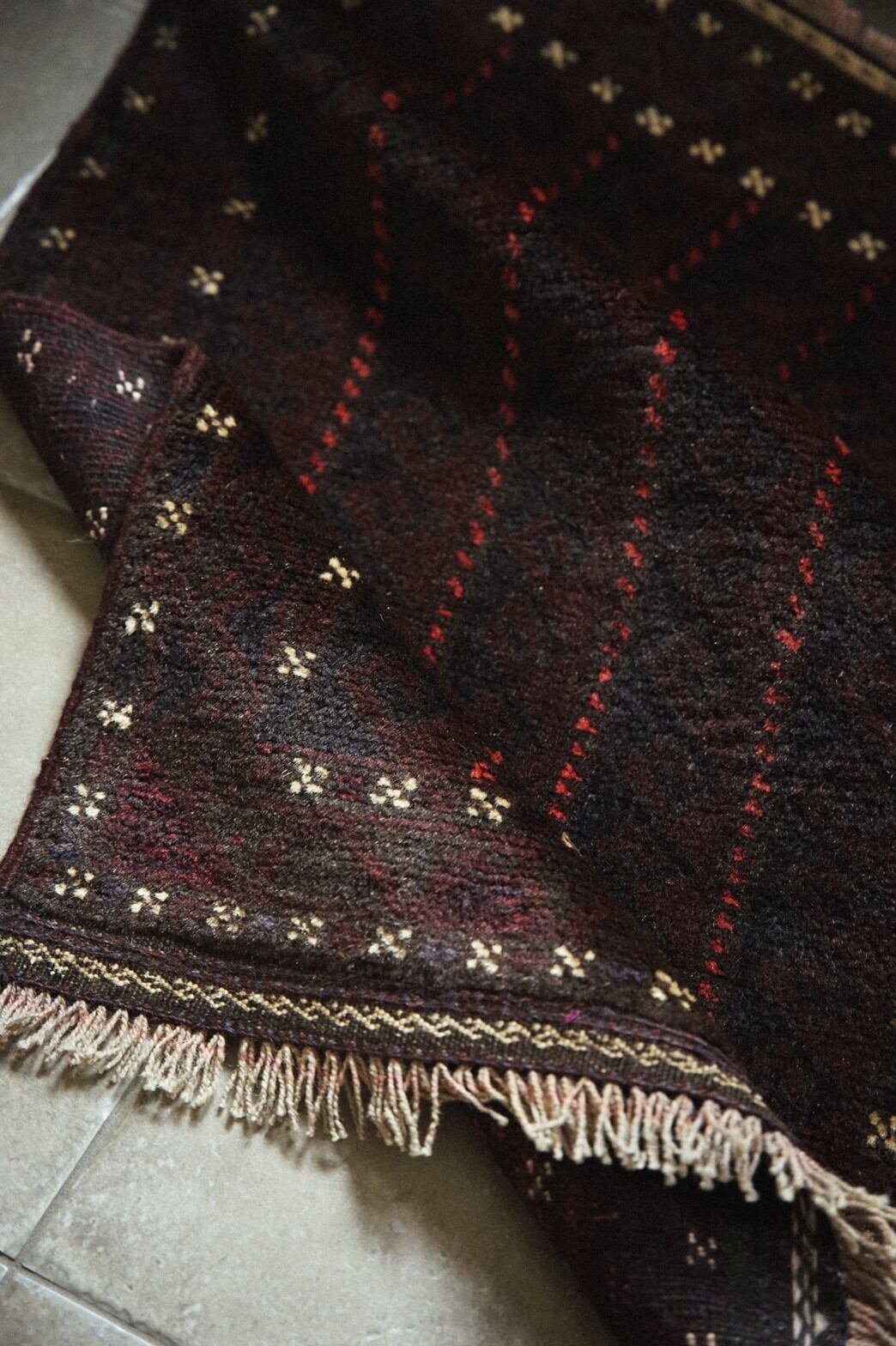 こげ茶色に黒に近いネイビーで連続紋様が描かれた深みのあるシックな色合いがとてもかっこいいバルーチラグ。日本人好みの渋い色合いを使ったラグが多いバルーチ族のラグは和室にもとても相性が良いですよ♪ダメージや補修跡もなくグッドコンディション。素足で乗ると気持ちの良い感触と厚み。玄関やキッチン、植物を置いたり姿見の前に敷いたりするのがおすすめのサイズです。