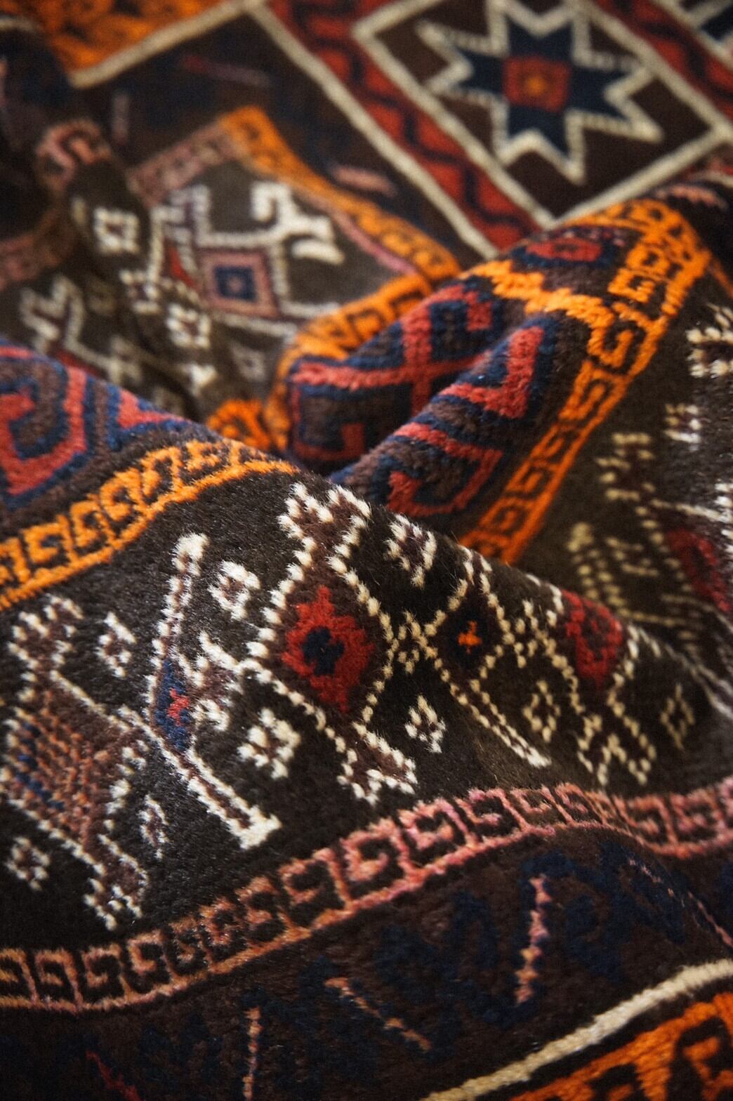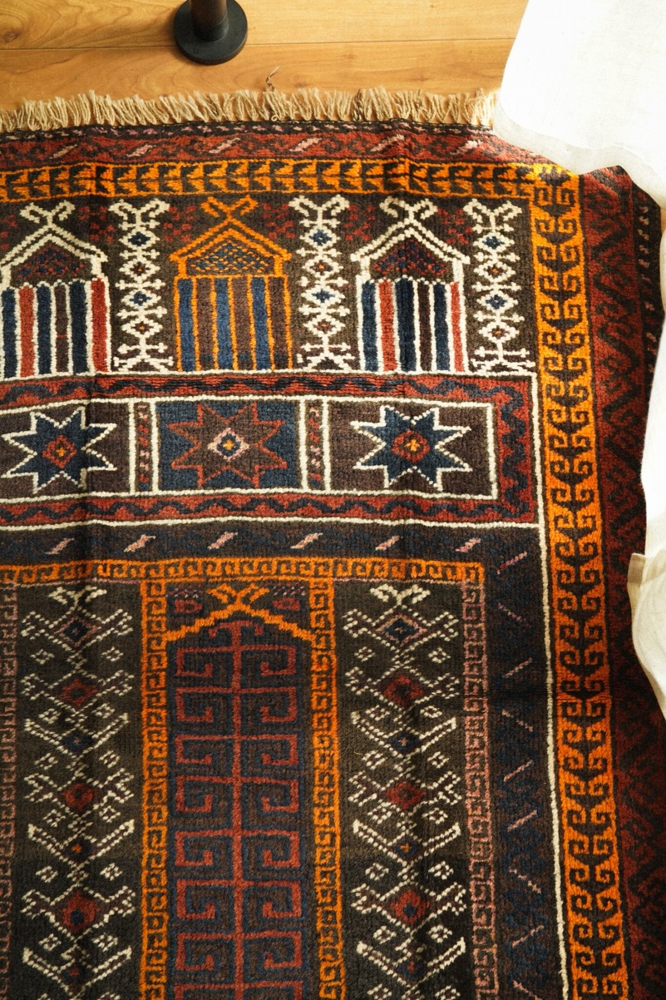 赤、アイボリー、ネイビー、そして目を引くオレンジが焦茶のシックなフィールドに映えミフラーブ模様がとてもくっきりと美しく浮かび上がります。
