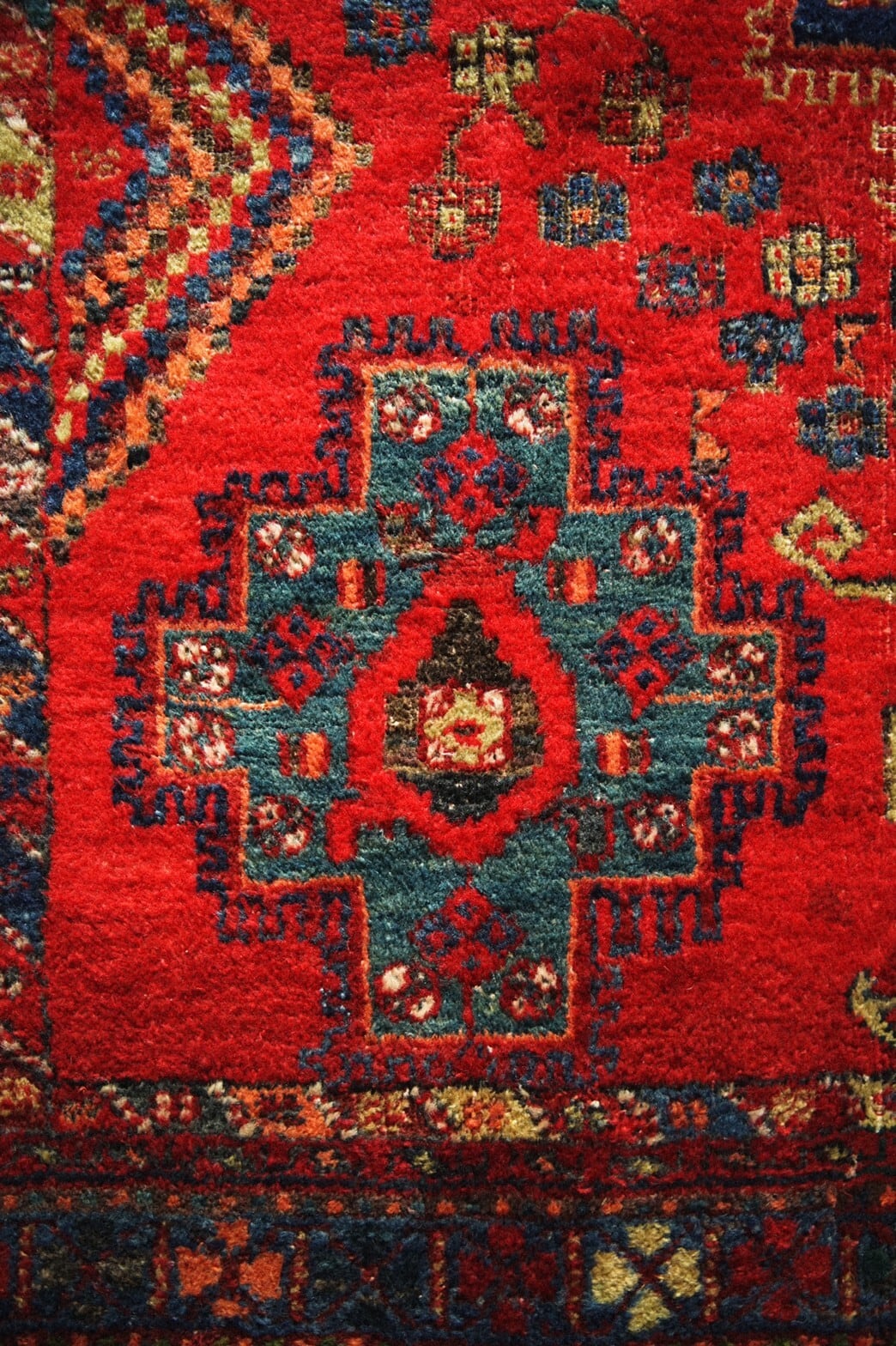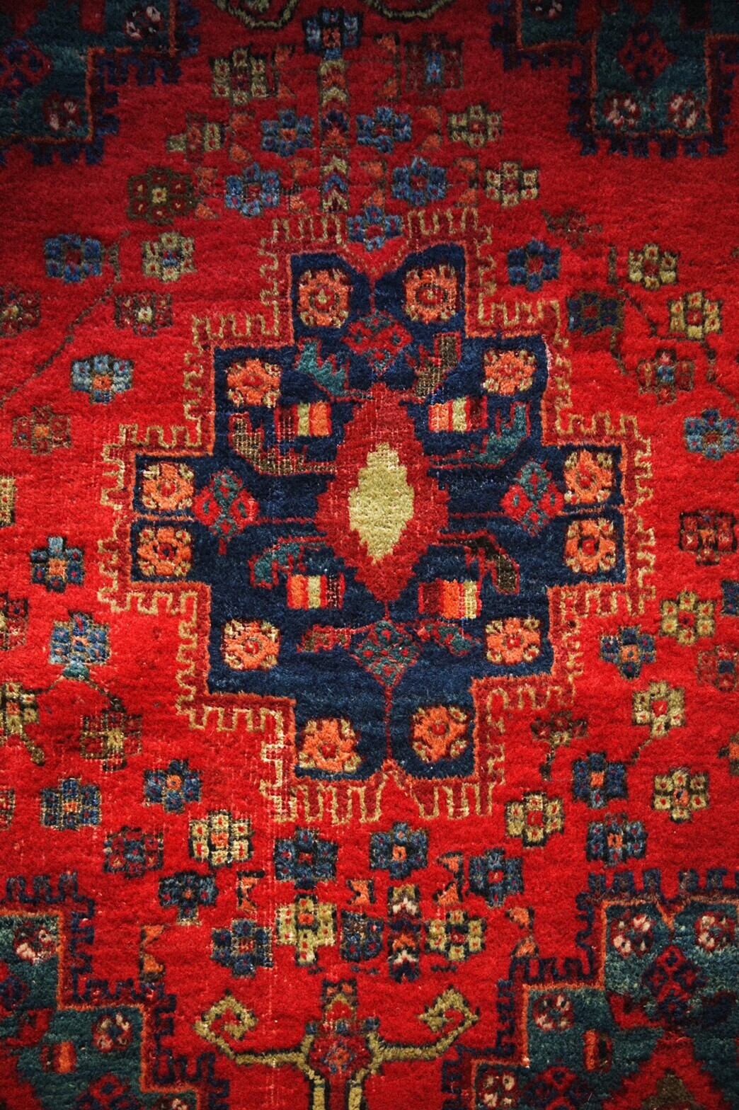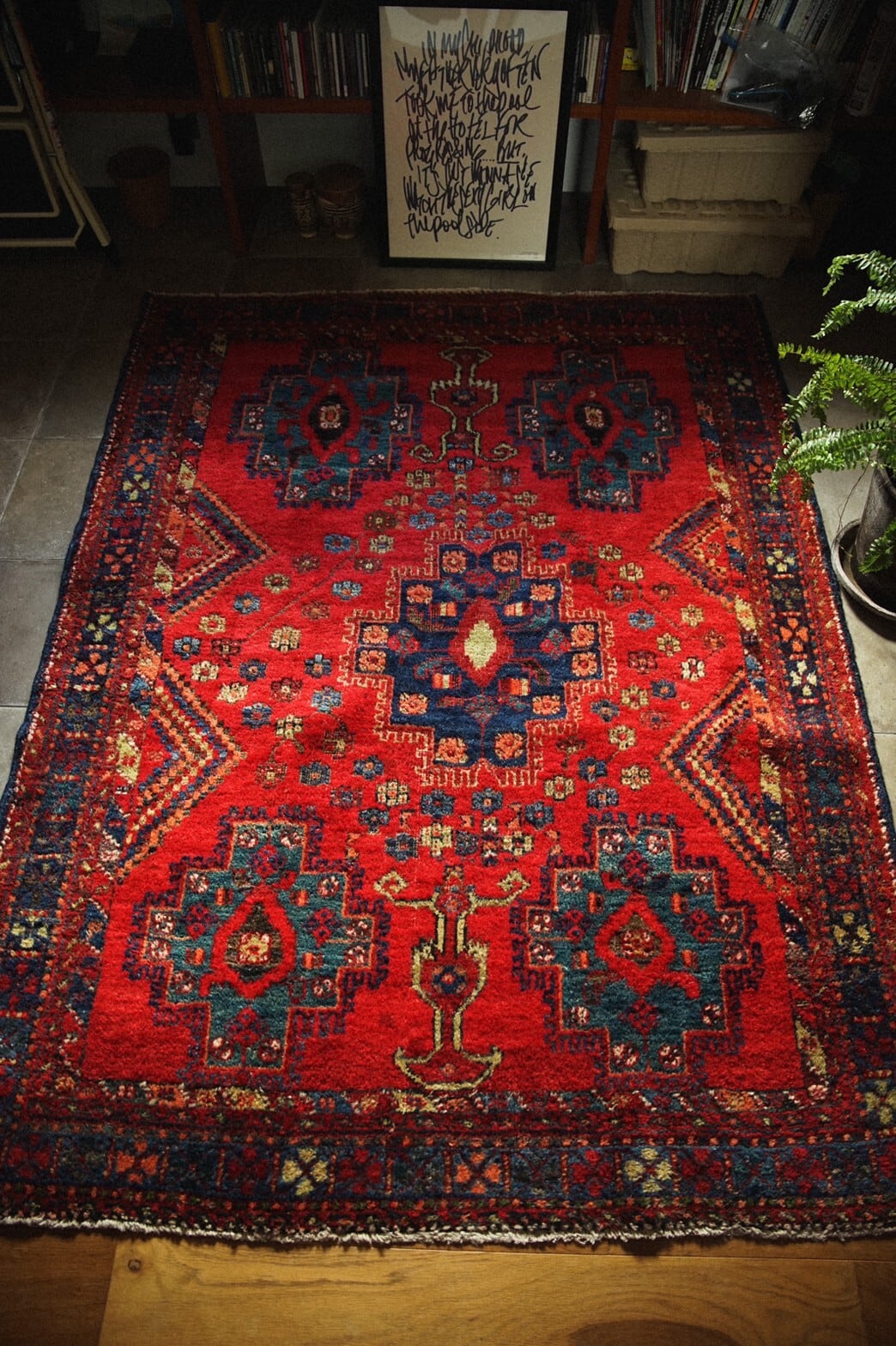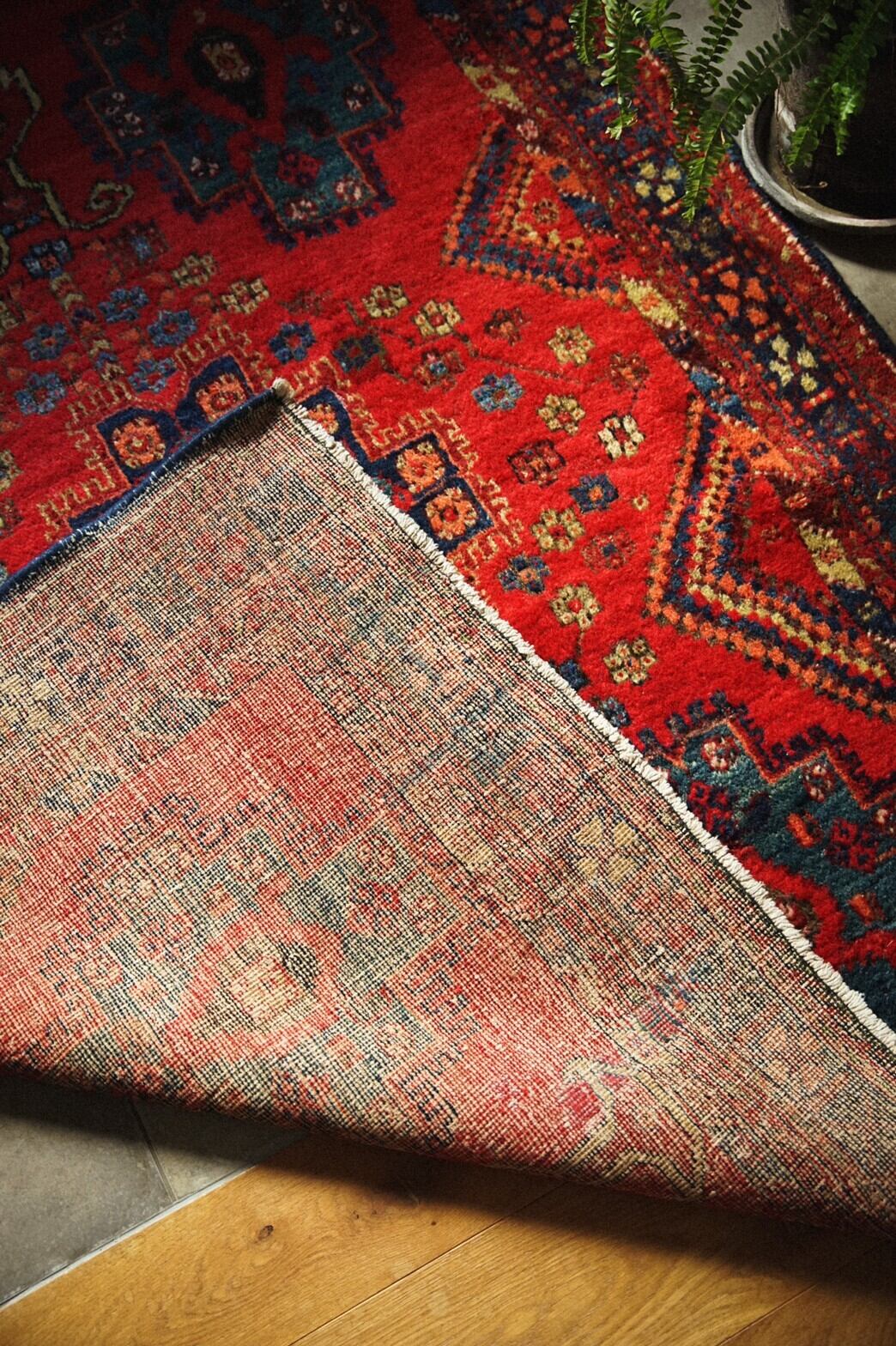 色彩感覚に長けたアフシャル族の魅力が詰まっているラグ。目を惹く茜色のフィールドと5つあるメダリオンのブルーがとても美しいです。緑がかった浅葱色も、吸い込まれそうな紺藍色もずっと見ていたくなります。センターメダリオンを囲むように散りばめられた花模様もとてもかわいいです。異国情緒あふれる雰囲気で、和のインテリアにも洋にもエスニックにも合いそうですね♪パイルもきれいに残っていてフカフカ感もあり手触りも気持ちいいです。リビングに敷いたり、ダイニングテーブルの下、書斎やソファ前におすすめのサイズです。