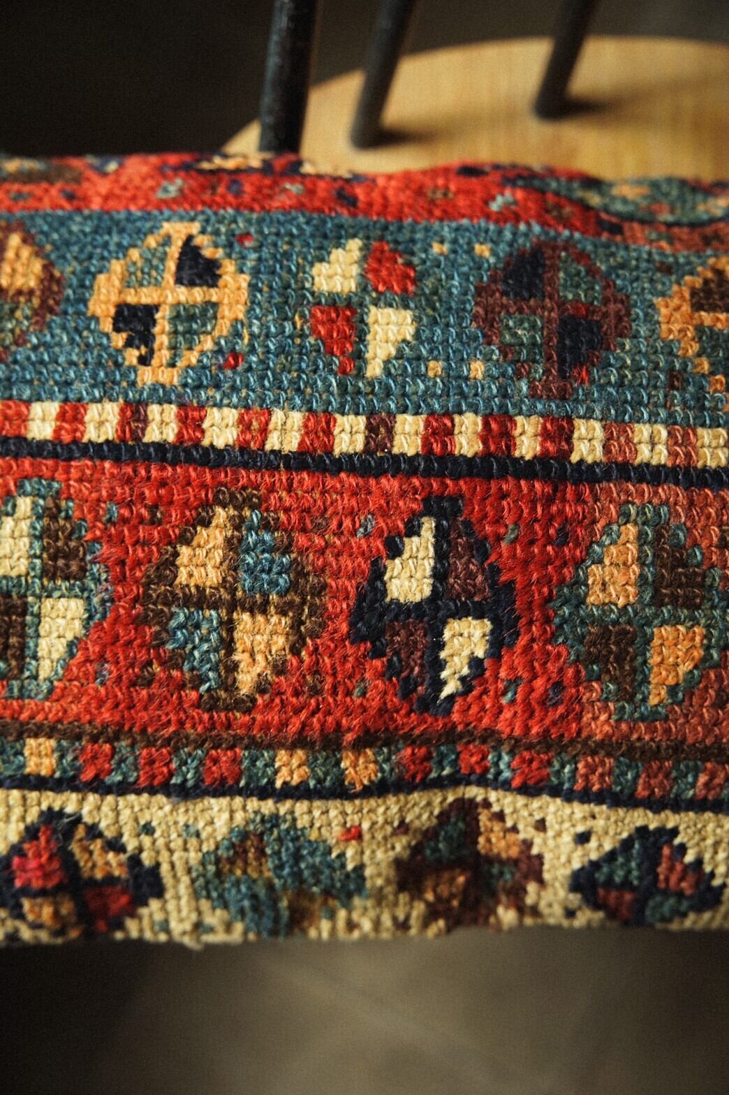 絶妙な色合いとカラフルでかわいいボーダー部分が使われたクルド族のラグ。