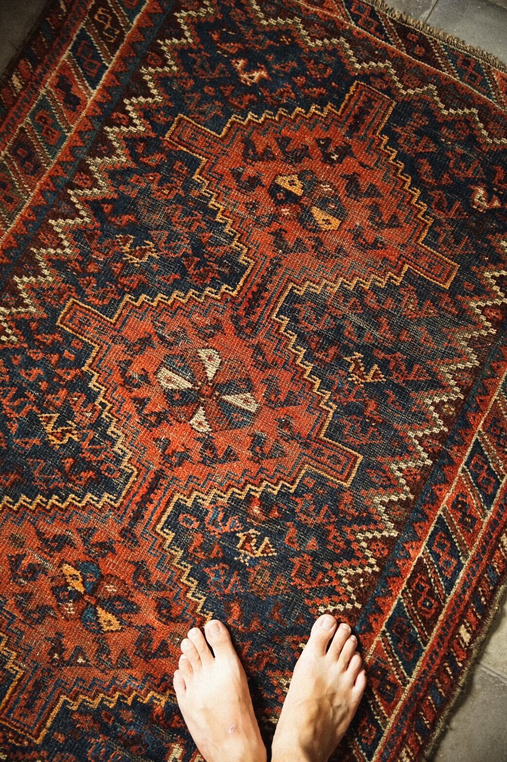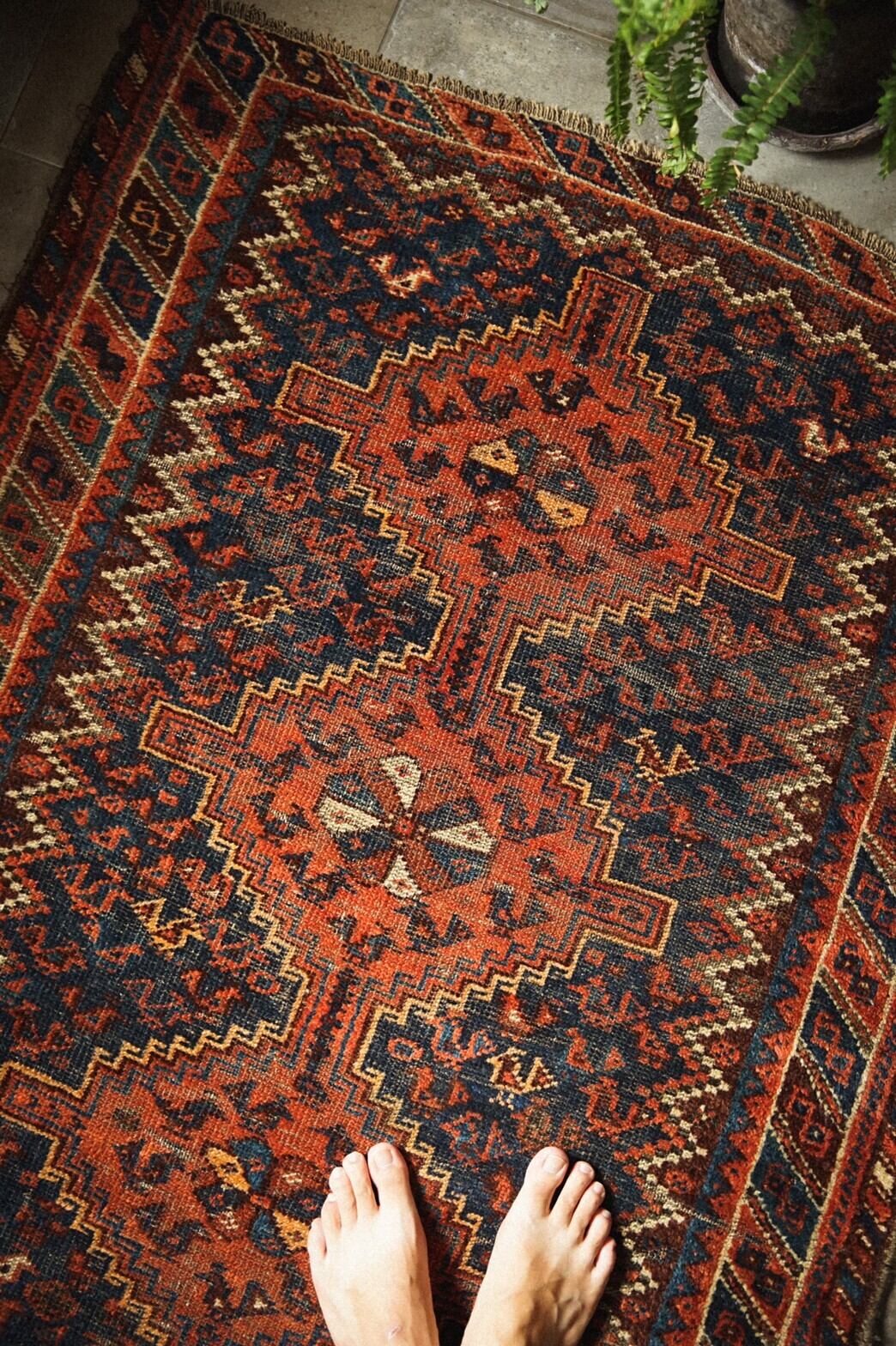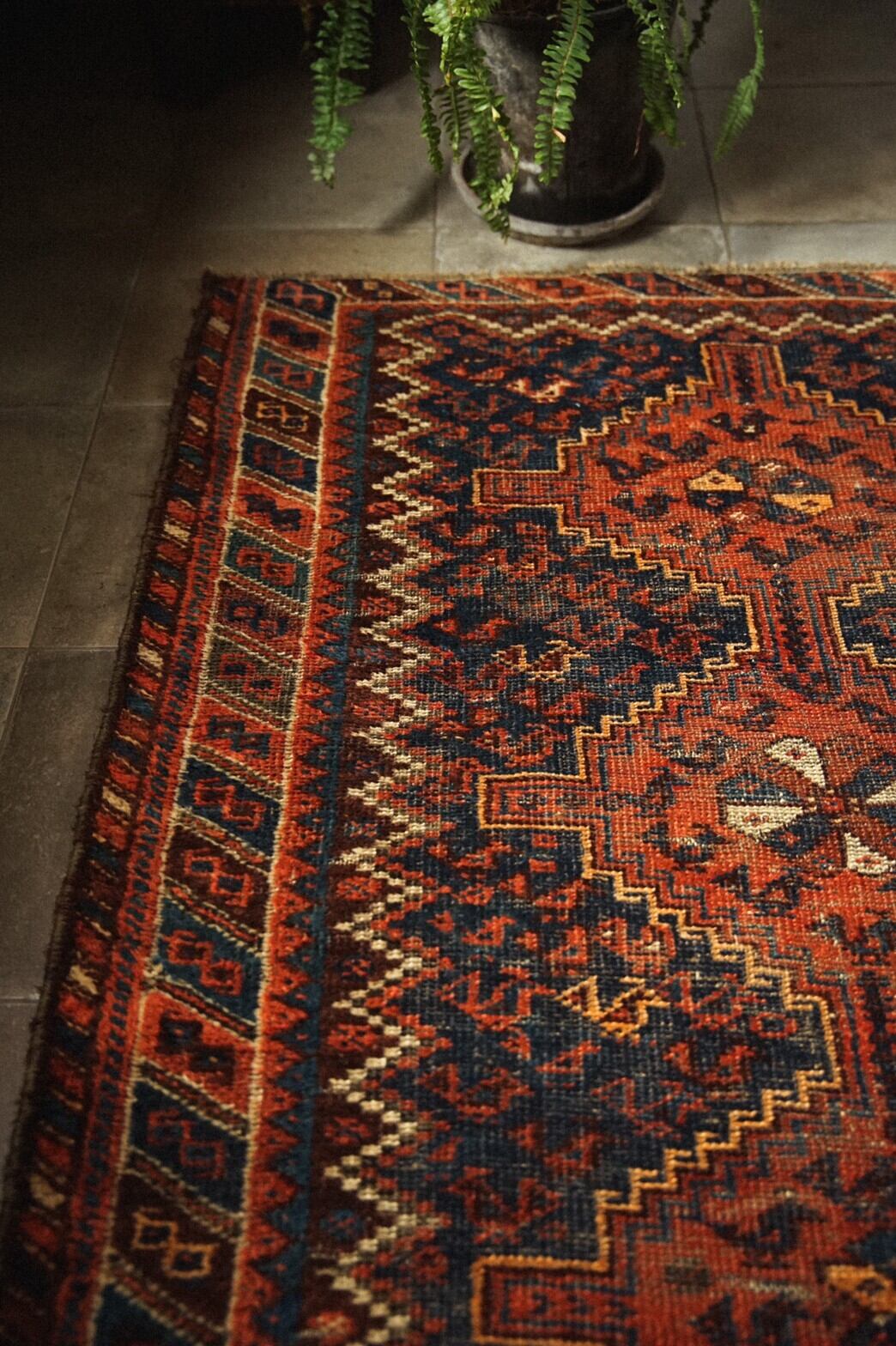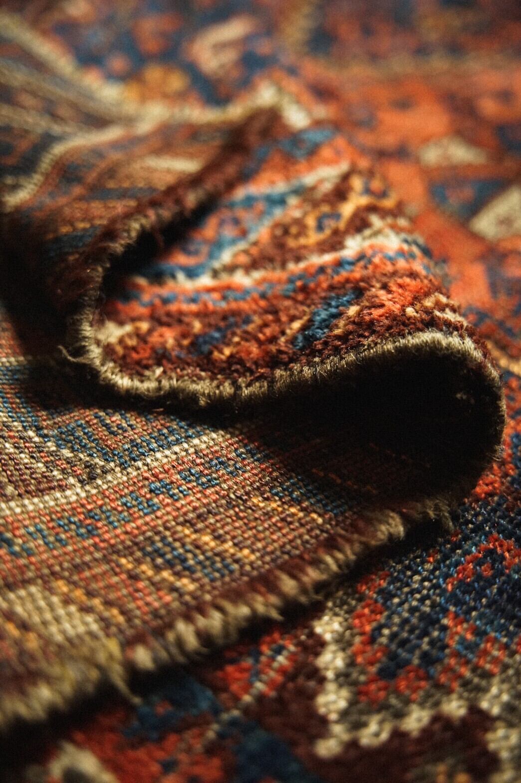 3つ並んだメダリオンの周りの深いネイビーのフィールドにはたくさんの鳥が描かれています。ポイント的に色が入った鳥がいるのが面白いですね。部分的に経年による擦れはありますが、パイルも全体的に残っています。