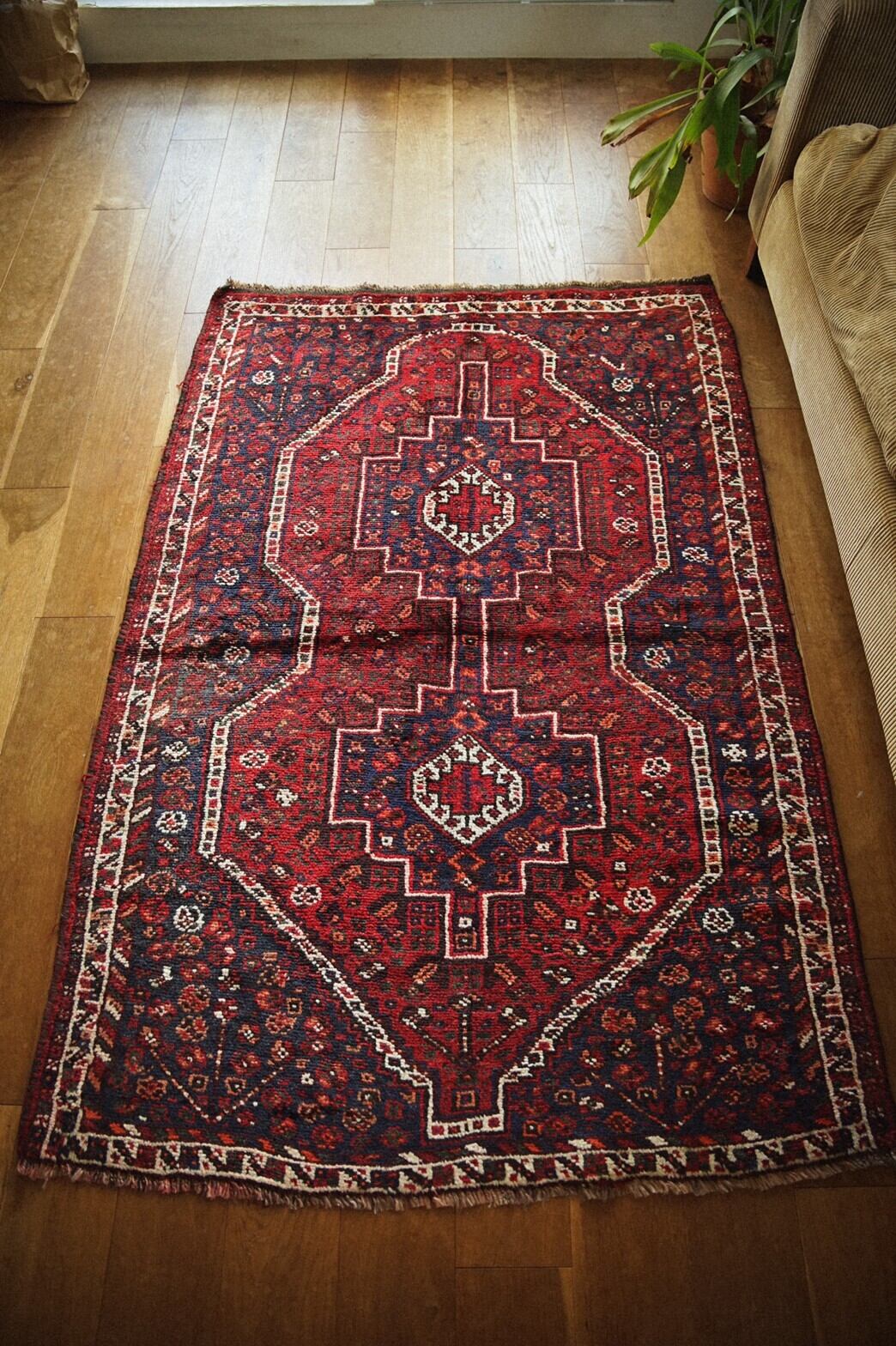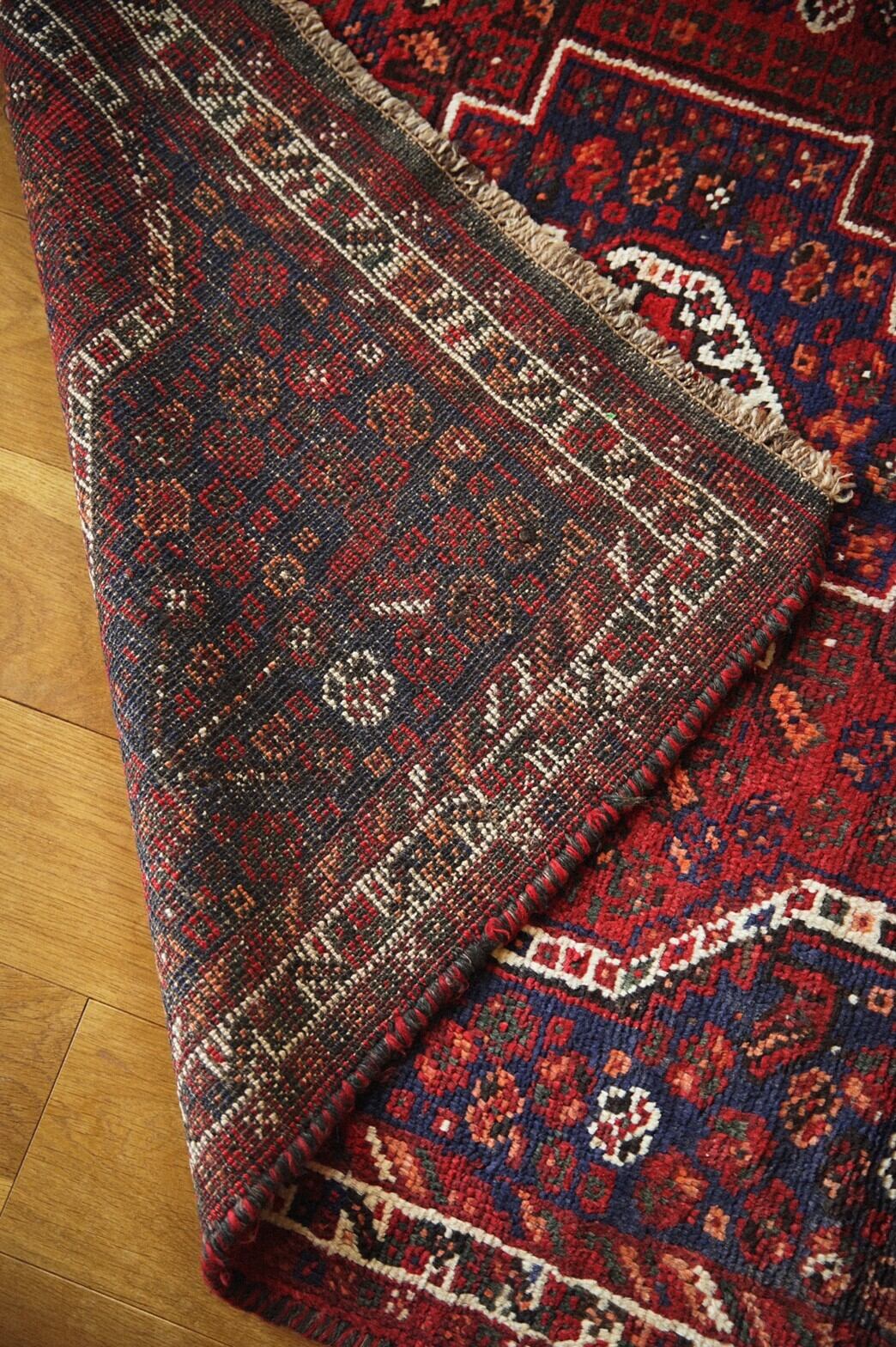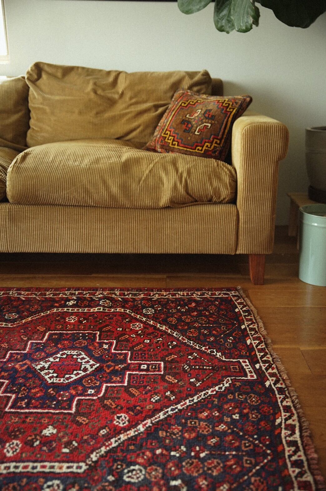 程よい厚みと二人掛けソファにピッタリのサイズ感、艶もあり素晴らしいコンディションで初めてヴィンテージラグのご購入を検討されている方にもおすすめのカシュガイラグです。