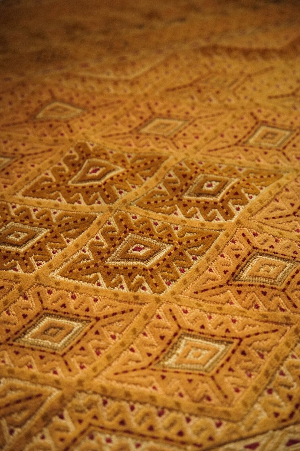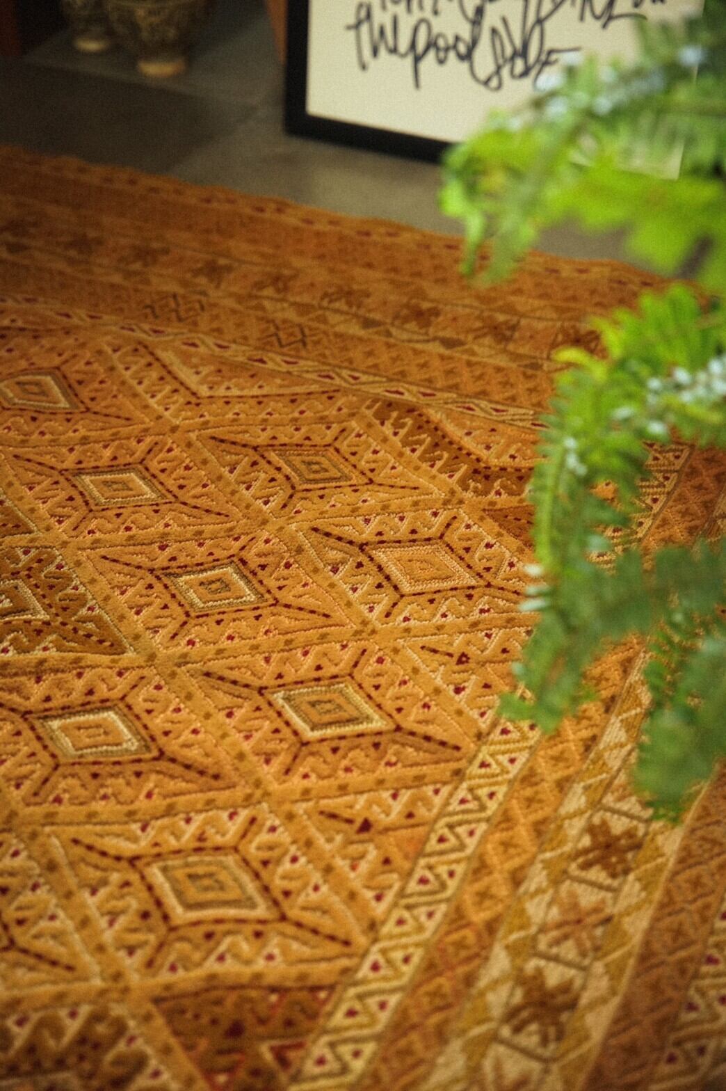 全体がマスタードイエローにボルドーの組み合わせがとてもエレガントな雰囲気の一枚。
