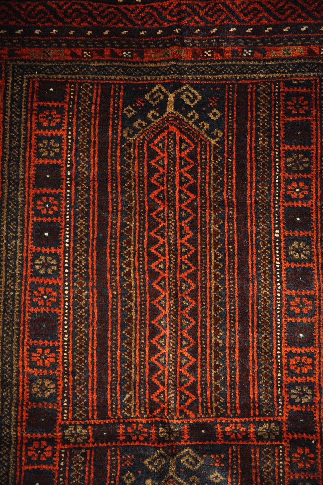 赤ベースに薄茶や濃紺、白で描かれたモチーフ。中心のミフラーブ紋様の周りに並ぶ小花柄がとてもかわいらしいです。