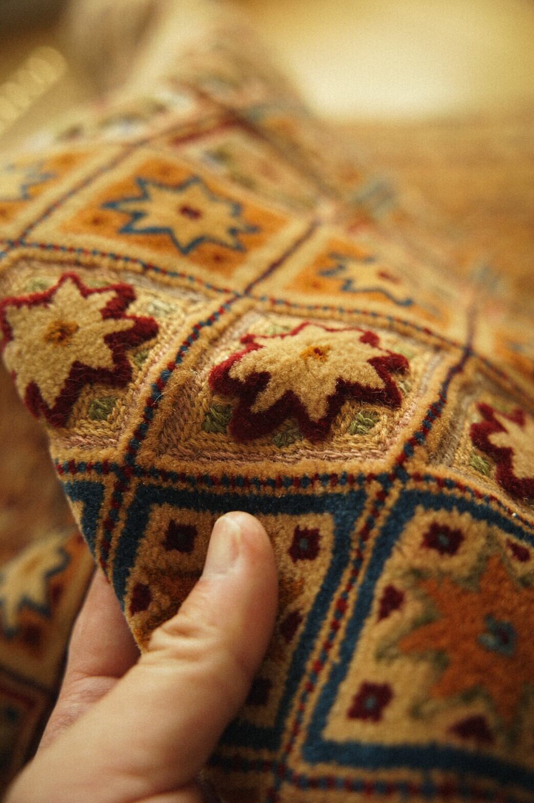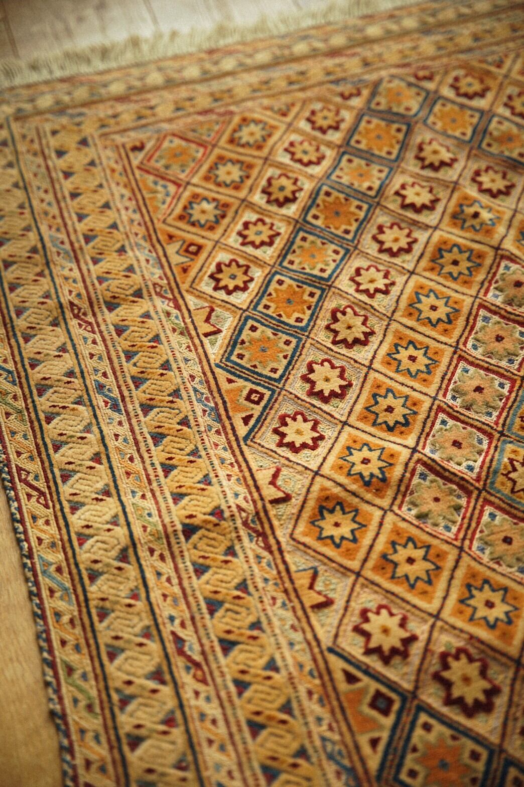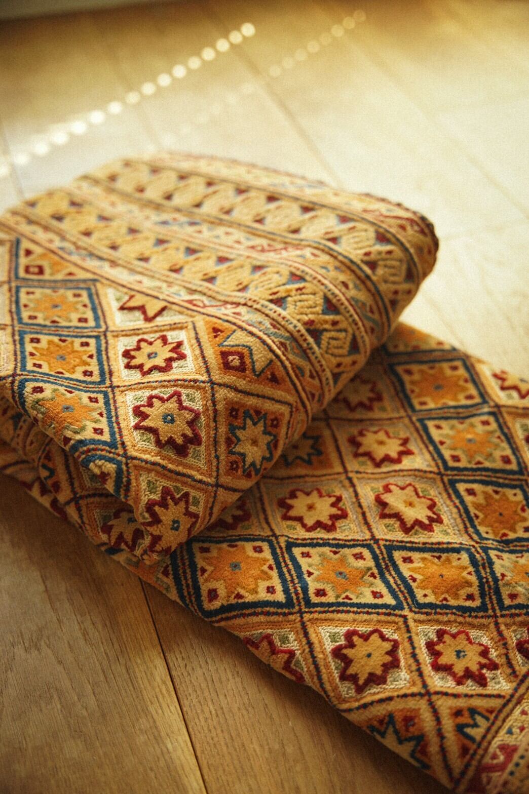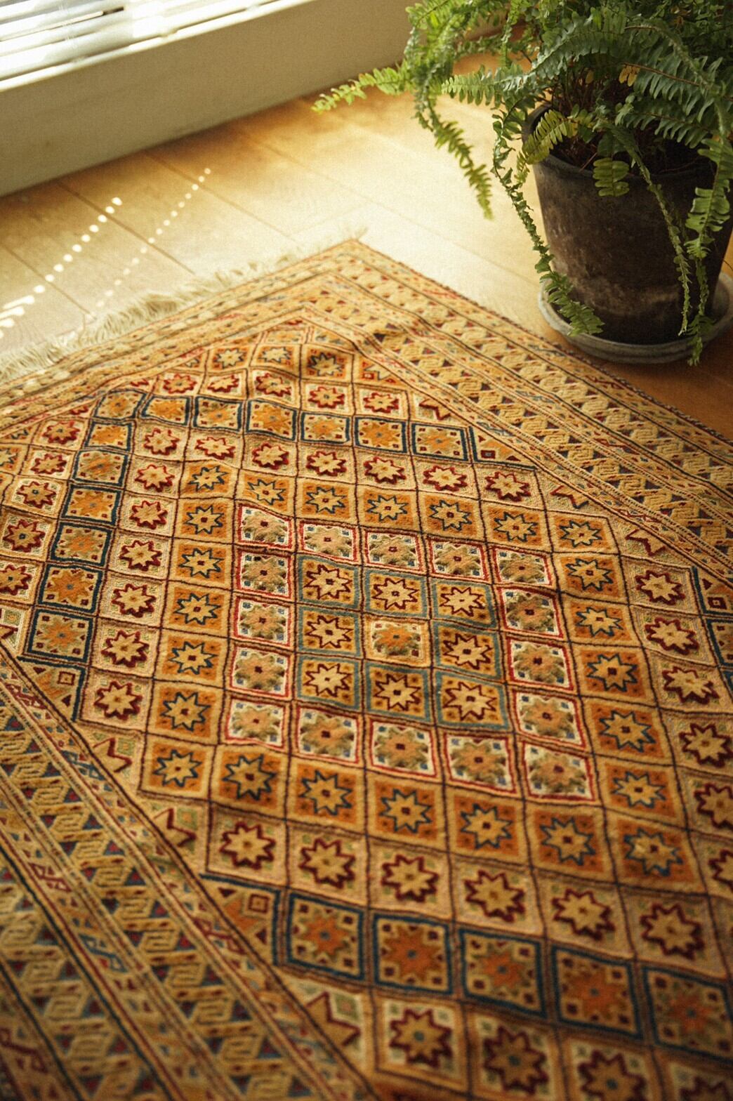 マスタード色のフィールドにはカラフルな色合いで織られた星がたくさん並ぶポップでとてもかわいい雰囲気のラグです。