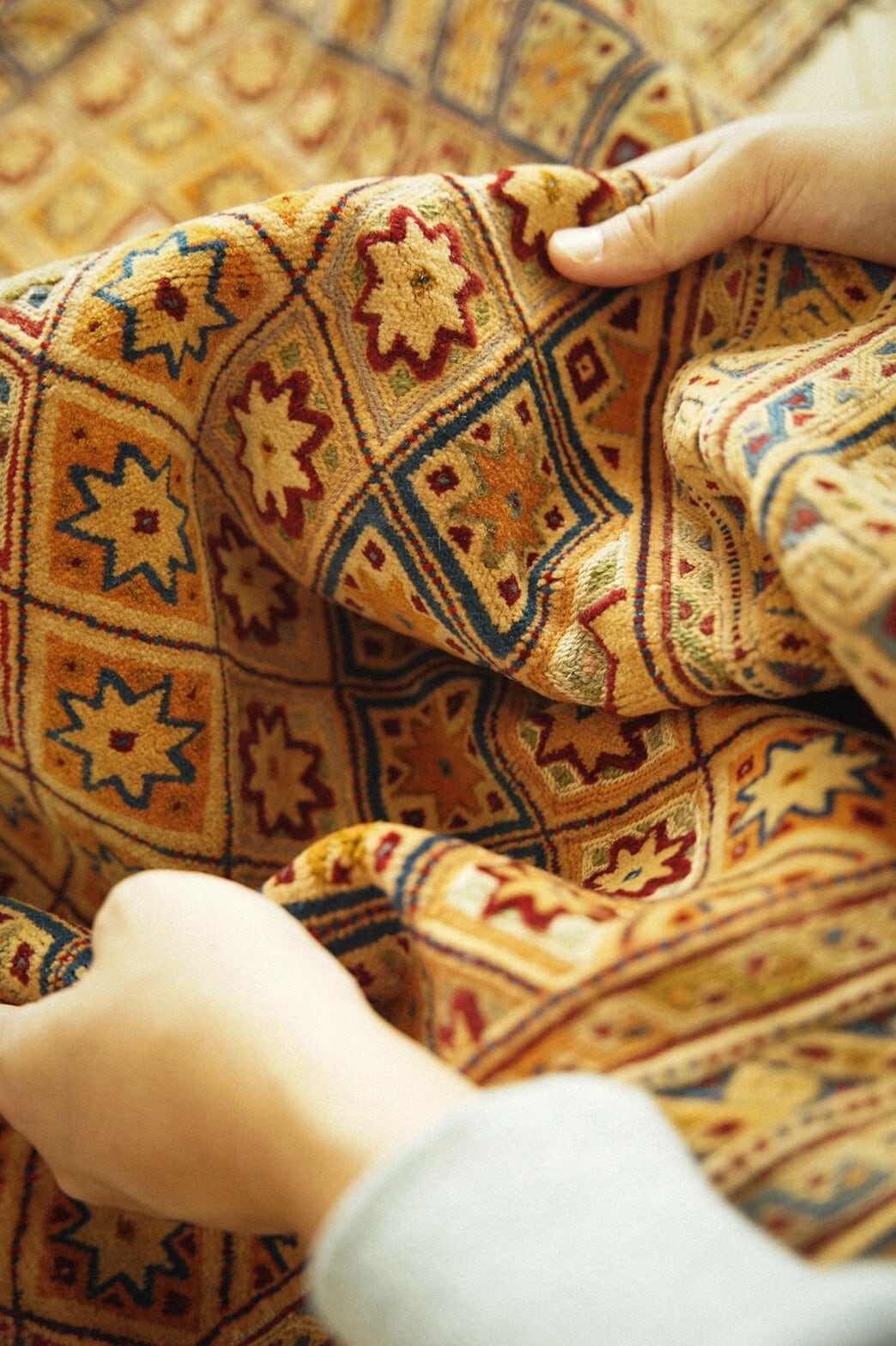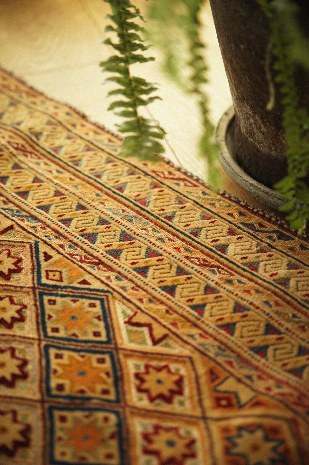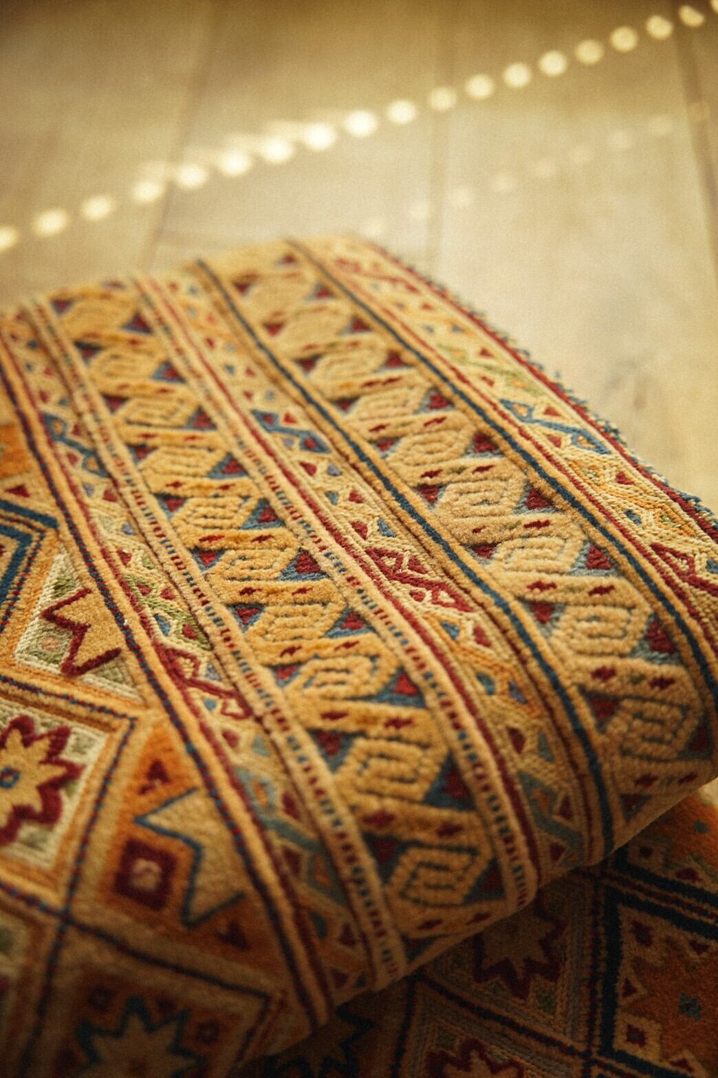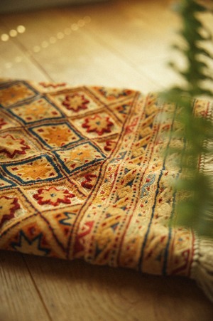 マスタード色のフィールドにはカラフルな色合いで織られた星がたくさん並ぶポップでとてもかわいい雰囲気のラグです。