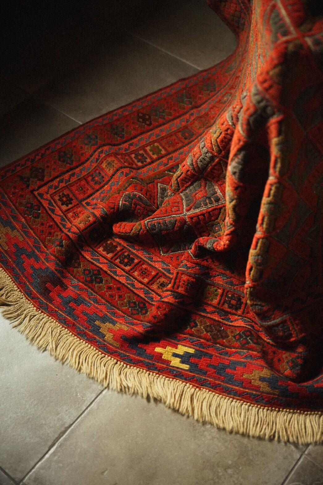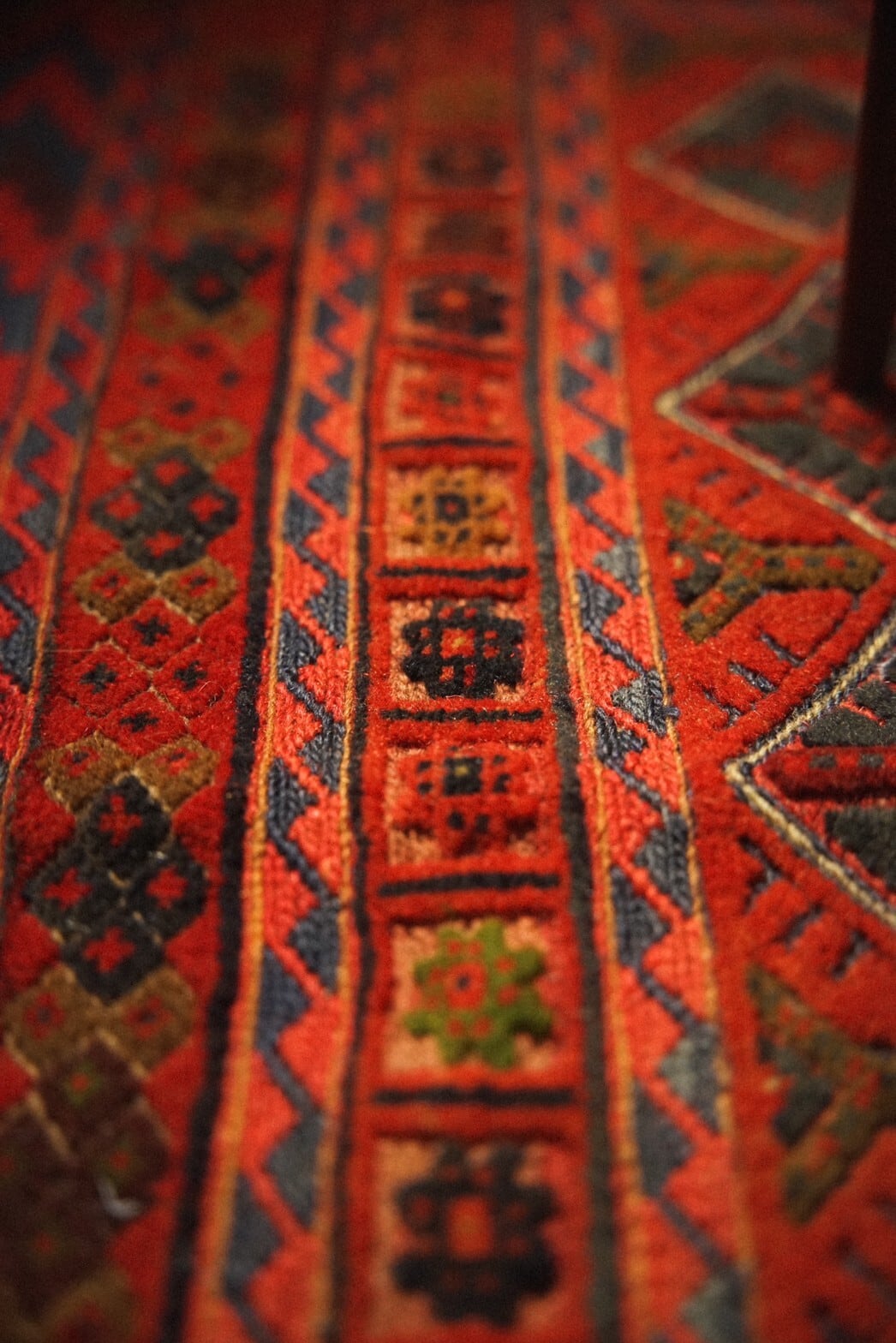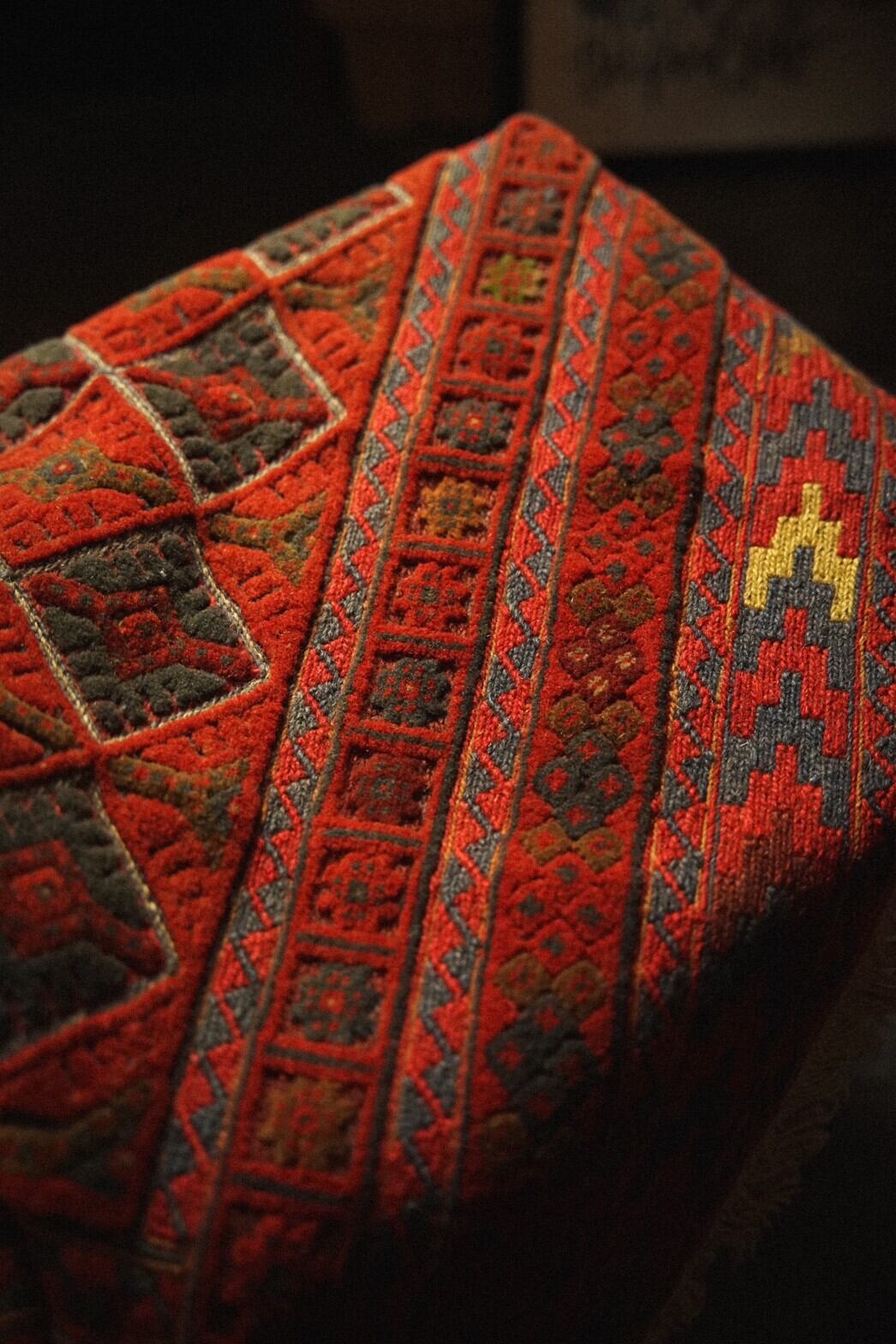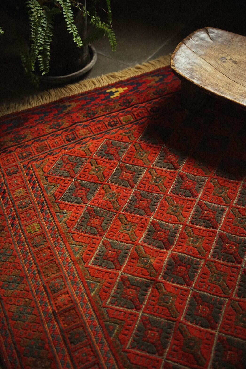 茜色のフィールドには菱形の連続紋様が美しい一枚。落ち着いた色合いが多くなる季節にパワーをもらえる赤色のラグはおすすめです。