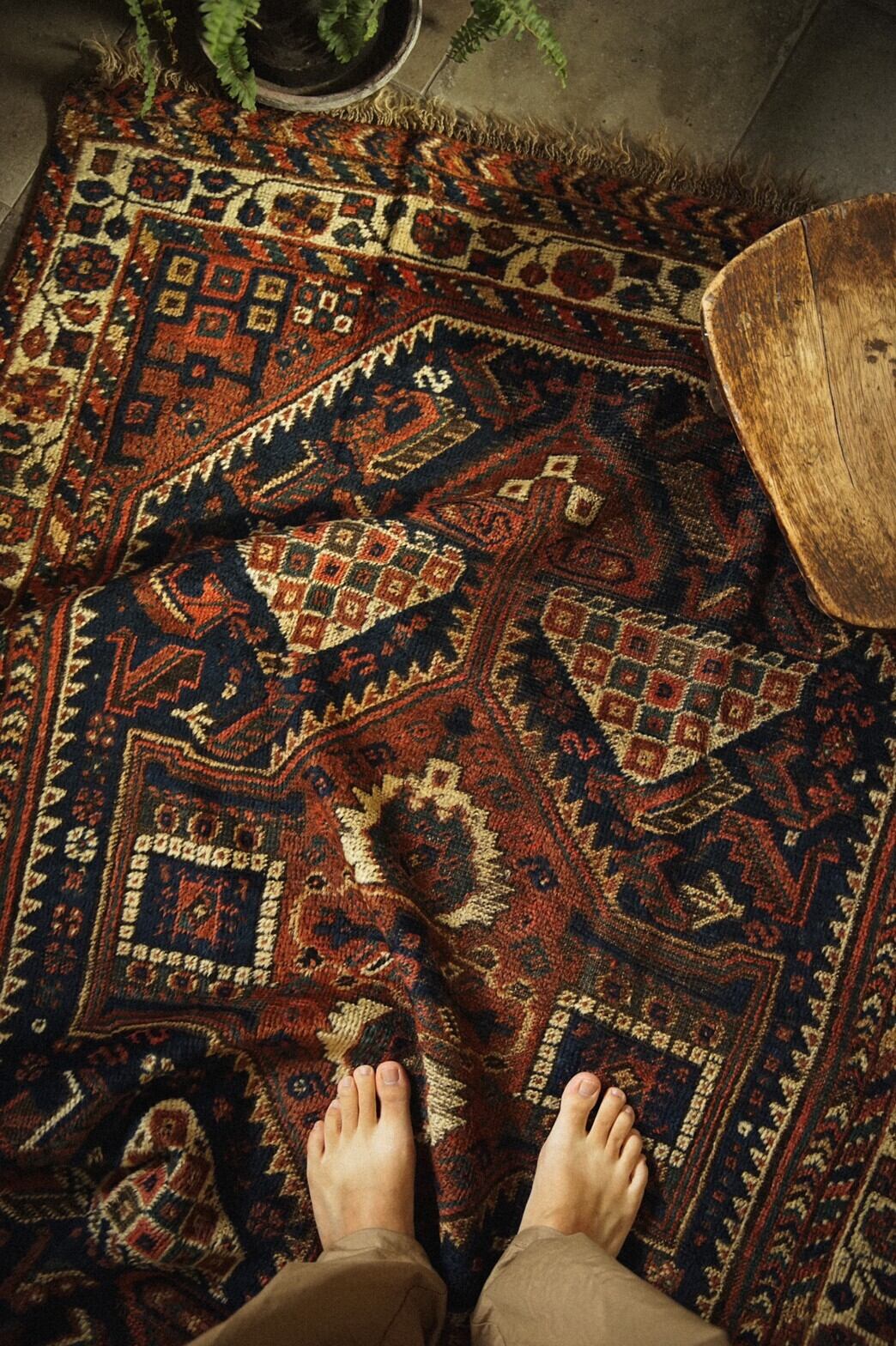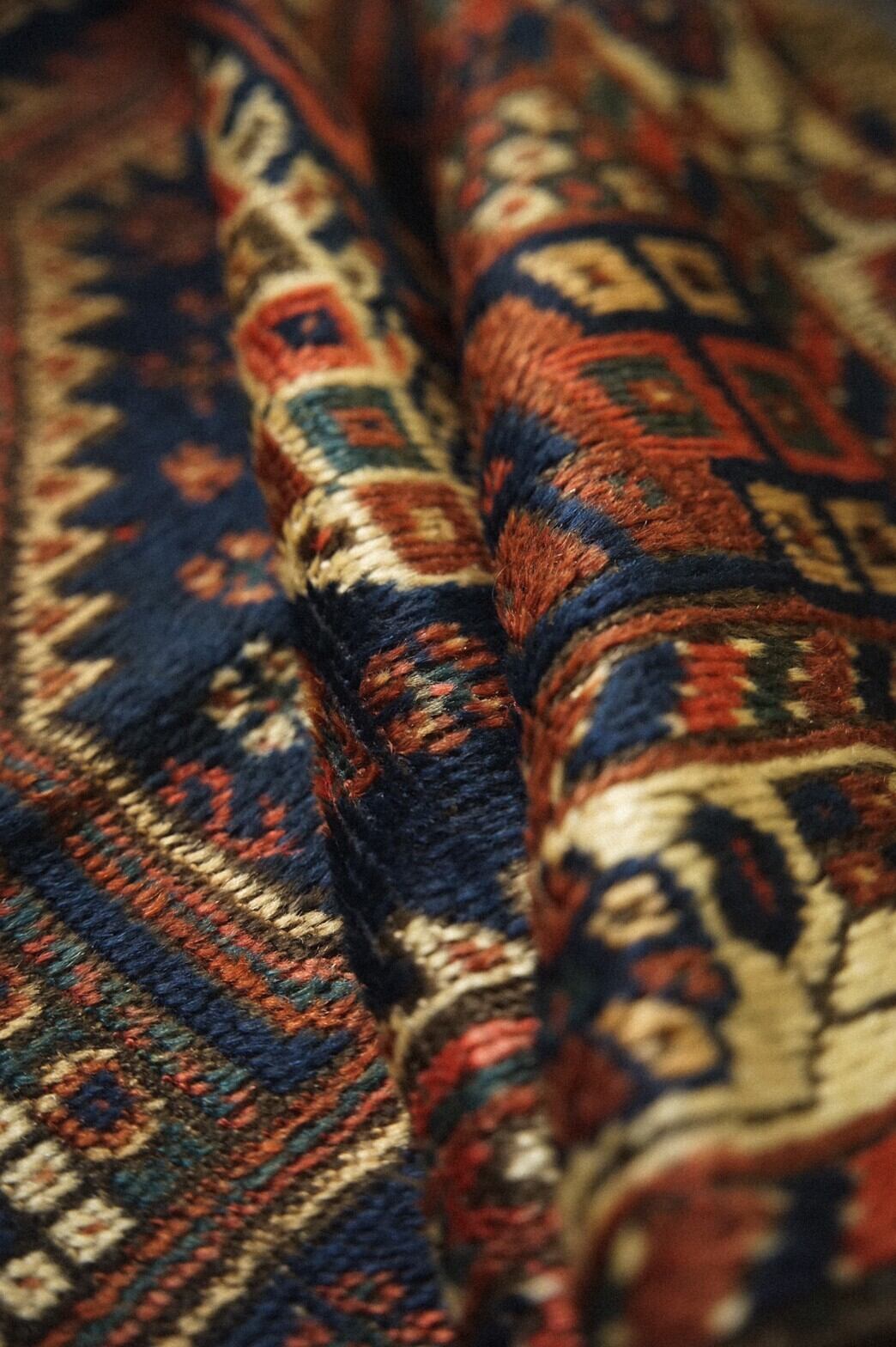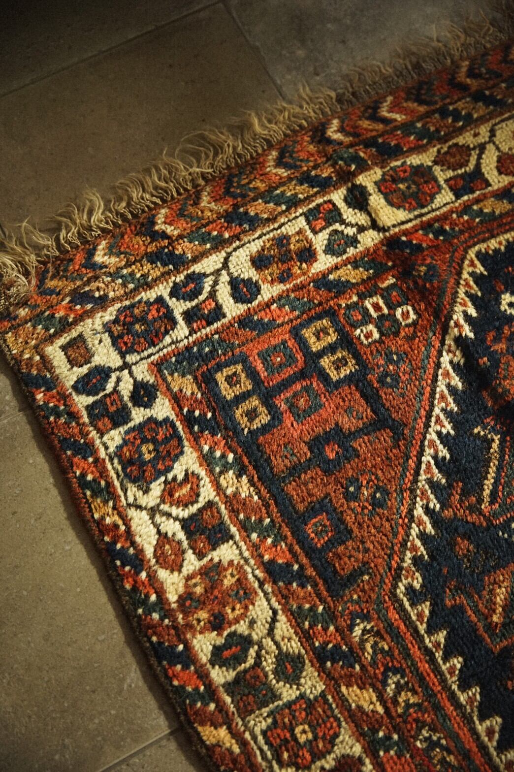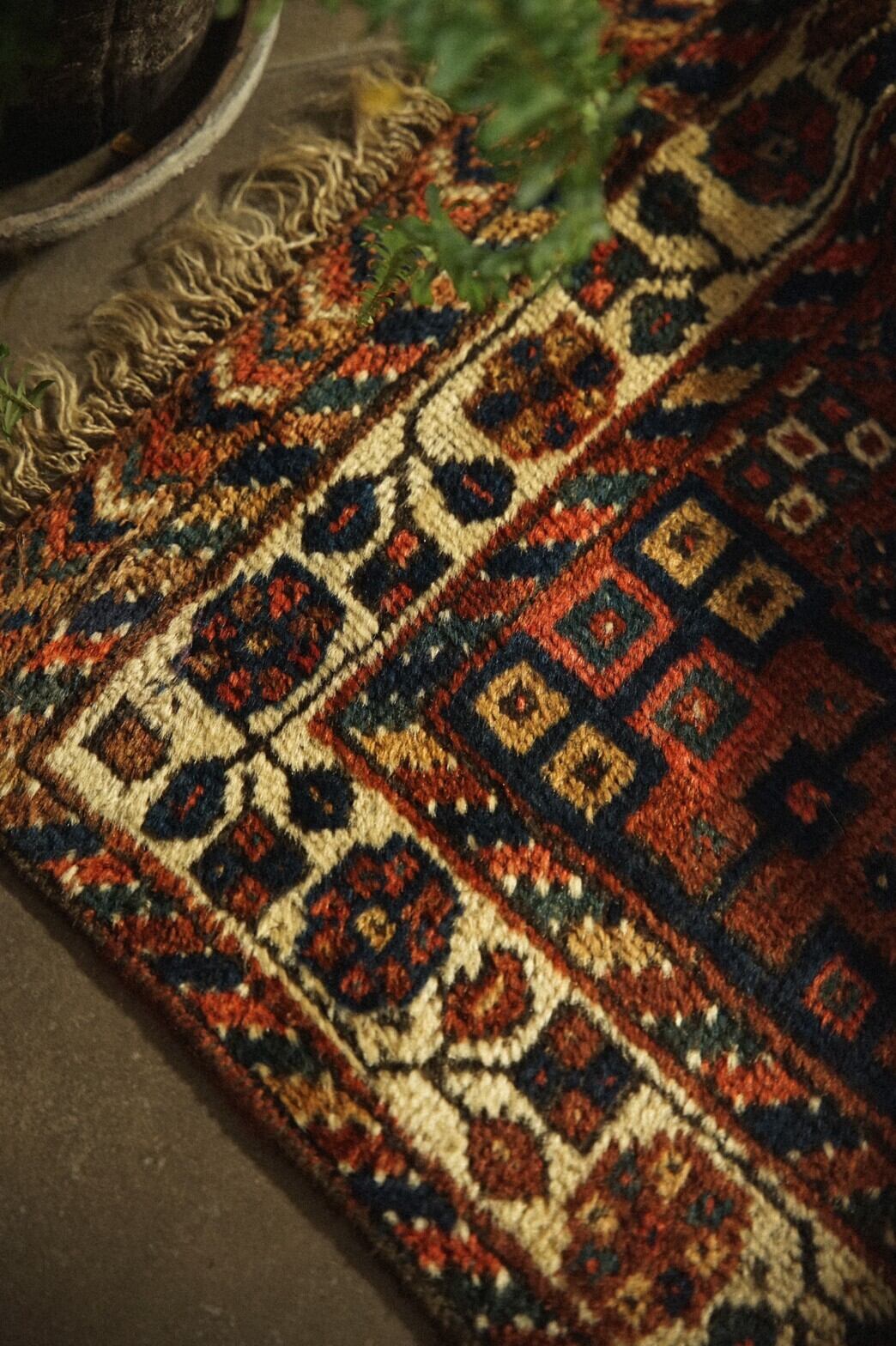 100年前のハムセ連合の稀少なアンティークラグ。ブラウンとネイビーを基調とした経年による深みのある色合いがとてもかっこいいです。ハムセラグでもあまり見たことのない珍しいデザイン。ボーダー部分には花模様。深い暗闇のようなネイビーのフィールドには鳥が描かれています。100年前のラグですが、状態は良く多少の擦れはありますが全体的にパイルはきれいに残っています。下に滑り止めをしたら床に敷いての使用も全く問題ございません。リビングやソファ前、書斎、寝室などお気に入りの場所に敷いてみてください。