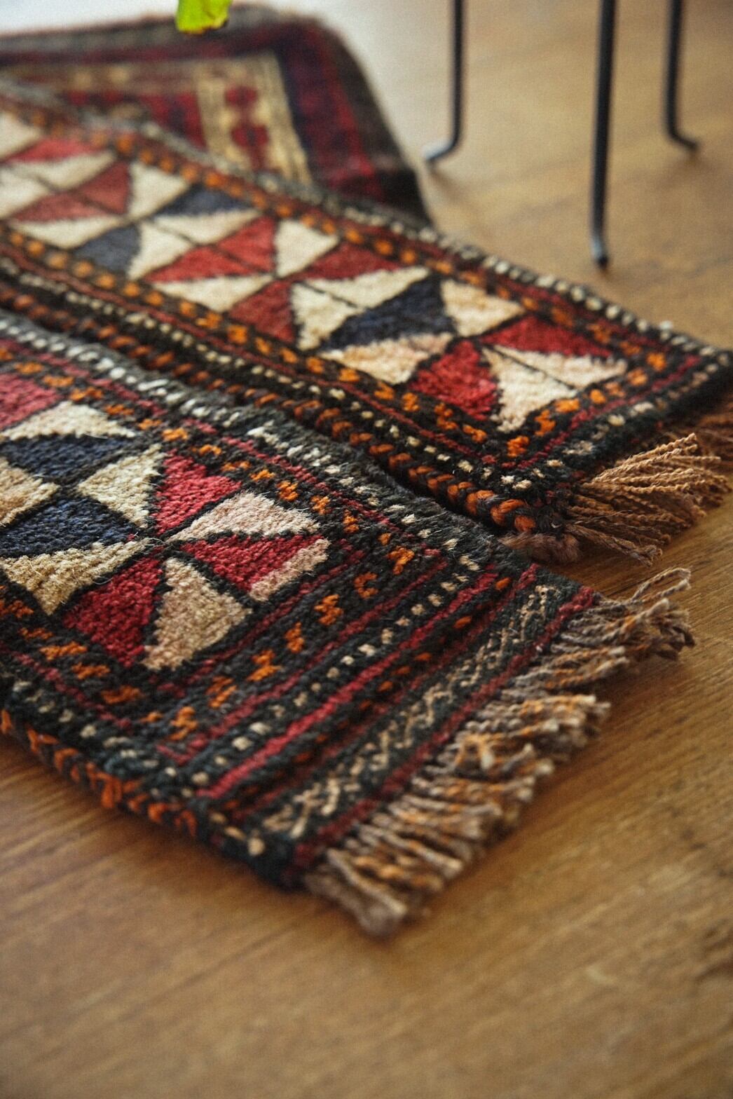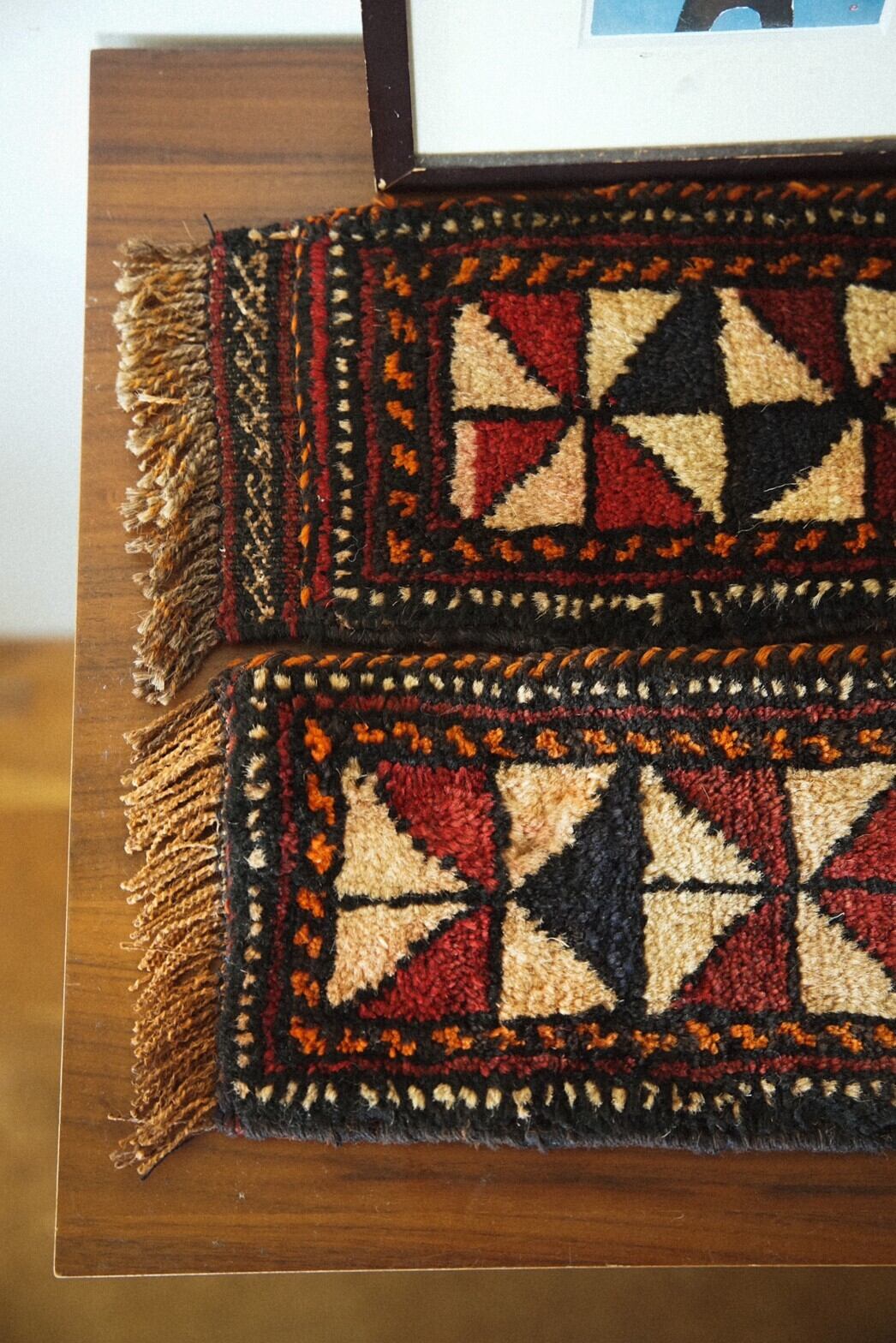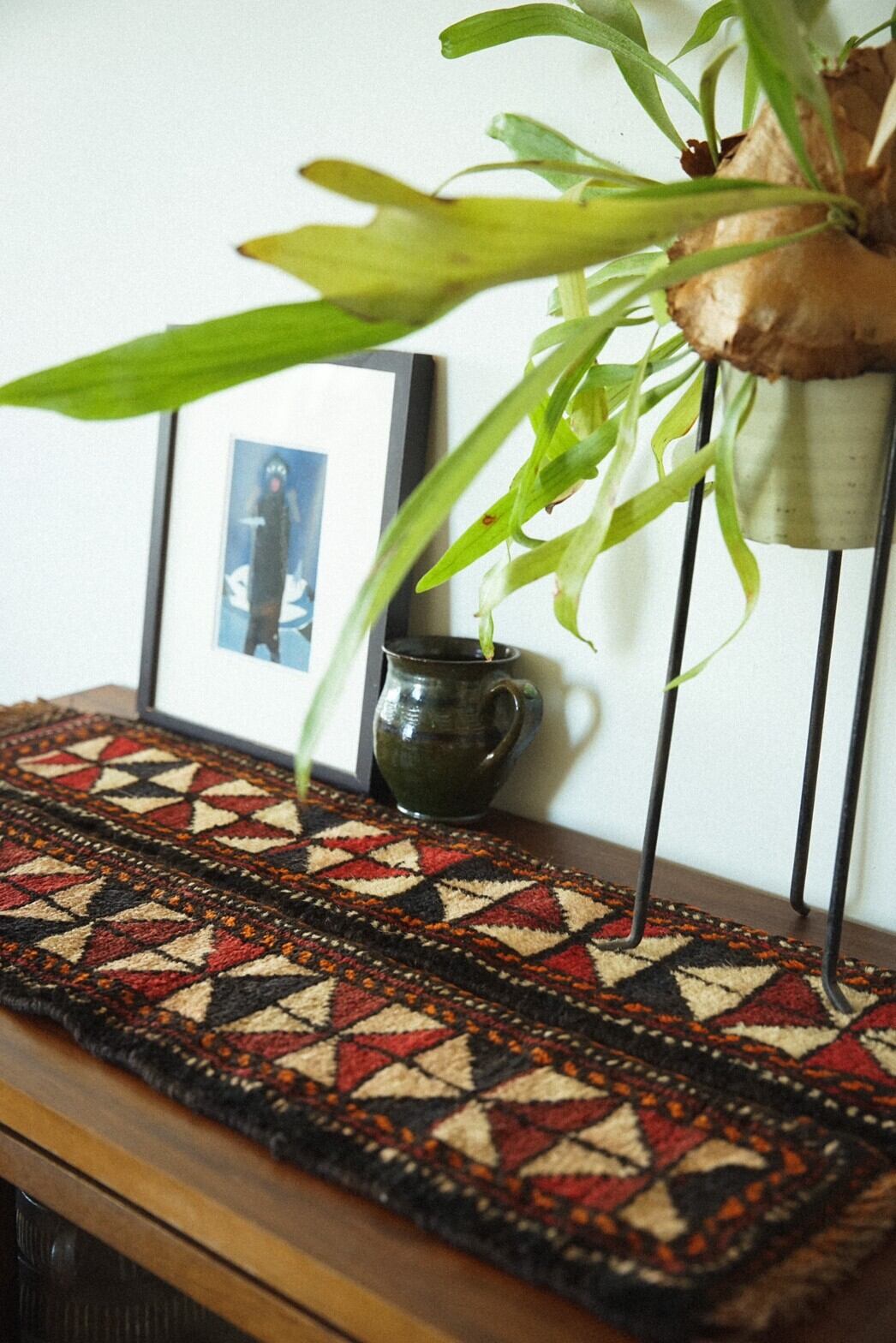 ネックバンドと呼ばれる動物用の飾りをミニラグに仕立ててもらいました。菱形の連続紋様が並ぶ色合いもとてもかわいらしい雰囲気のバルーチラグ。細長いランナータイプなので、チェストやテーブルの上、壁に飾ったり自由に楽しめるサイズ感です。ミニサイズですが、インテリアのアクセントになってくれますよ♪