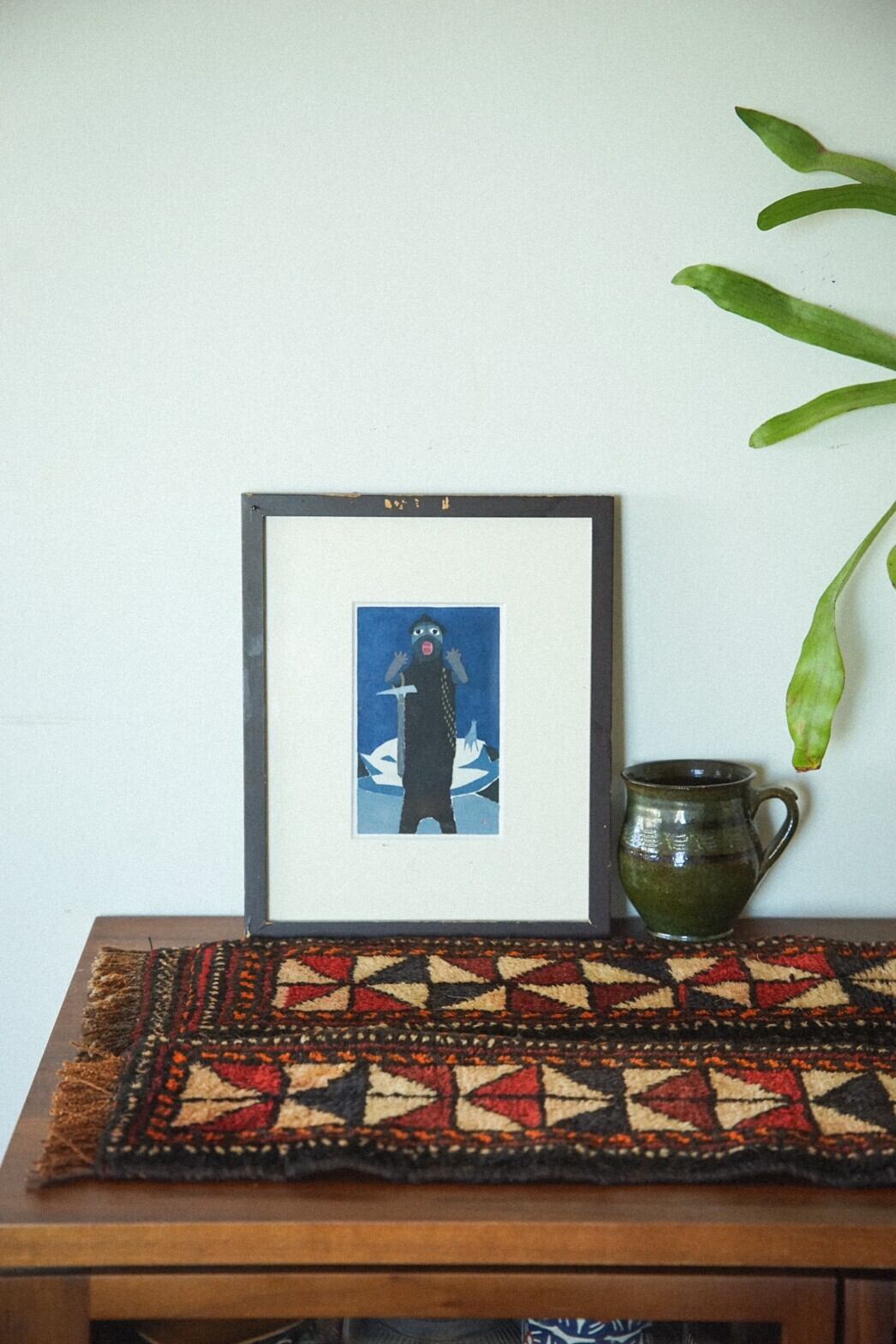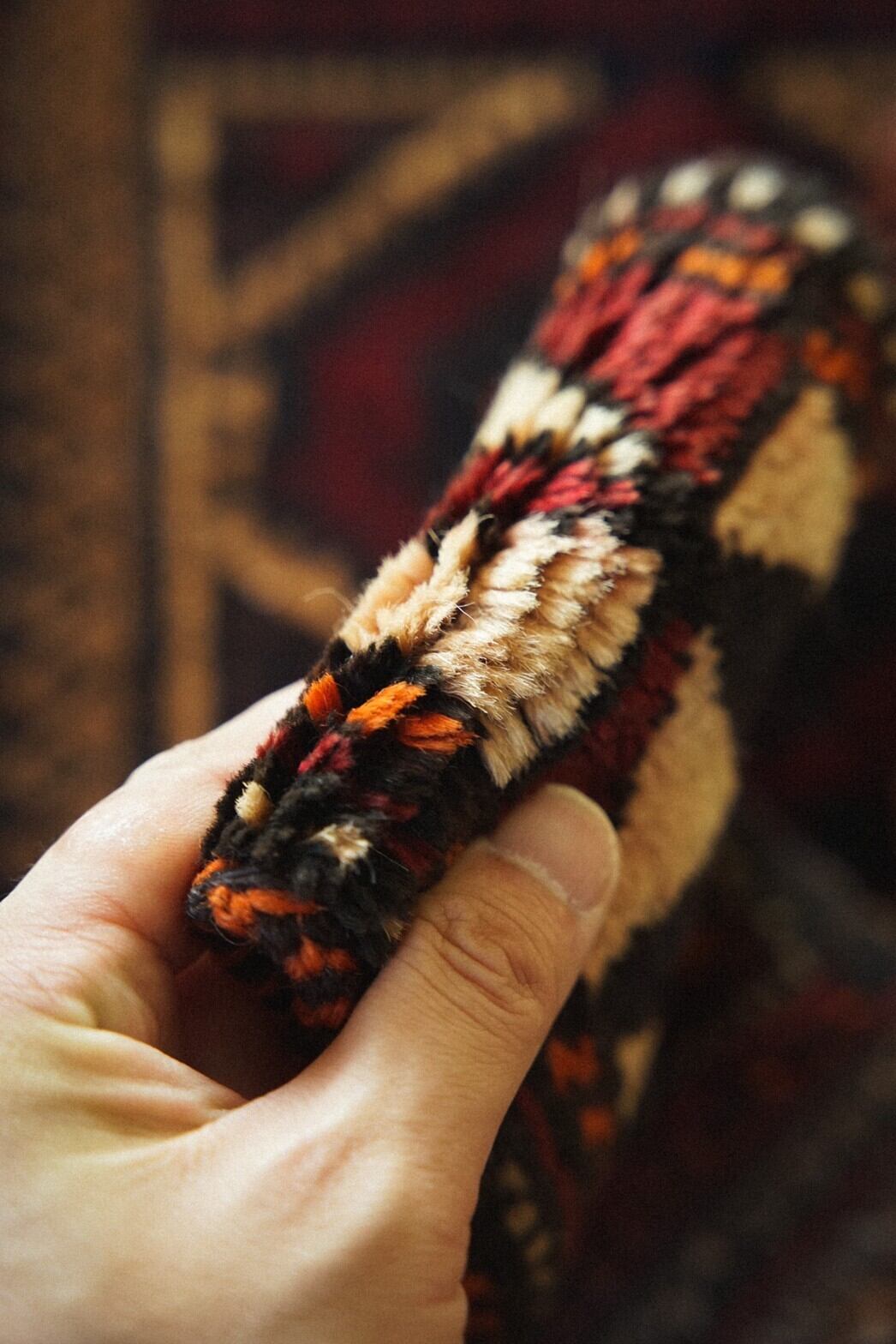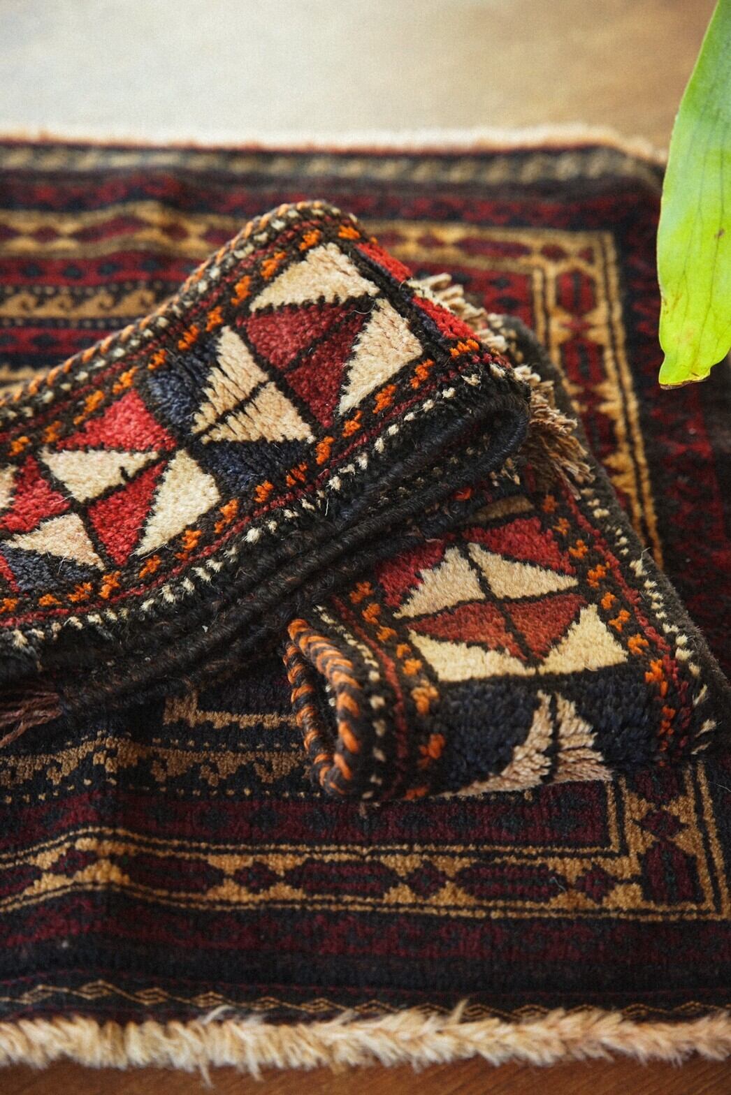 ネックバンドと呼ばれる動物用の飾りをミニラグに仕立ててもらいました。菱形の連続紋様が並ぶ色合いもとてもかわいらしい雰囲気のバルーチラグ。細長いランナータイプなので、チェストやテーブルの上、壁に飾ったり自由に楽しめるサイズ感です。ミニサイズですが、インテリアのアクセントになってくれますよ♪
