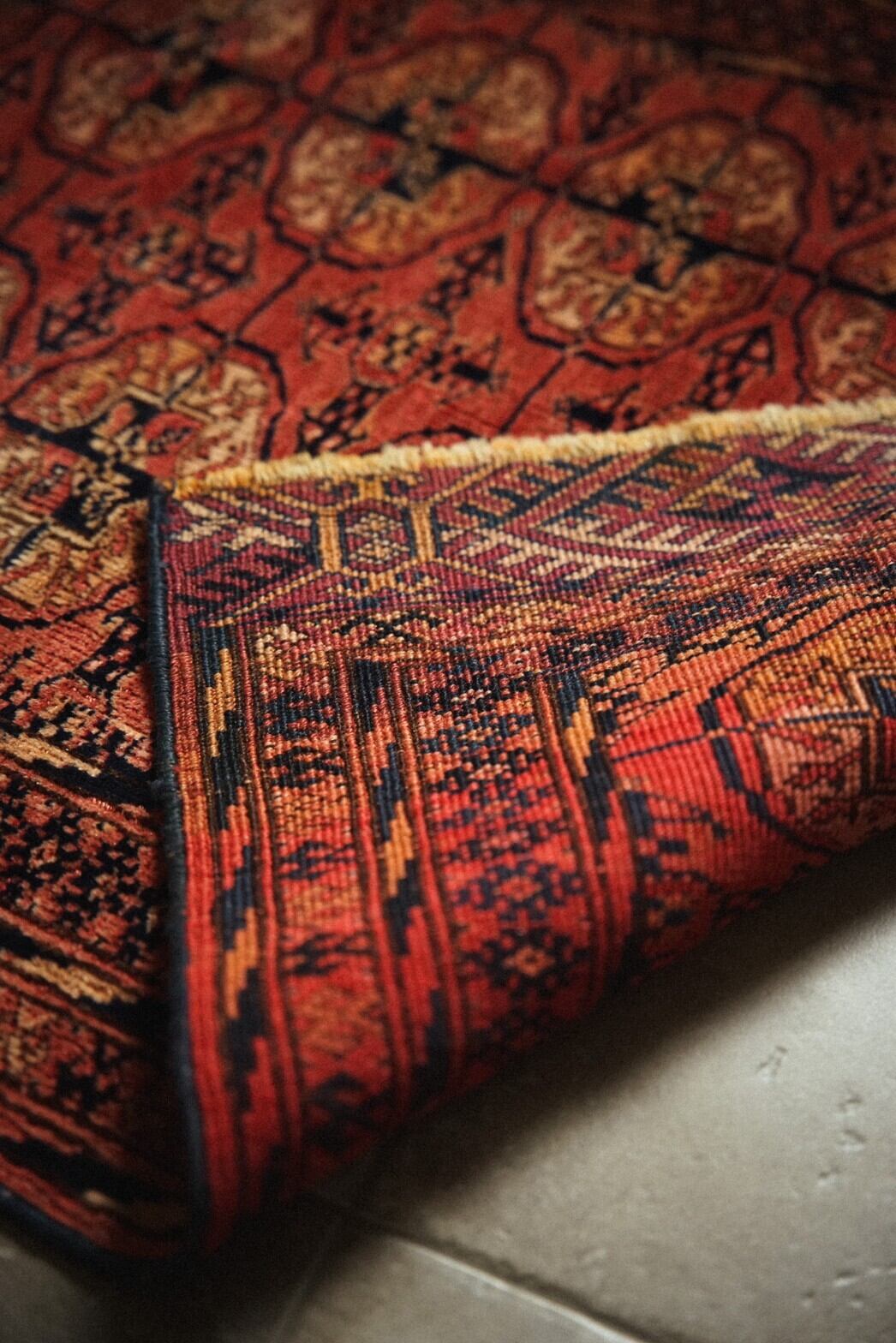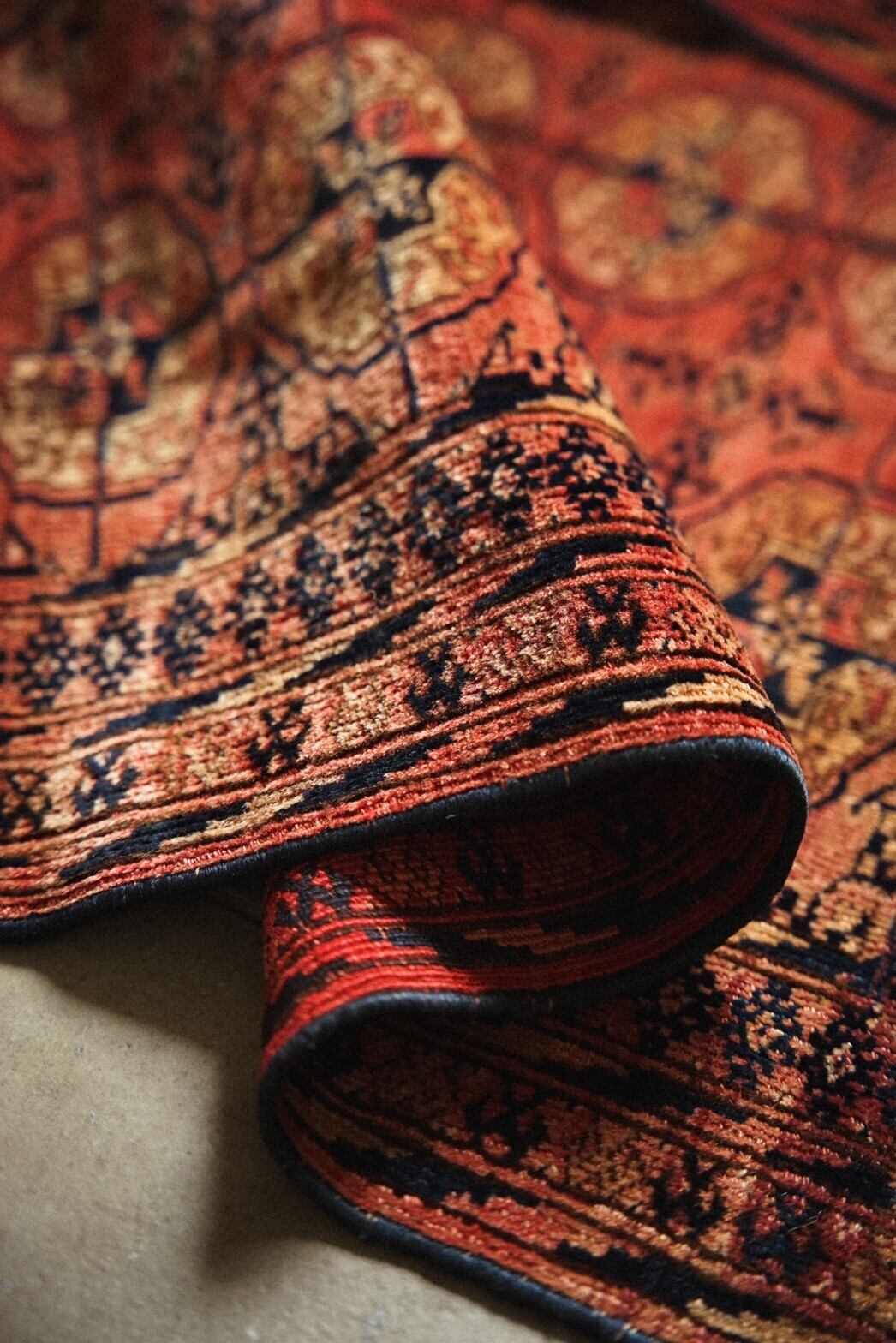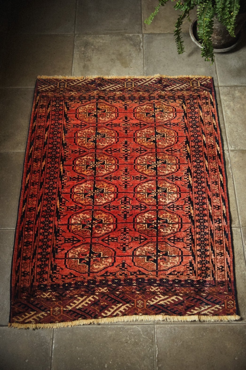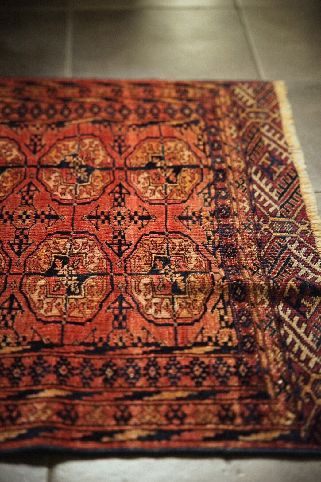100年以上前に織られたトルクメニスタン産のテッケラグ。夕日の様な優しくもあり少し儚げな色合いの茜色のフィールドに2列に並んだテッケギュル。スモールサイズながらも経年による色の変化や柔らかな手触りも楽しめる存在感のある一枚。ダメージや補修跡もなく、トルクメン族のラグならではの細かい打ち込みでとても丈夫な作り。赤いラグは意外とどんなインテリアにも馴染んでくれますよ。お気に入りの場所にぜひ♪
