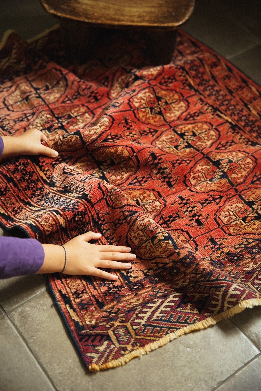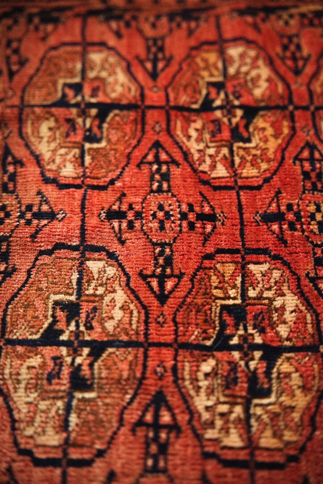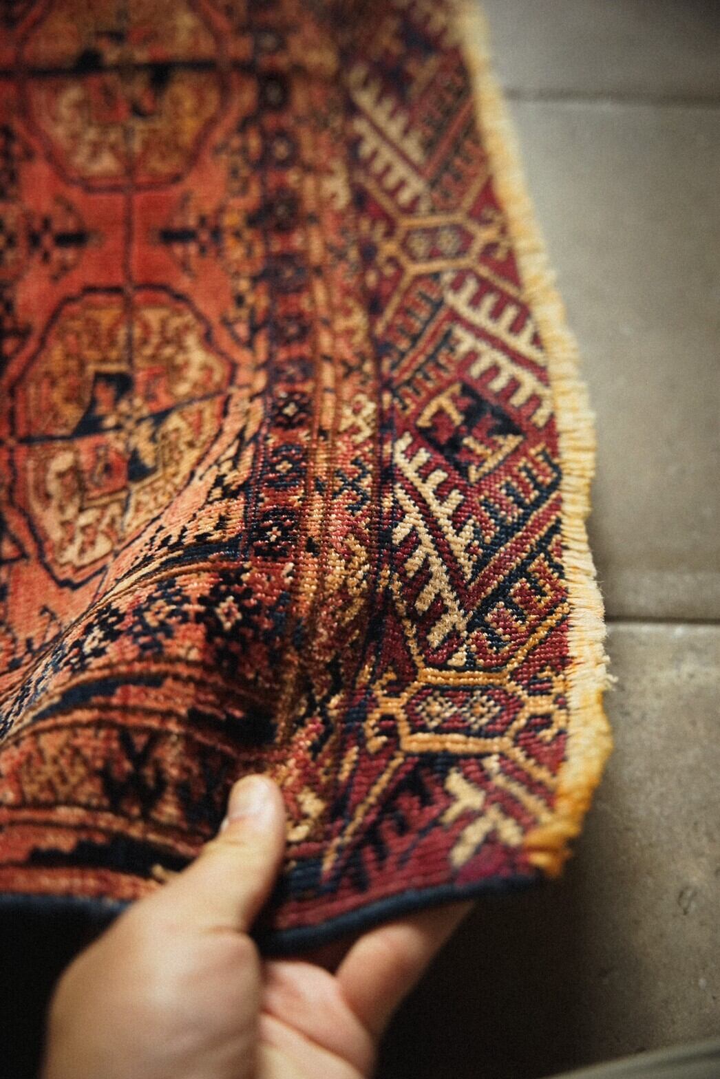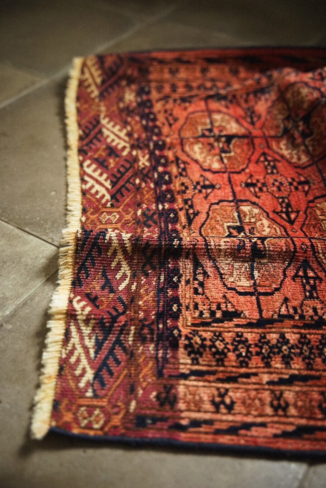 100年以上前に織られたトルクメニスタン産のテッケラグ。夕日の様な優しくもあり少し儚げな色合いの茜色のフィールドに2列に並んだテッケギュル。スモールサイズながらも経年による色の変化や柔らかな手触りも楽しめる存在感のある一枚。ダメージや補修跡もなく、トルクメン族のラグならではの細かい打ち込みでとても丈夫な作り。赤いラグは意外とどんなインテリアにも馴染んでくれますよ。お気に入りの場所にぜひ♪