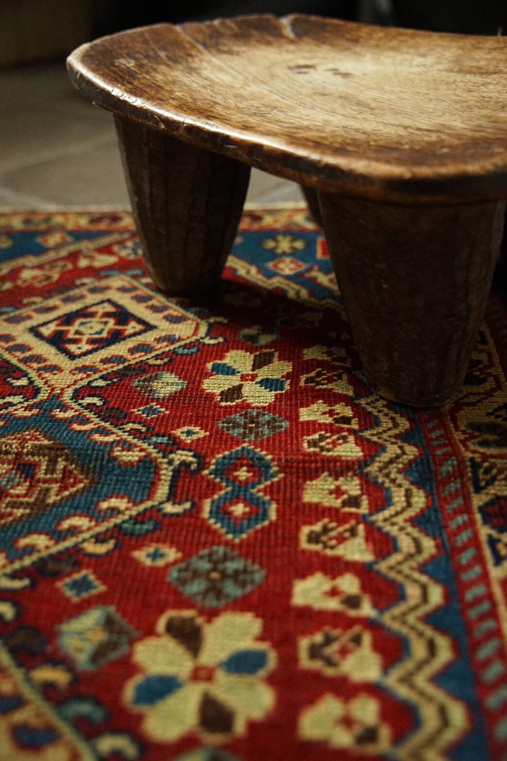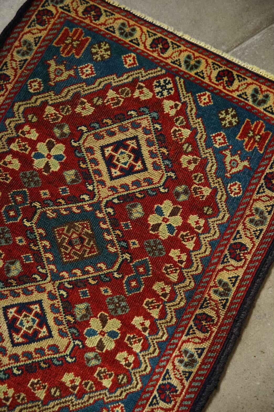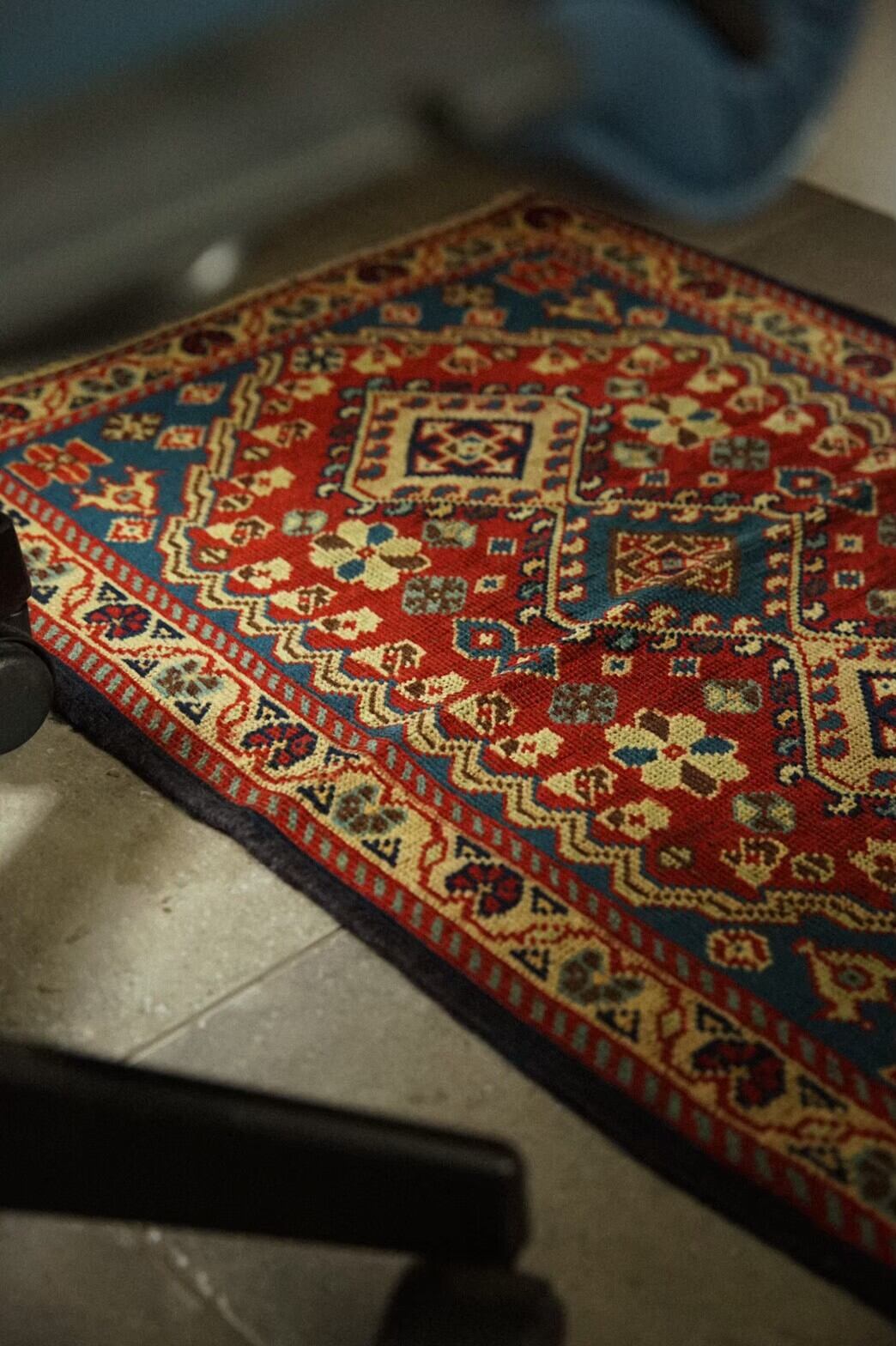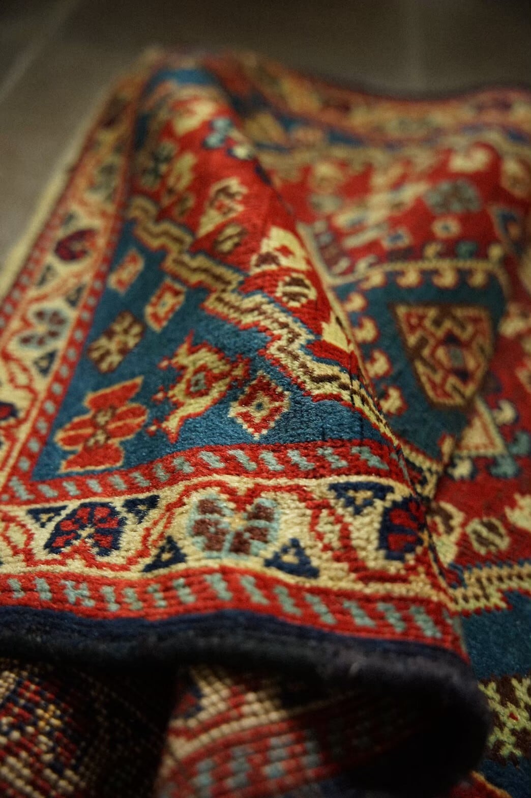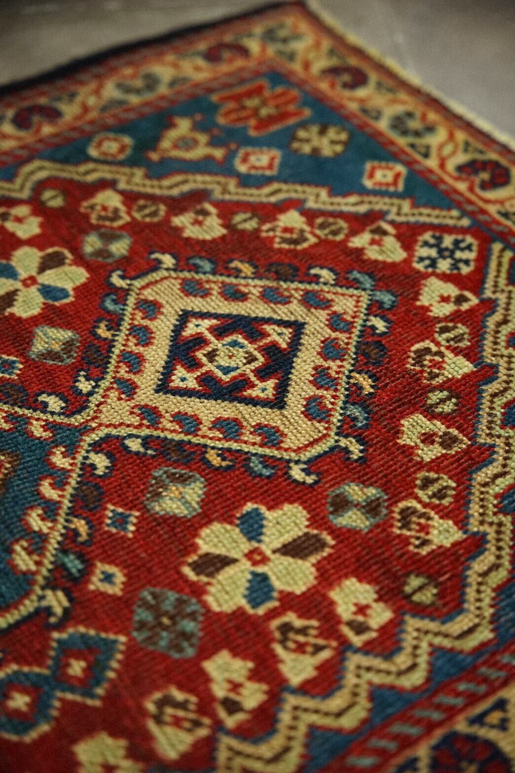 赤と青のコントラストが美しいヤラメラグ。経年によって生まれた深みの増した味わいある色味。ヴィンテージやアンティーク家具、日本の伝統的なデザインの民藝品との相性もとても良さそうです。全体散りばめられた小花柄が癒しをくれます。パイルは短めの薄手ですが、とても柔らかな手触り。シンプルでモダンな雰囲気のインテリアがお好みの方にもこの手仕事ならではの温もりを感じるアイテムをぜひ取り入れてみてほしいです。