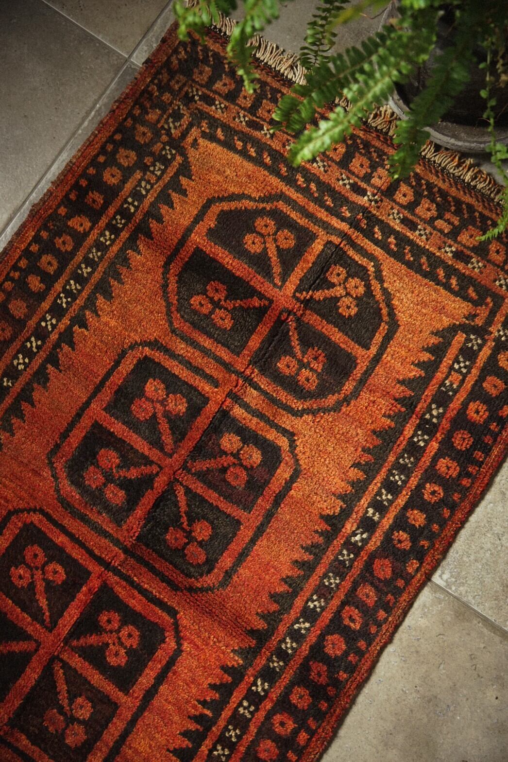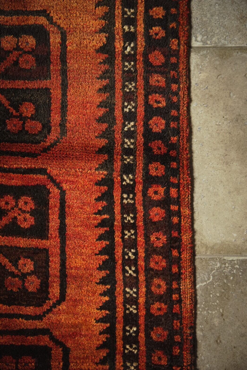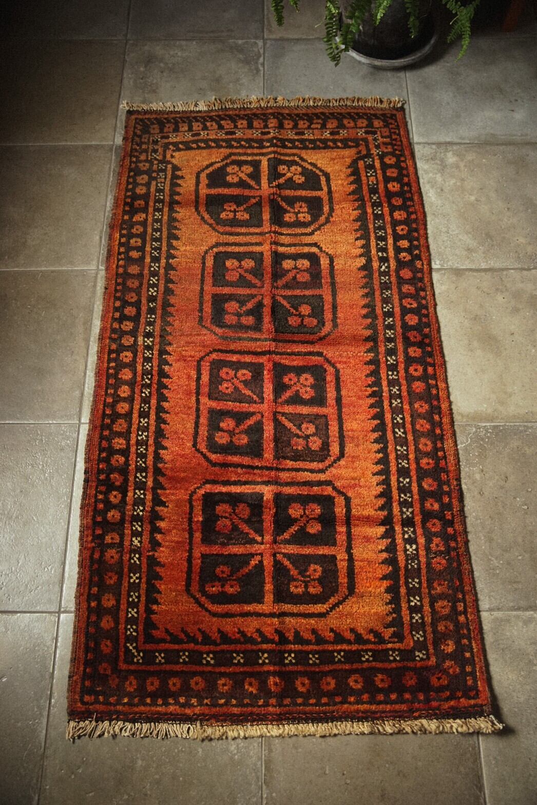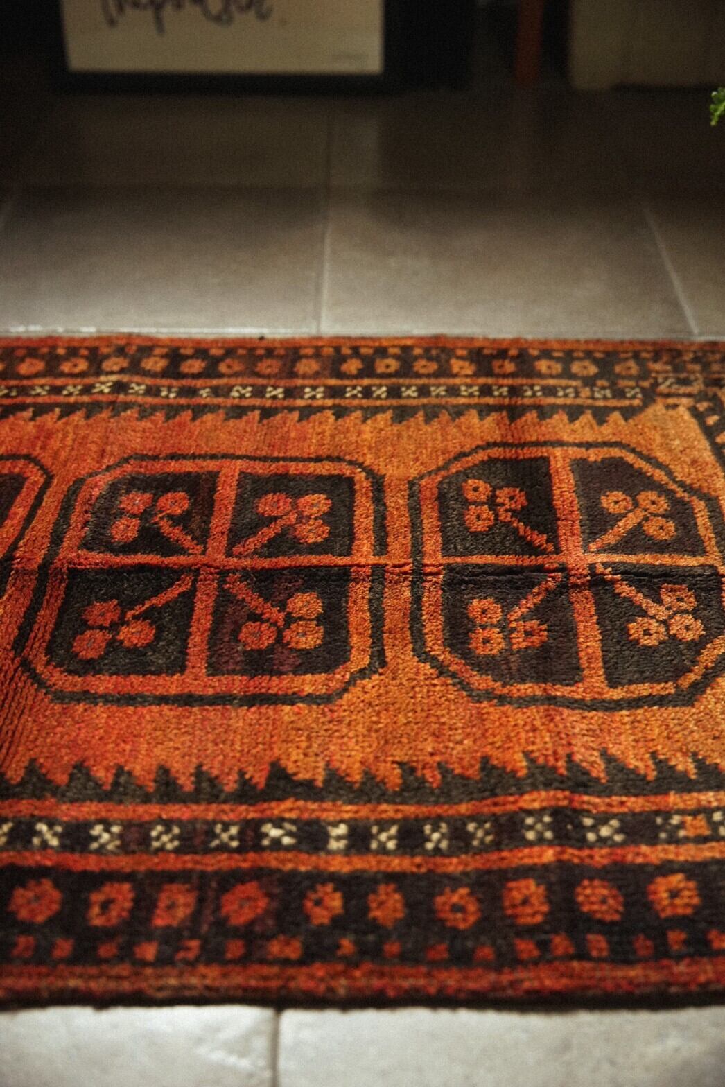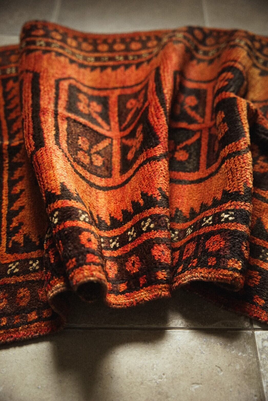 美しい光を放つ夕日のような色合いのラグ。フカフカと厚みがあり、手で撫でるしっとりと気持ちの良い手触り。素足で乗って頂きたい一枚です。トルクメンのギュルに似ていますが、様々な部族が混在しているエリアのため色んなデザインがミックスされているようです。ボーダー部分にたくさんの小花柄模様が並んでいて癒されますね。目立ったダメージはなくグッドコンディション。キッチンや姿見の前、玄関、ベッドサイドなど足元に暖かい一枚をお探しの方へ。