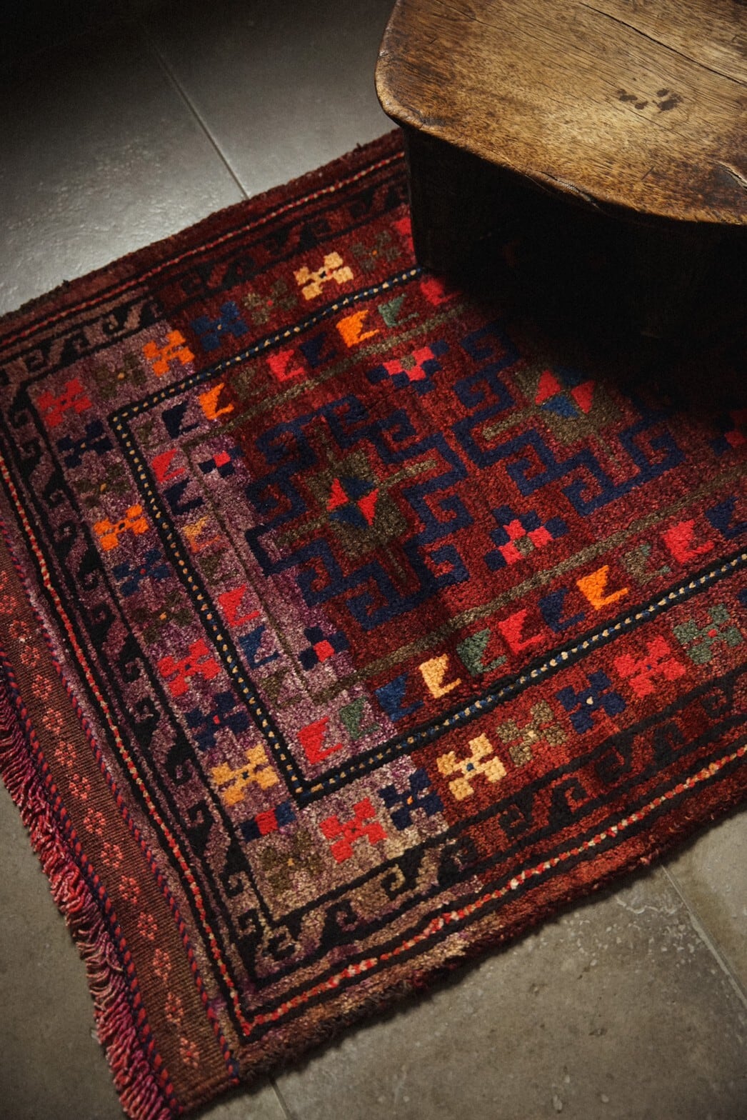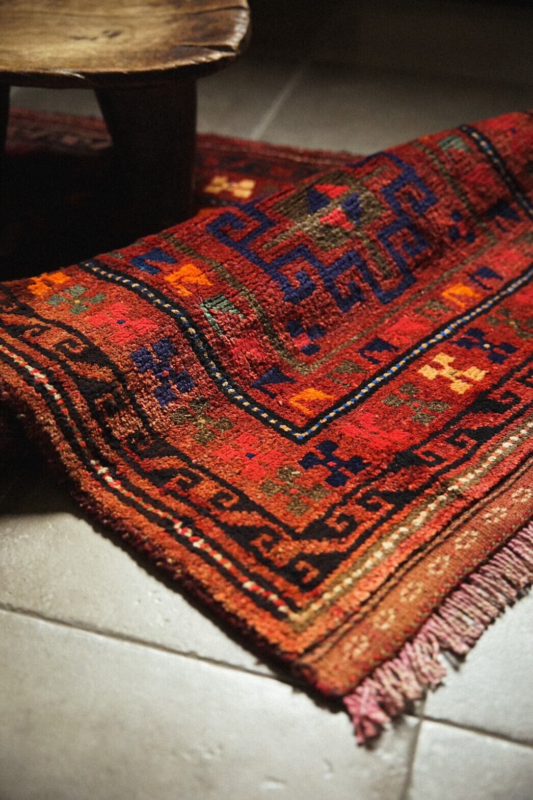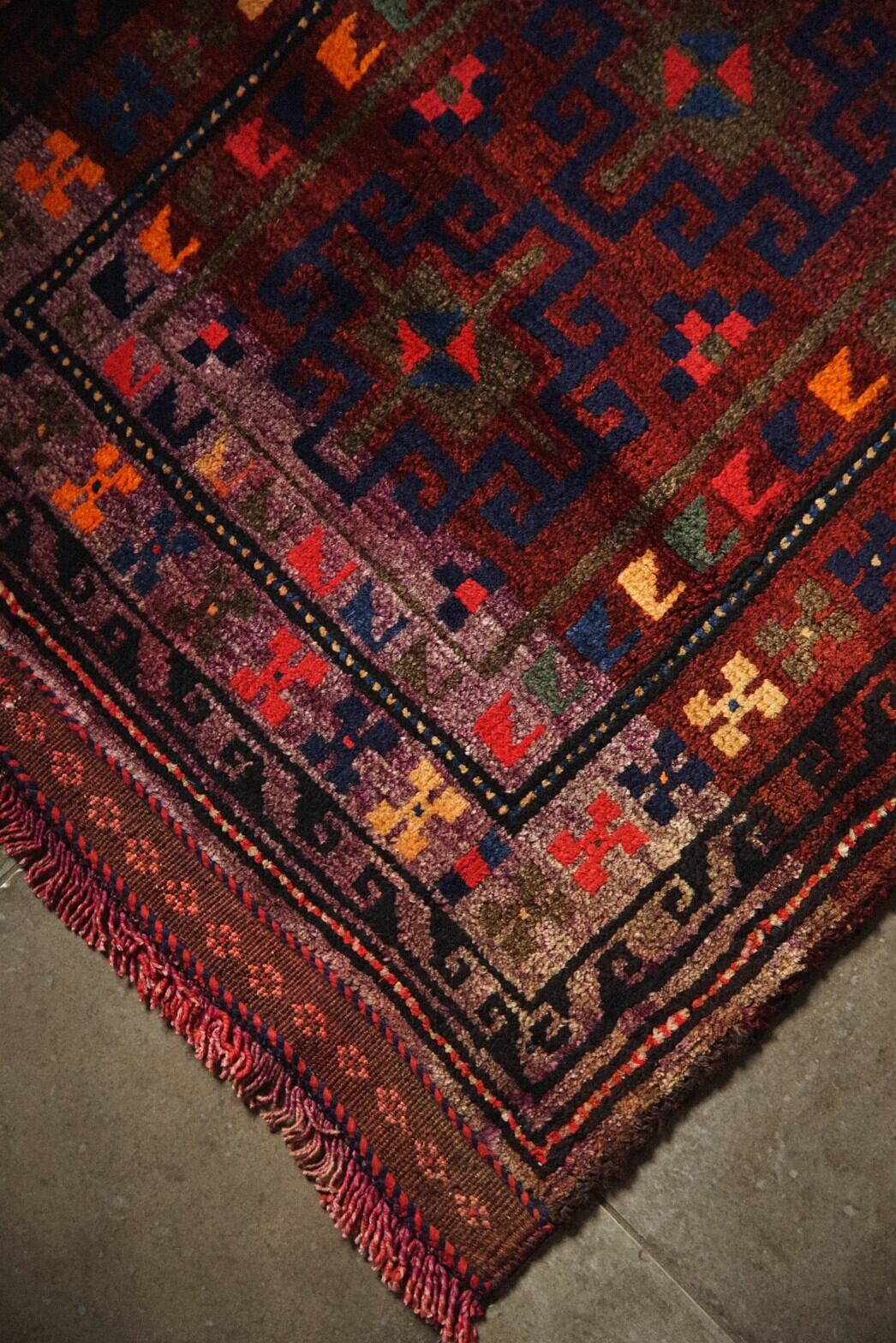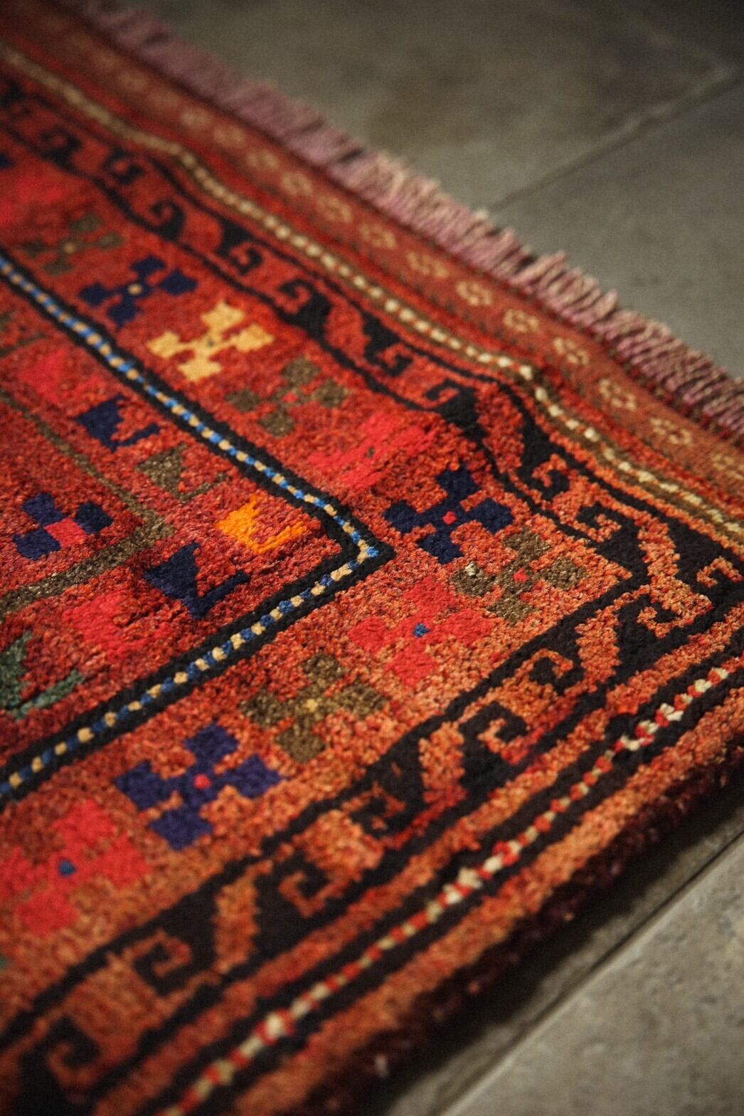 タイマニ族のバーリシトと呼ばれる袋状のものをリメイクしてラグにしてもらいました。カラフルでポップな色使いがとてもかわいらしいラグ。そしてアブラッシュと呼ばれるグラデーションで、ピンクと紫色の間の藤色のような絶妙な色合いがとても魅力的な一枚。フリンジ部分はキリムエンド。程よい厚みもあり、パイルはきれいに残っています。とても可愛くてみるだけでほのぼのするタイマニラグ。いつも目に入るお気に入りの場所にどうぞ♪
