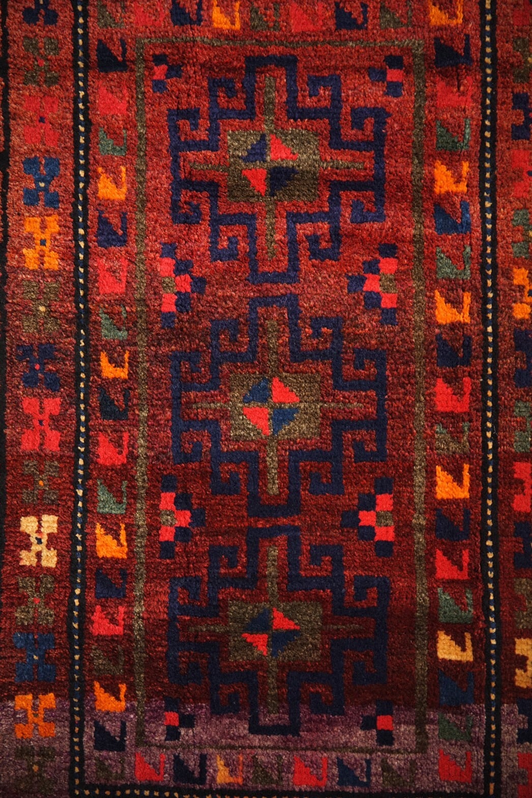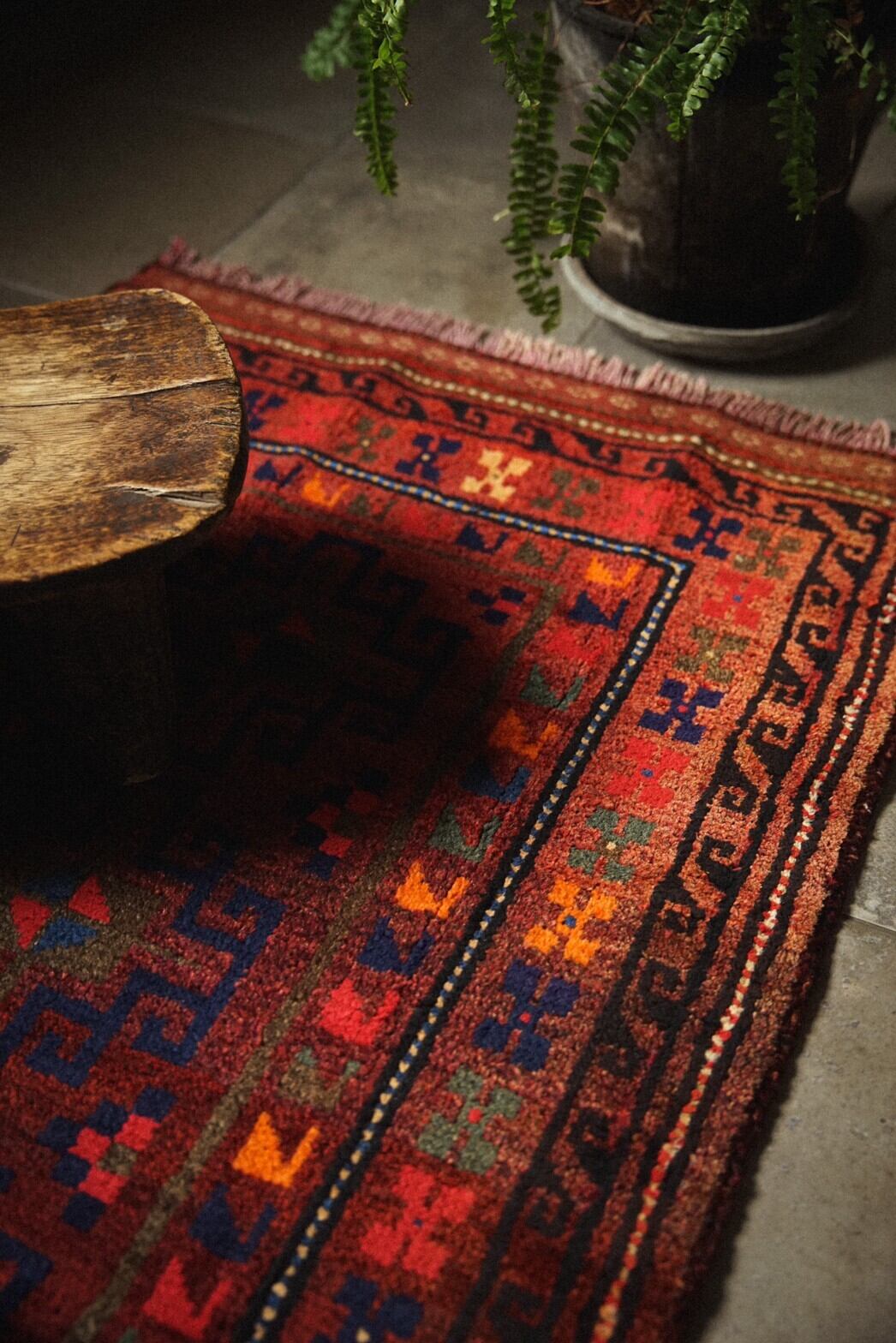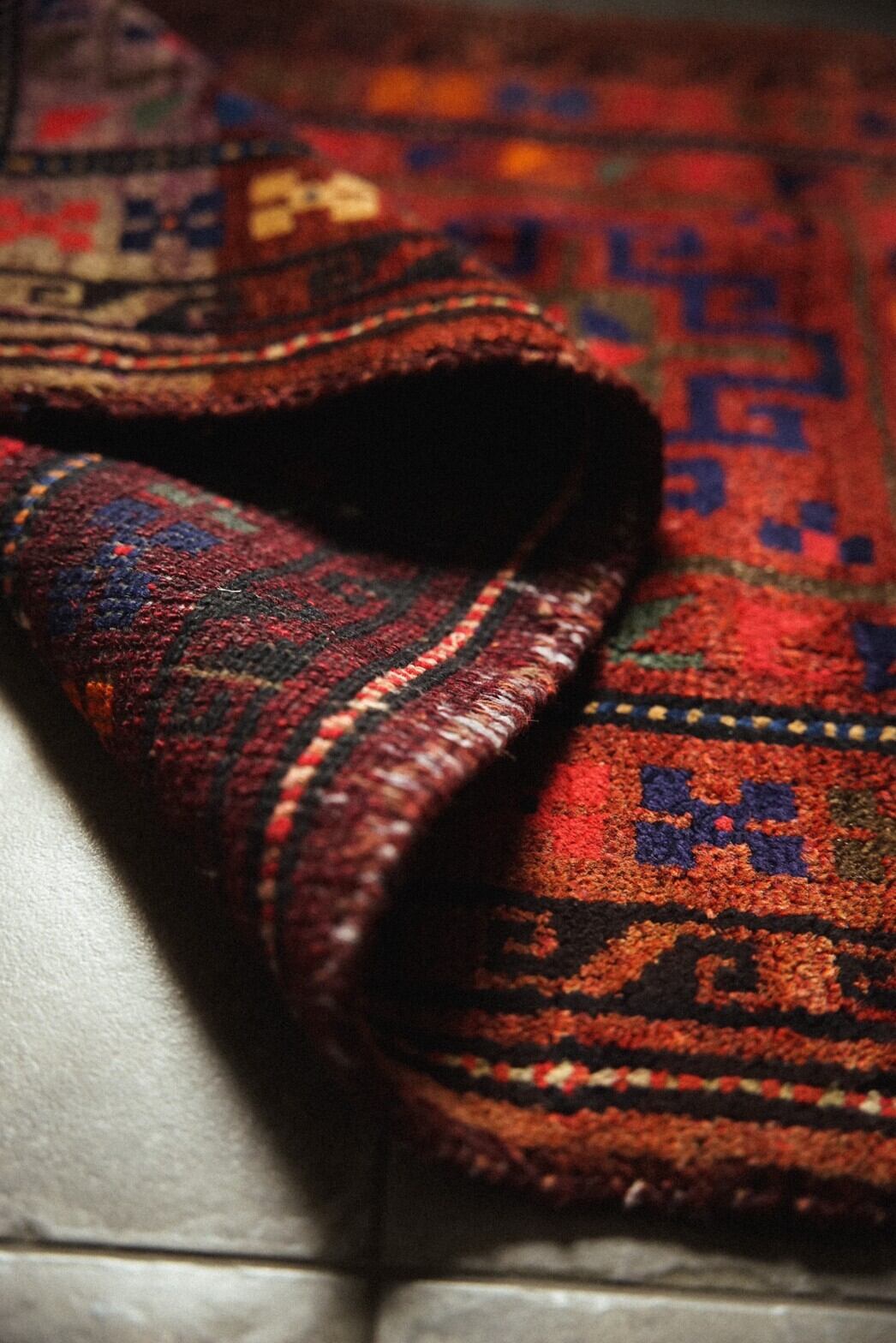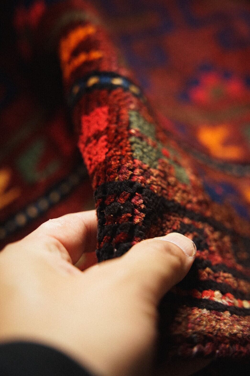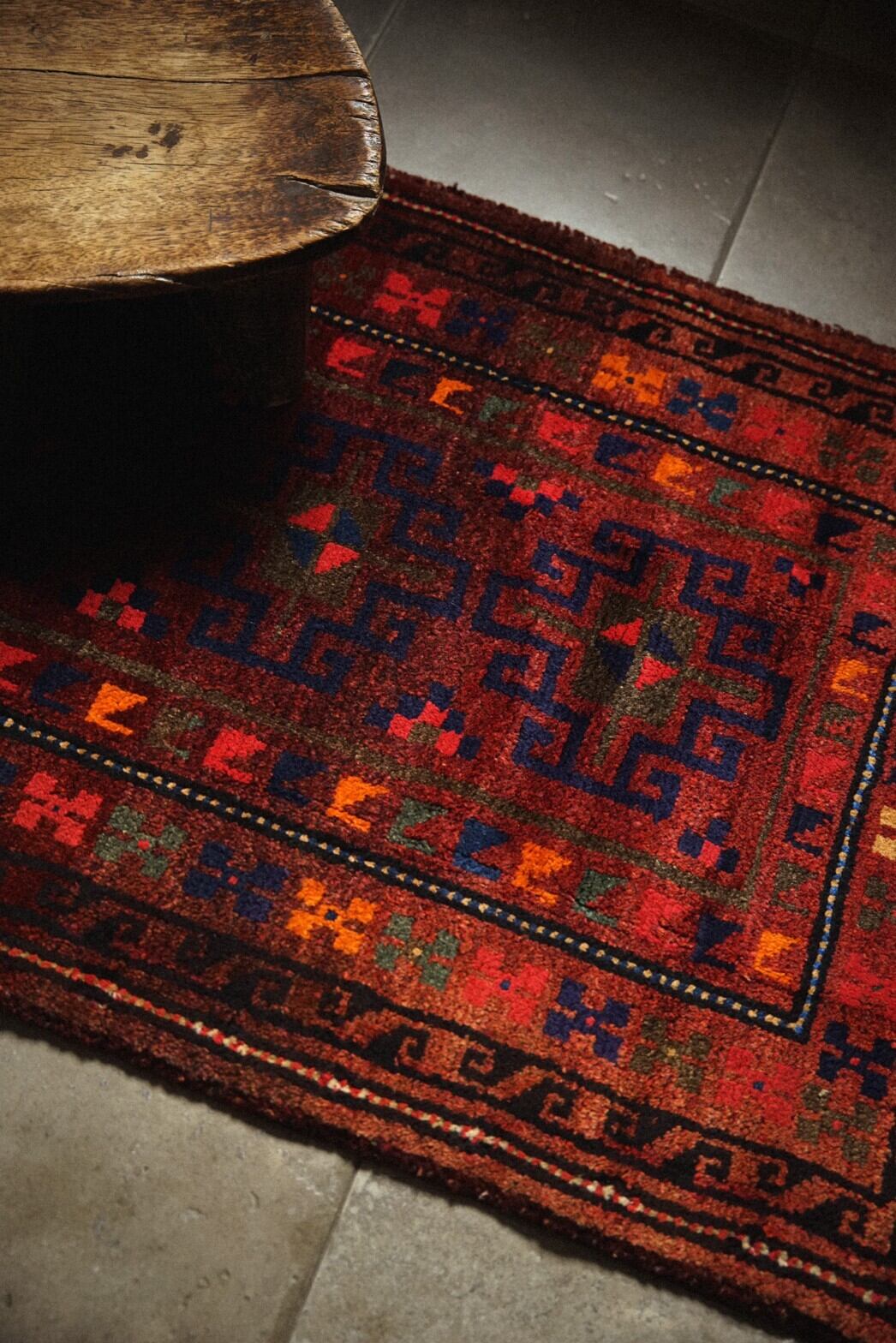 タイマニ族のバーリシトと呼ばれる袋状のものをリメイクしてラグにしてもらいました。カラフルでポップな色使いがとてもかわいらしいラグ。そしてアブラッシュと呼ばれるグラデーションで、ピンクと紫色の間の藤色のような絶妙な色合いがとても魅力的な一枚。フリンジ部分はキリムエンド。程よい厚みもあり、パイルはきれいに残っています。とても可愛くてみるだけでほのぼのするタイマニラグ。いつも目に入るお気に入りの場所にどうぞ♪