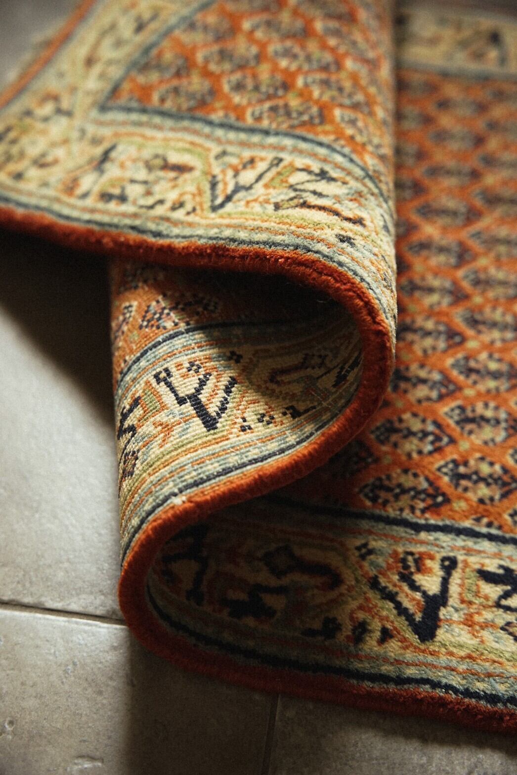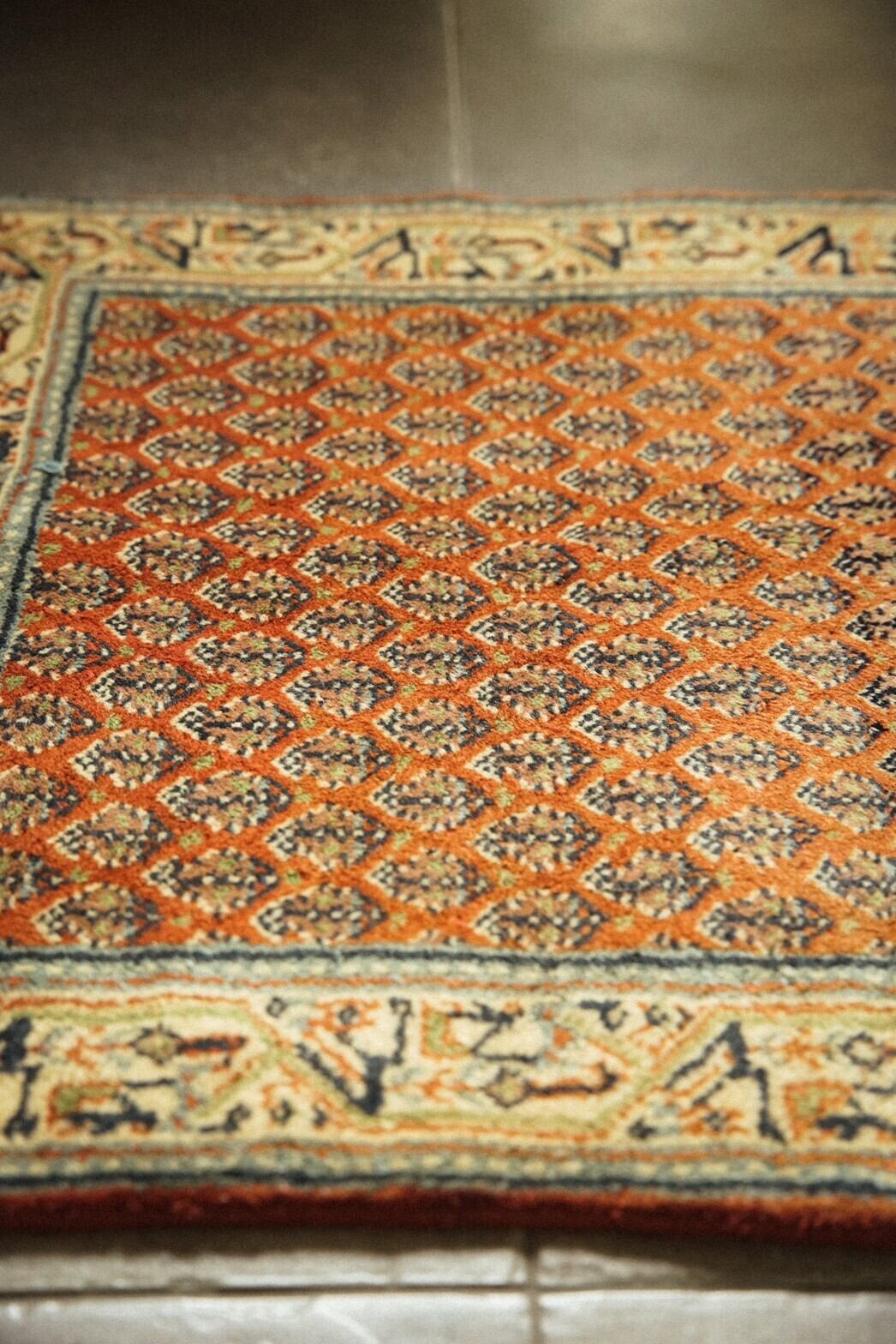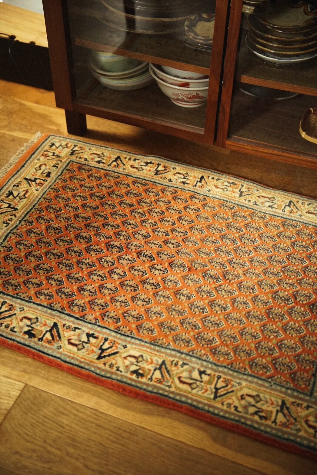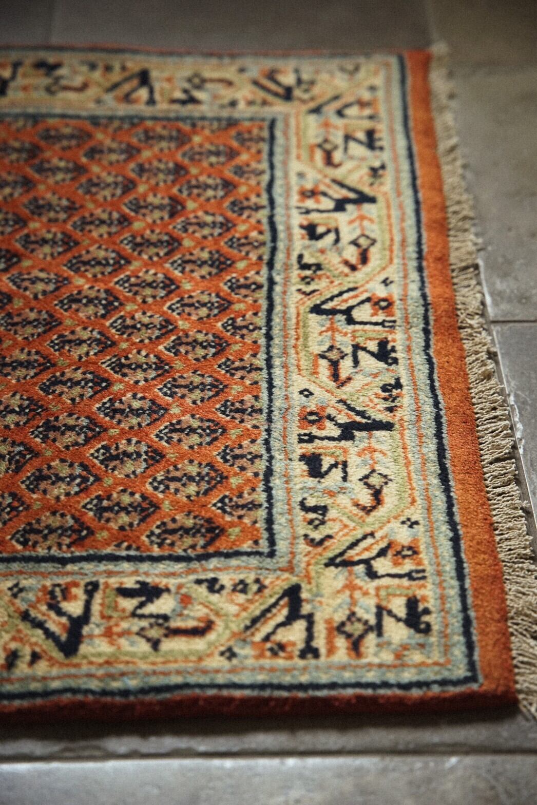ペルシャ絨毯の産地として有名なカシャーン産のミニラグ。高密度で厚みがあり、とても丈夫な作りで小さいながらもとても存在感があります。色合いはコーラル系のオレンジ、アイボリーを中心とした優しい色合い。ダメージや補修跡はなくコンディションは良好。素足で乗っても床のひんやり感は通さないので玄関やキッチン、姿見の前やベッドサイドにおすすめです。