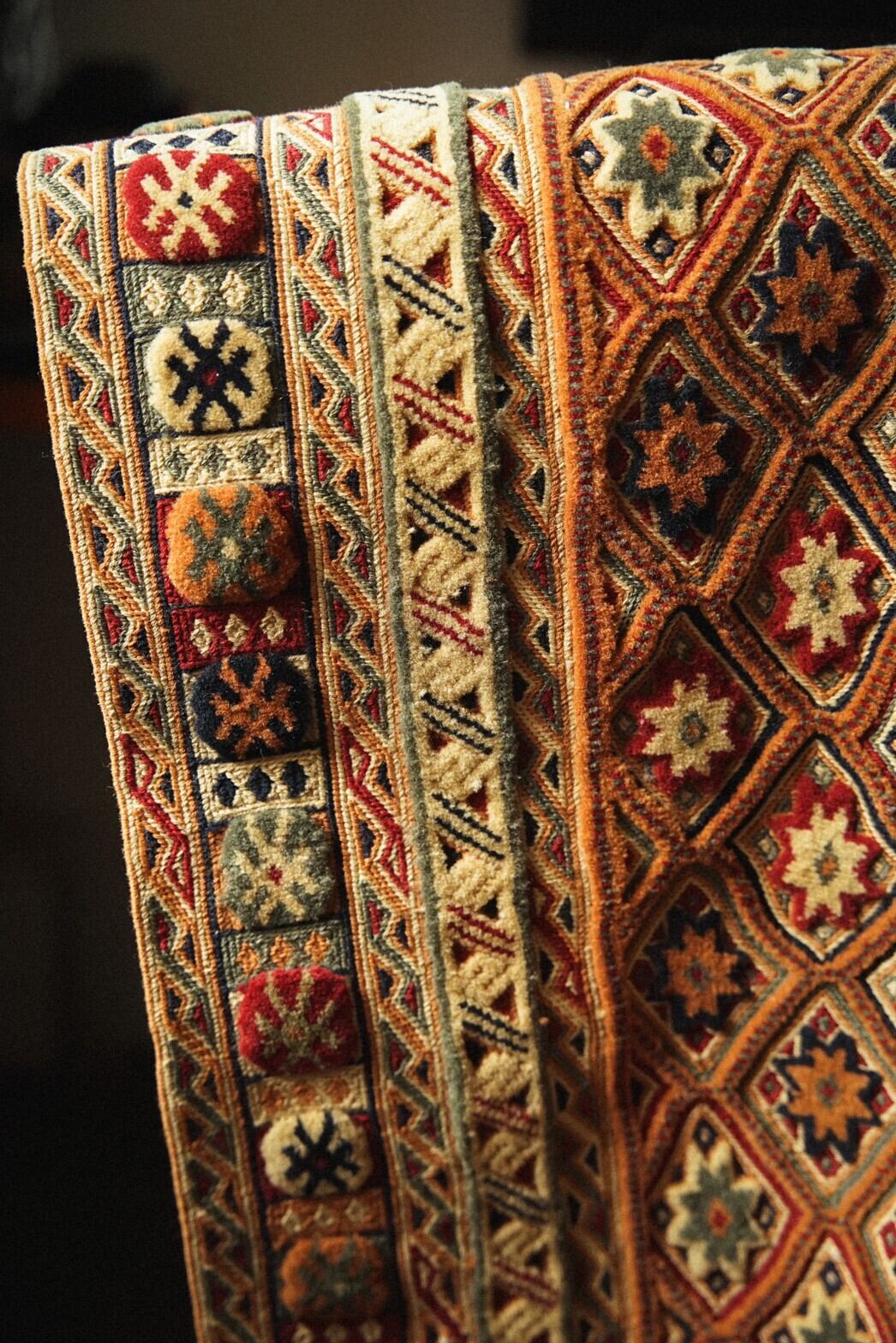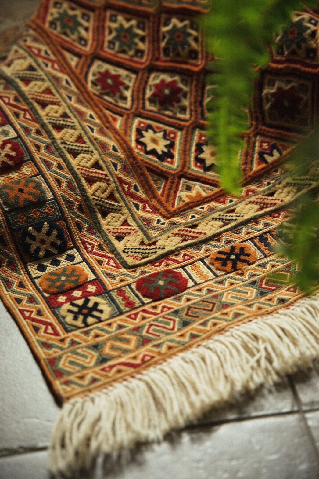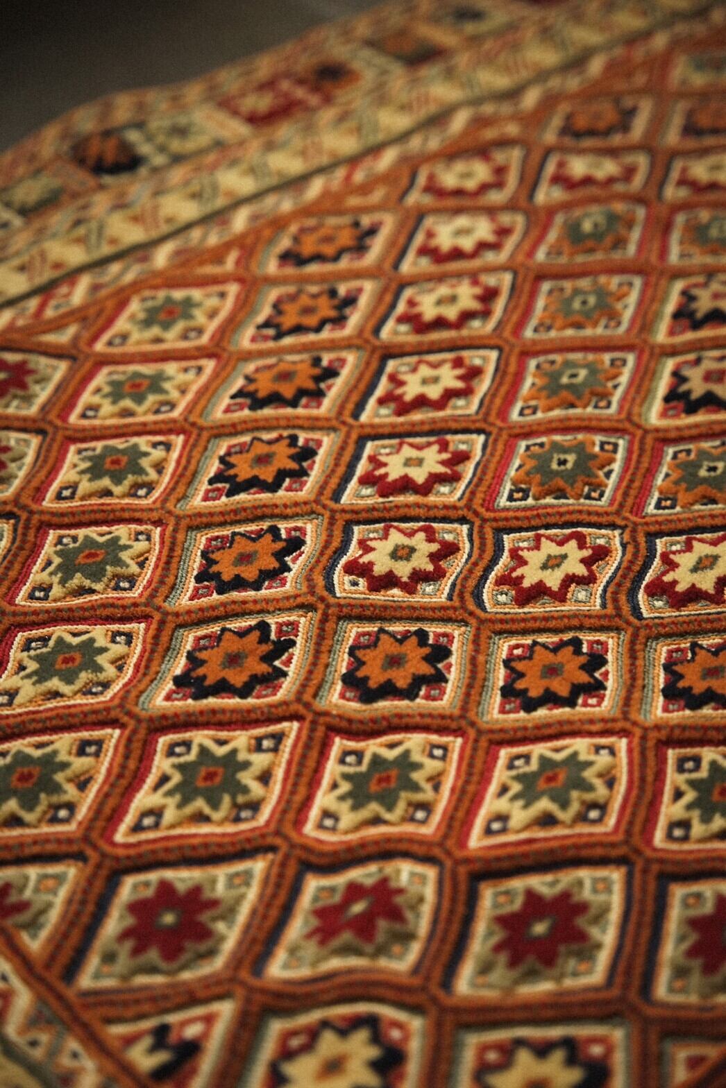 平織りとパイル織りがMIXされたポコポコとした立体感が特徴的なマシュワニラグ。イエロー、オレンジ、グリーン、レッドなどたくさんの色を使って表現された八角星がとてもかわいらしい一枚。触り心地はしっとりと滑らかですが、ラグ自体はまだ若いためハリがあります。ダメージや補修跡もなくコンディションも良好。とても丈夫な作りになっています。玄関やキッチン、姿見の前やベッドサイドにもおすすめのサイズ感です。