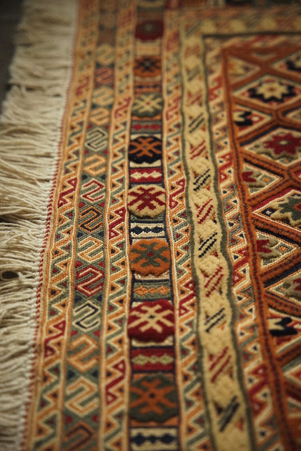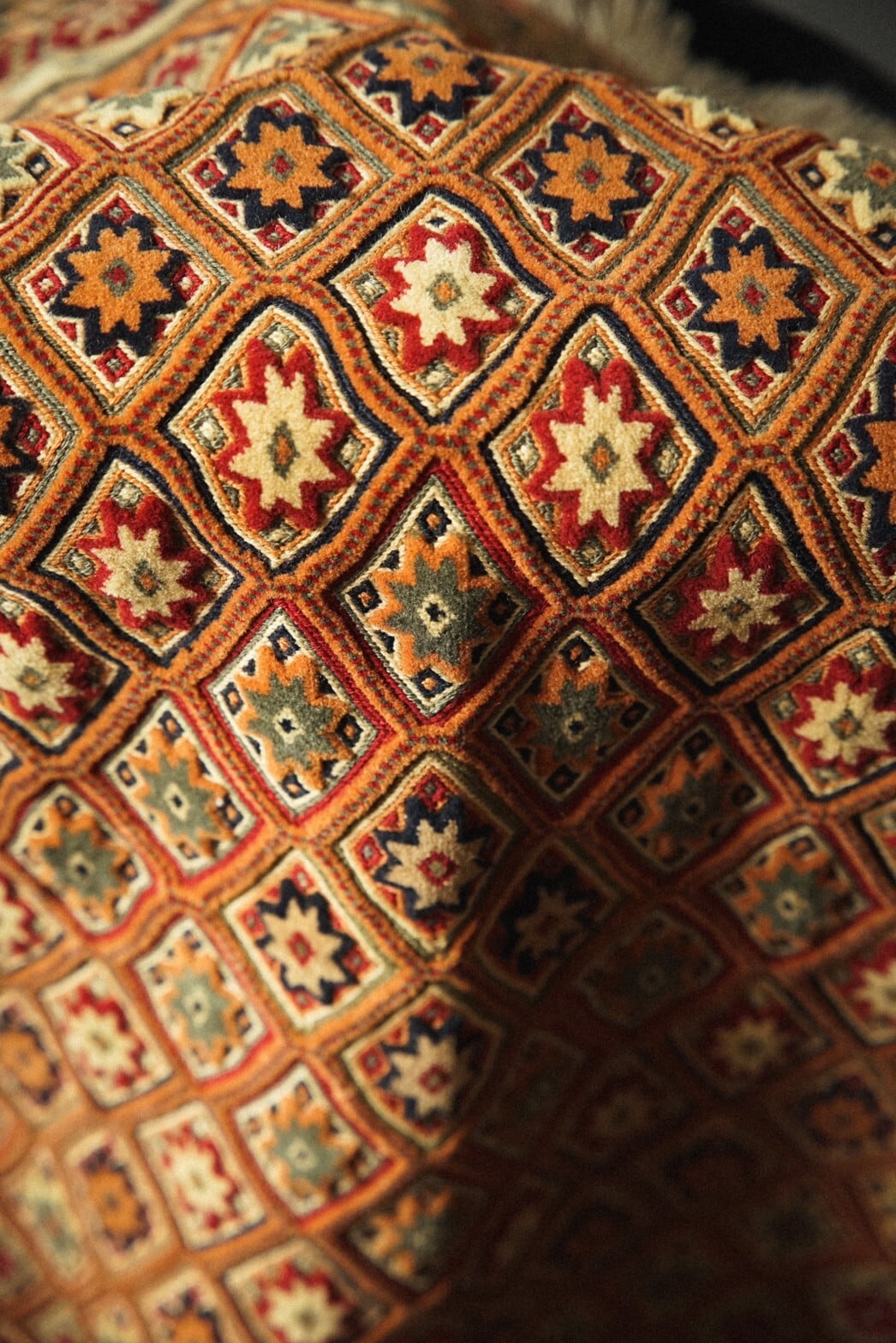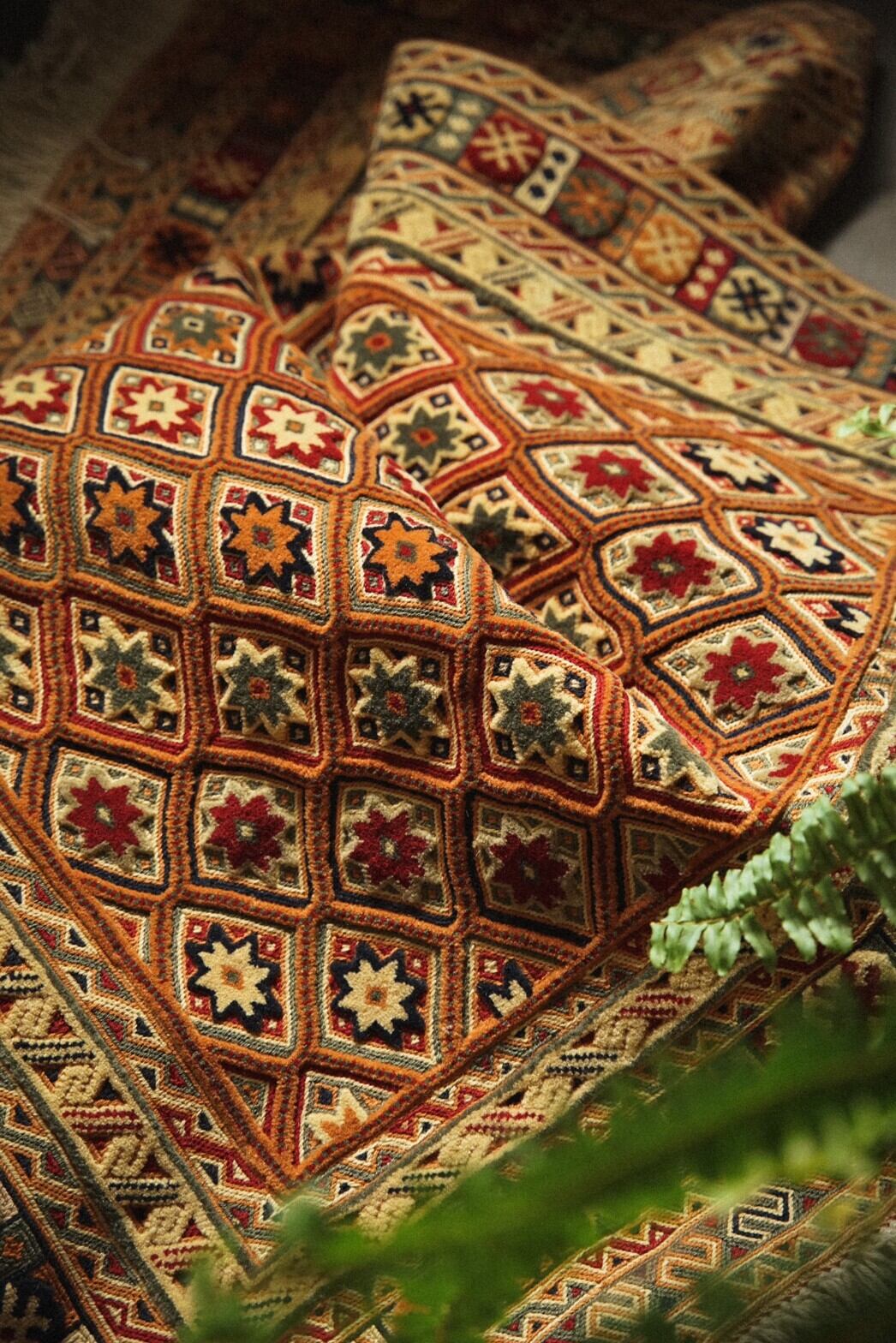 平織りとパイル織りがMIXされたポコポコとした立体感が特徴的なマシュワニラグ。イエロー、オレンジ、グリーン、レッドなどたくさんの色を使って表現された八角星がとてもかわいらしい一枚。触り心地はしっとりと滑らかですが、ラグ自体はまだ若いためハリがあります。ダメージや補修跡もなくコンディションも良好。とても丈夫な作りになっています。玄関やキッチン、姿見の前やベッドサイドにもおすすめのサイズ感です。