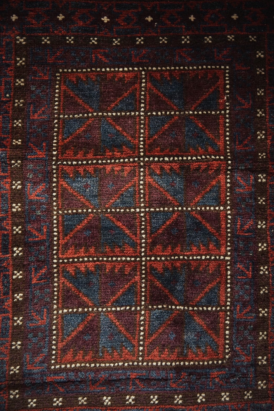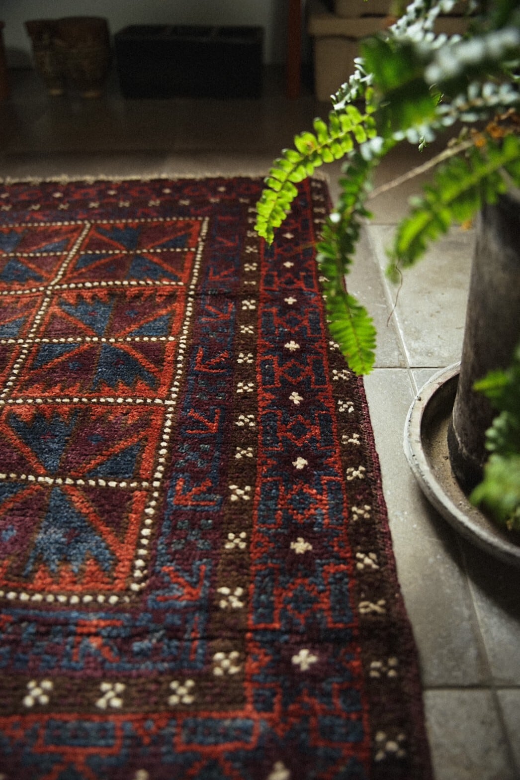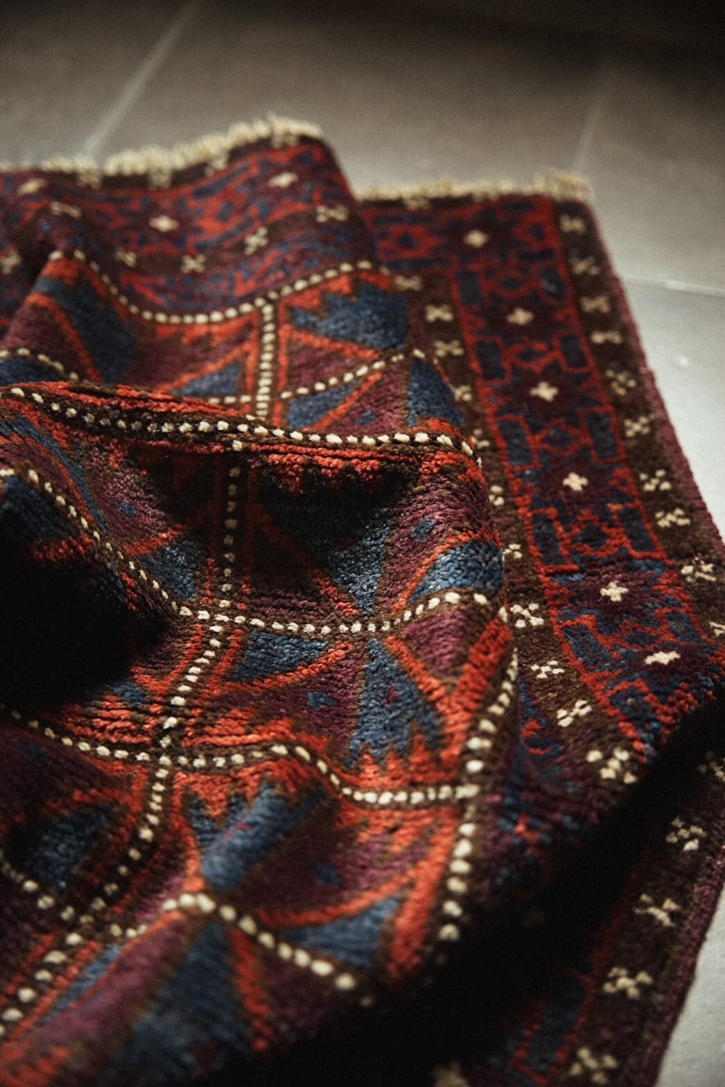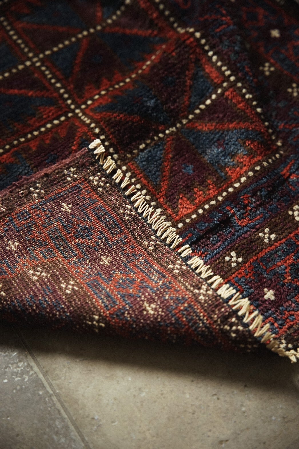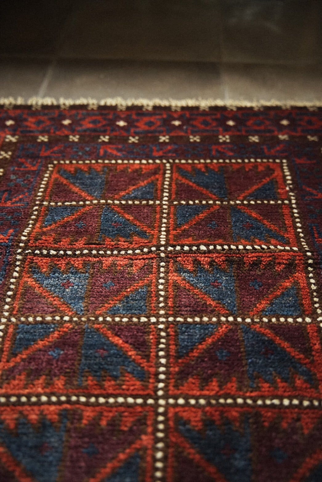渋めの色合いにチナールが描かれたバルーチラグ。