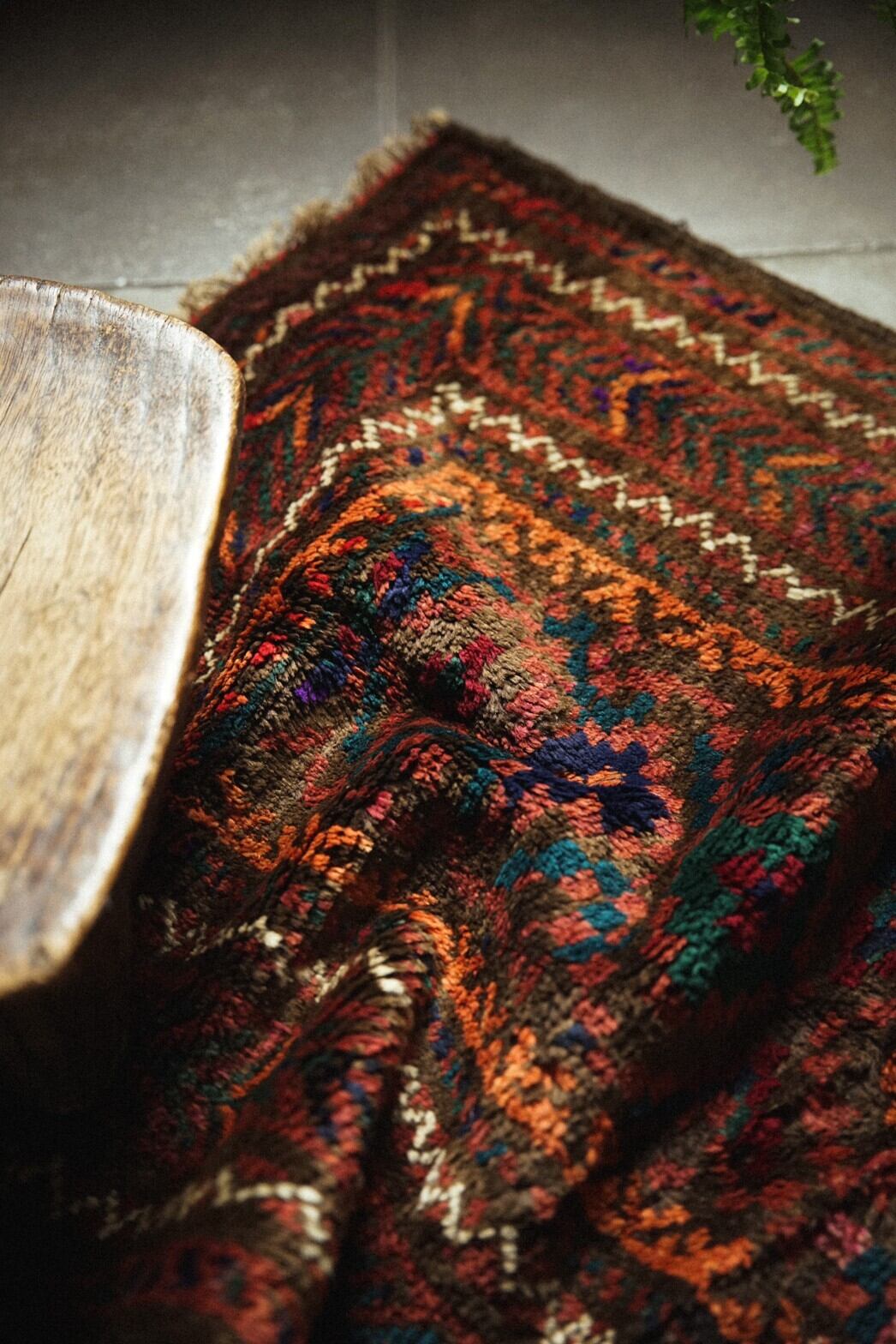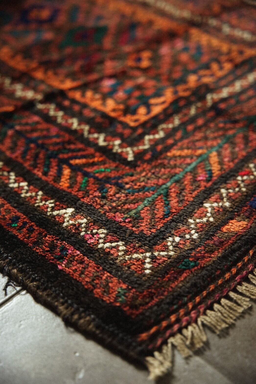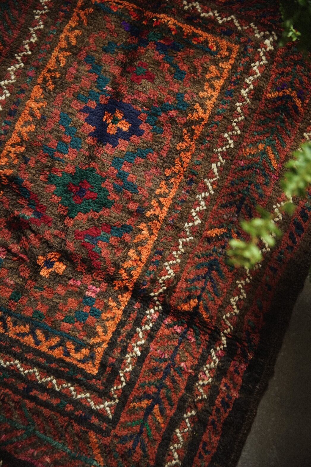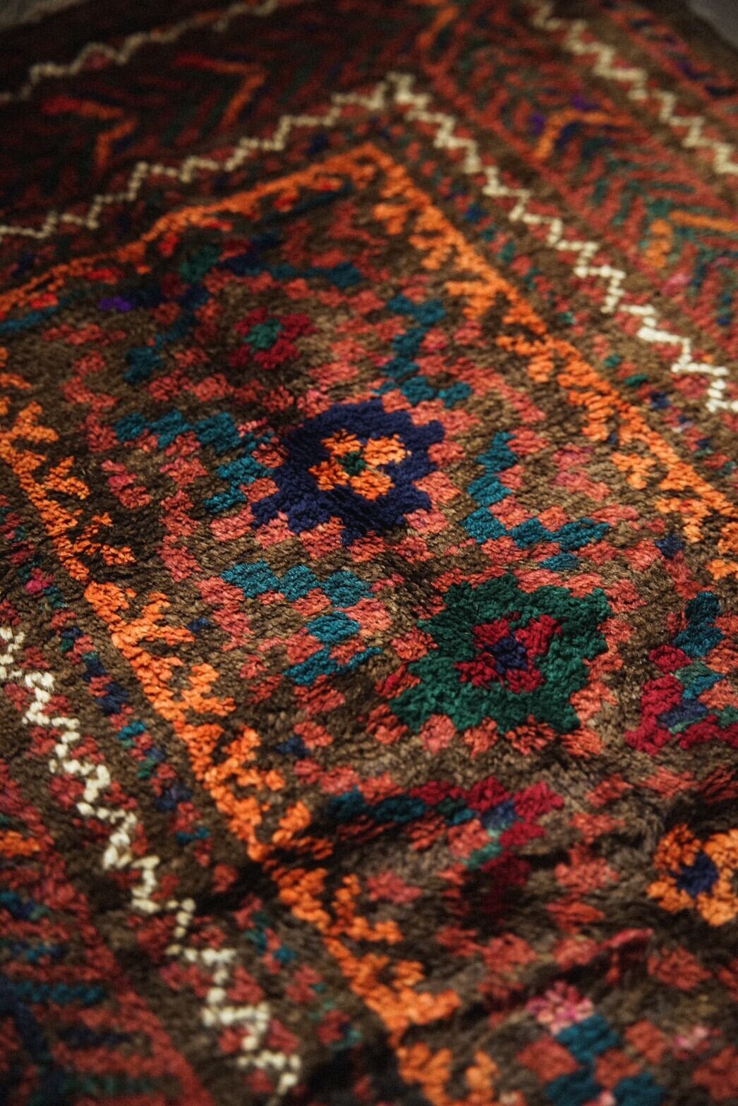 赤と茶系ベースにカラフルな色合いのメダリオンがとてもかわいらしいバルーチラグ。