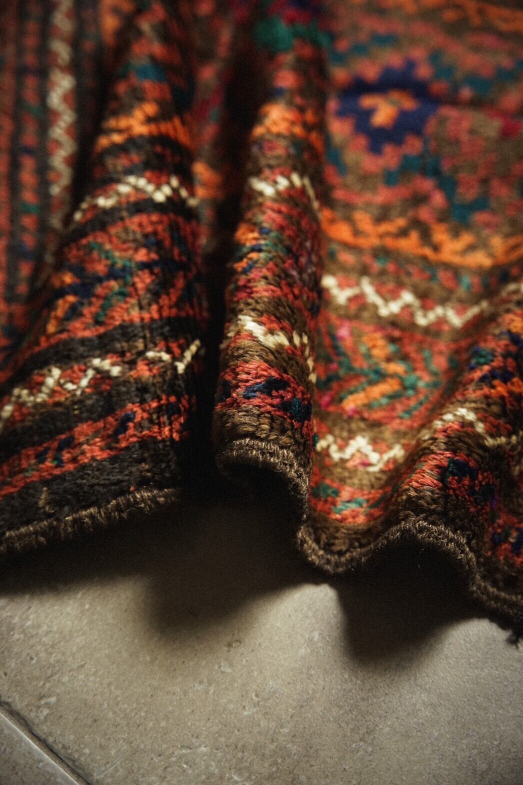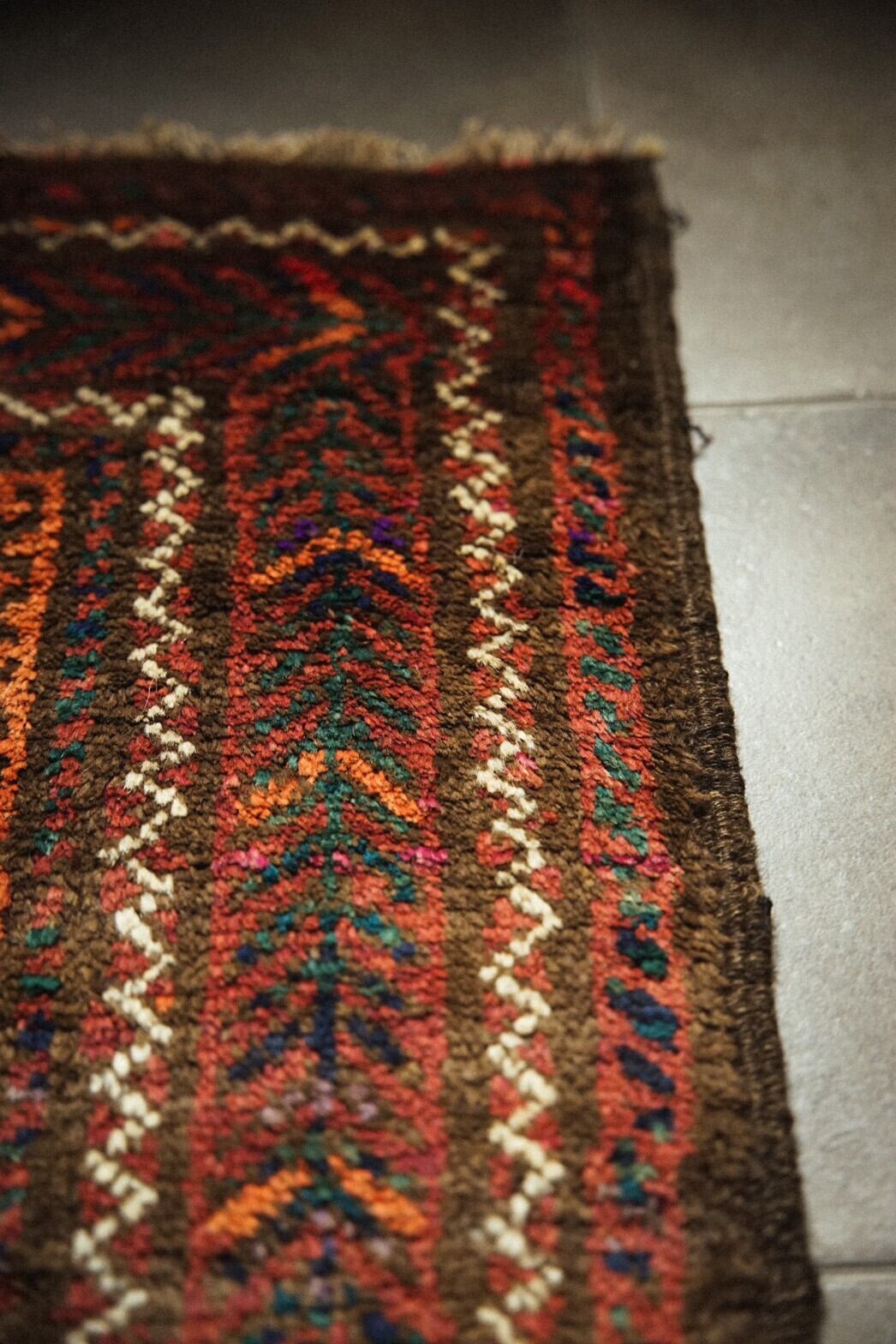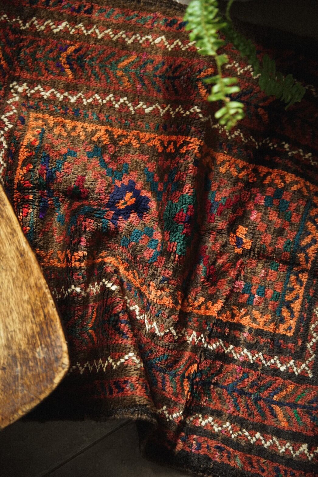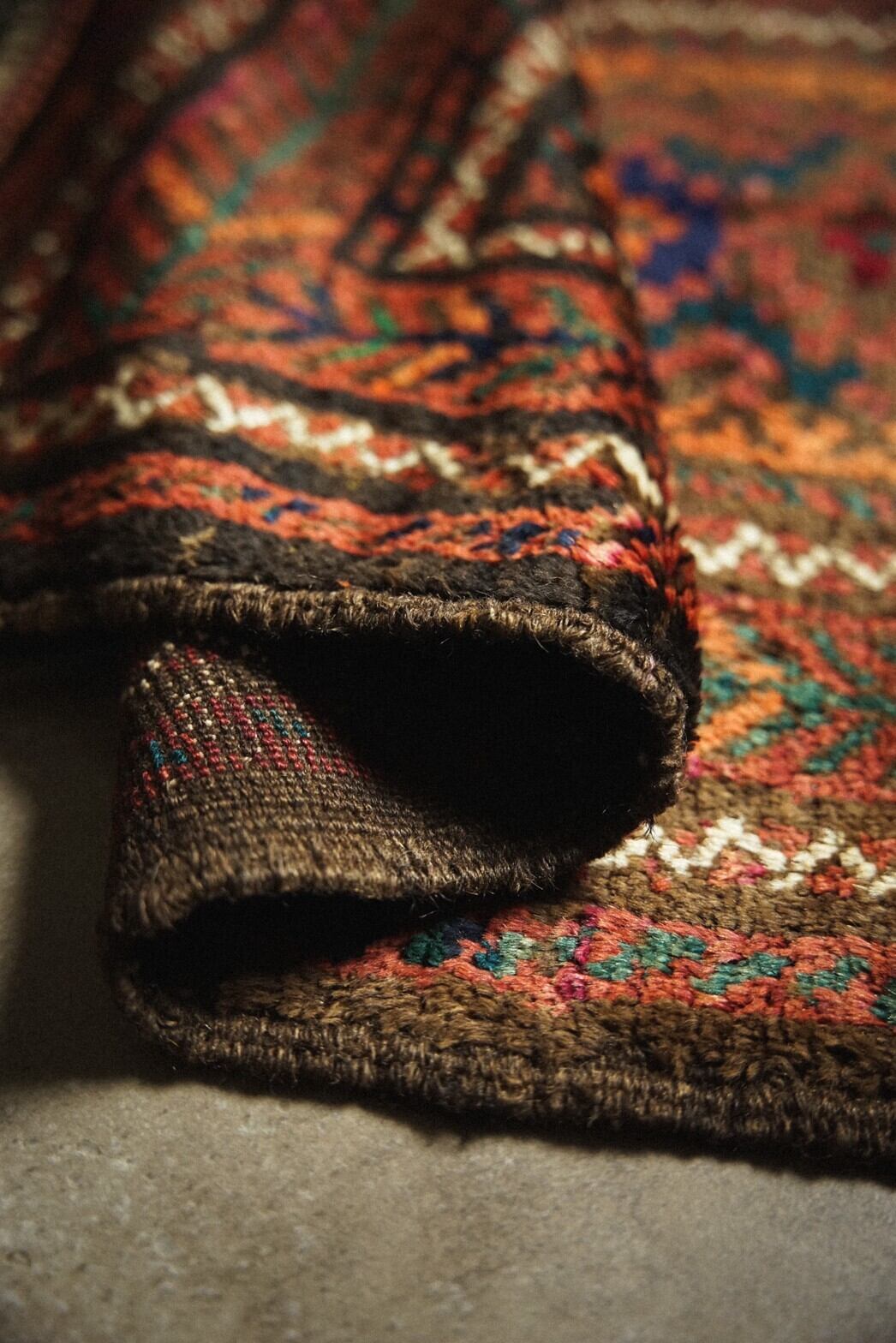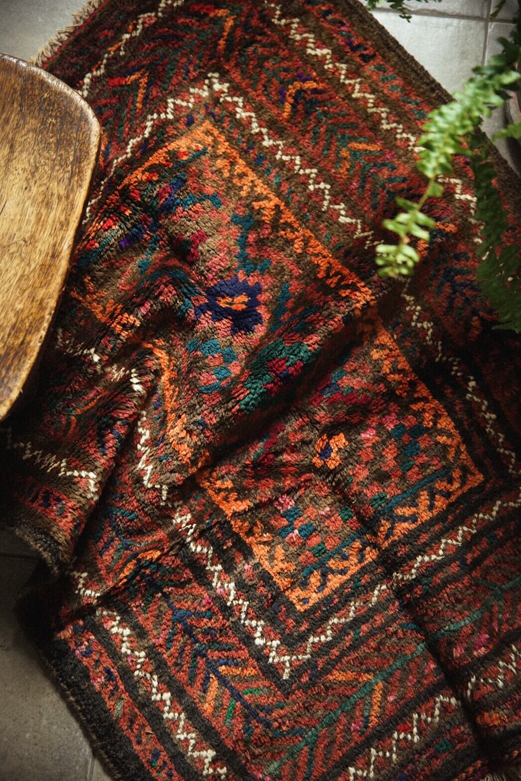 赤と茶系ベースにカラフルな色合いのメダリオンがとてもかわいらしいバルーチラグ。