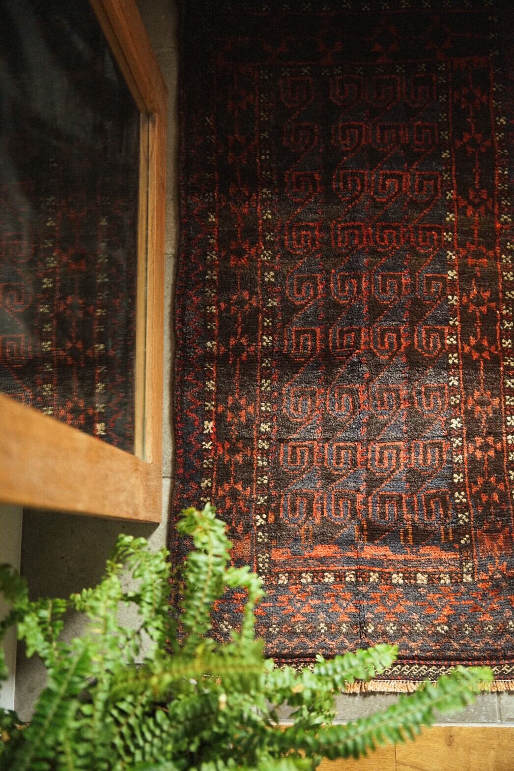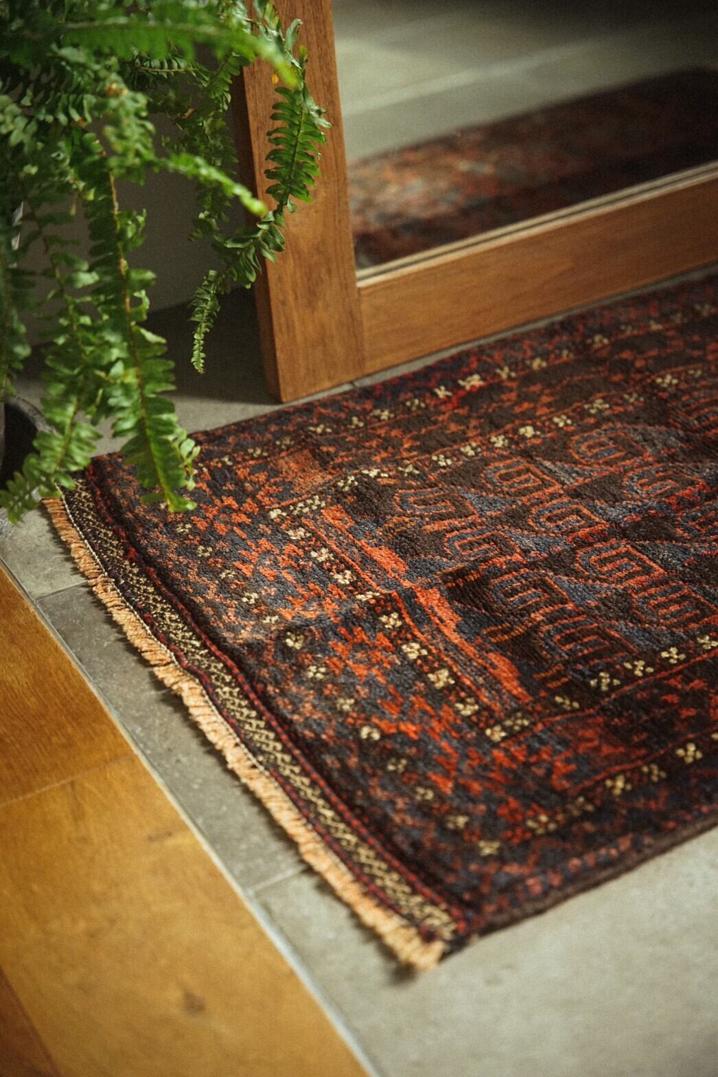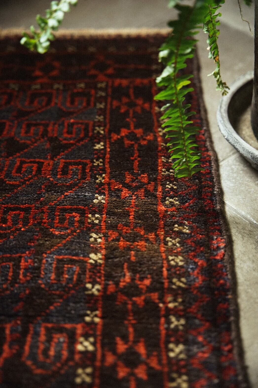 艶のあるネイビーとレッドが美しいバルーチ族のバーリシトをラグに仕立ててもらいました。全体的に渋めの色合いにボーダー部分の白い小花柄がアクセントとなり癒しを与えてくれます。フリンジ部分はキリムエンド。