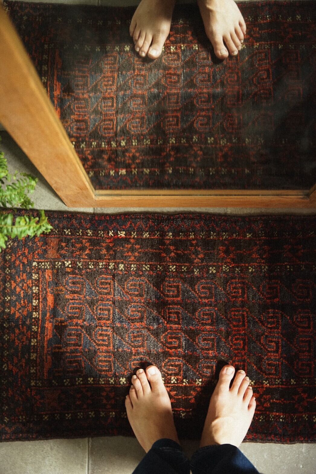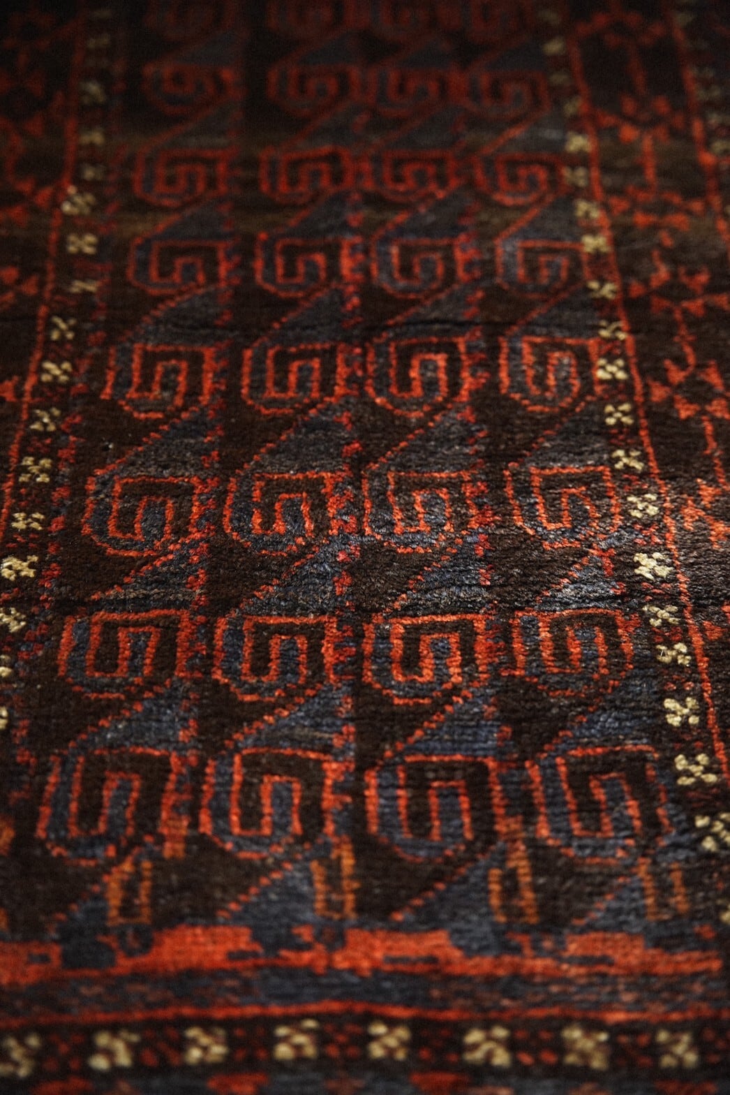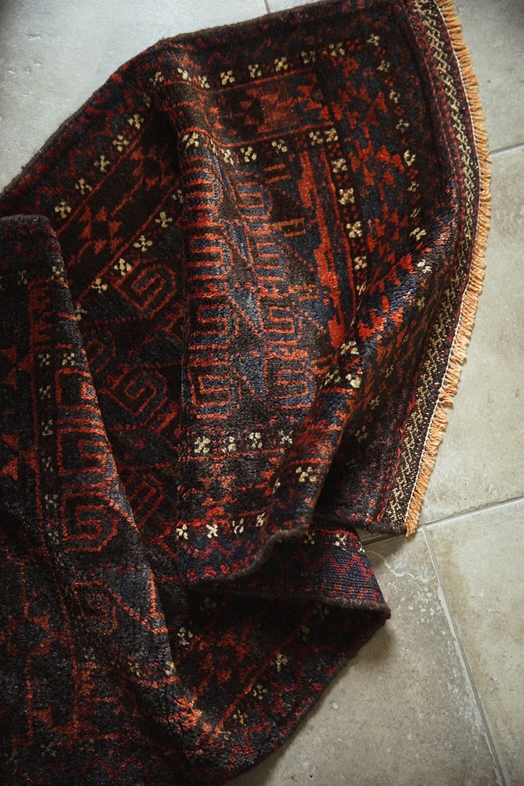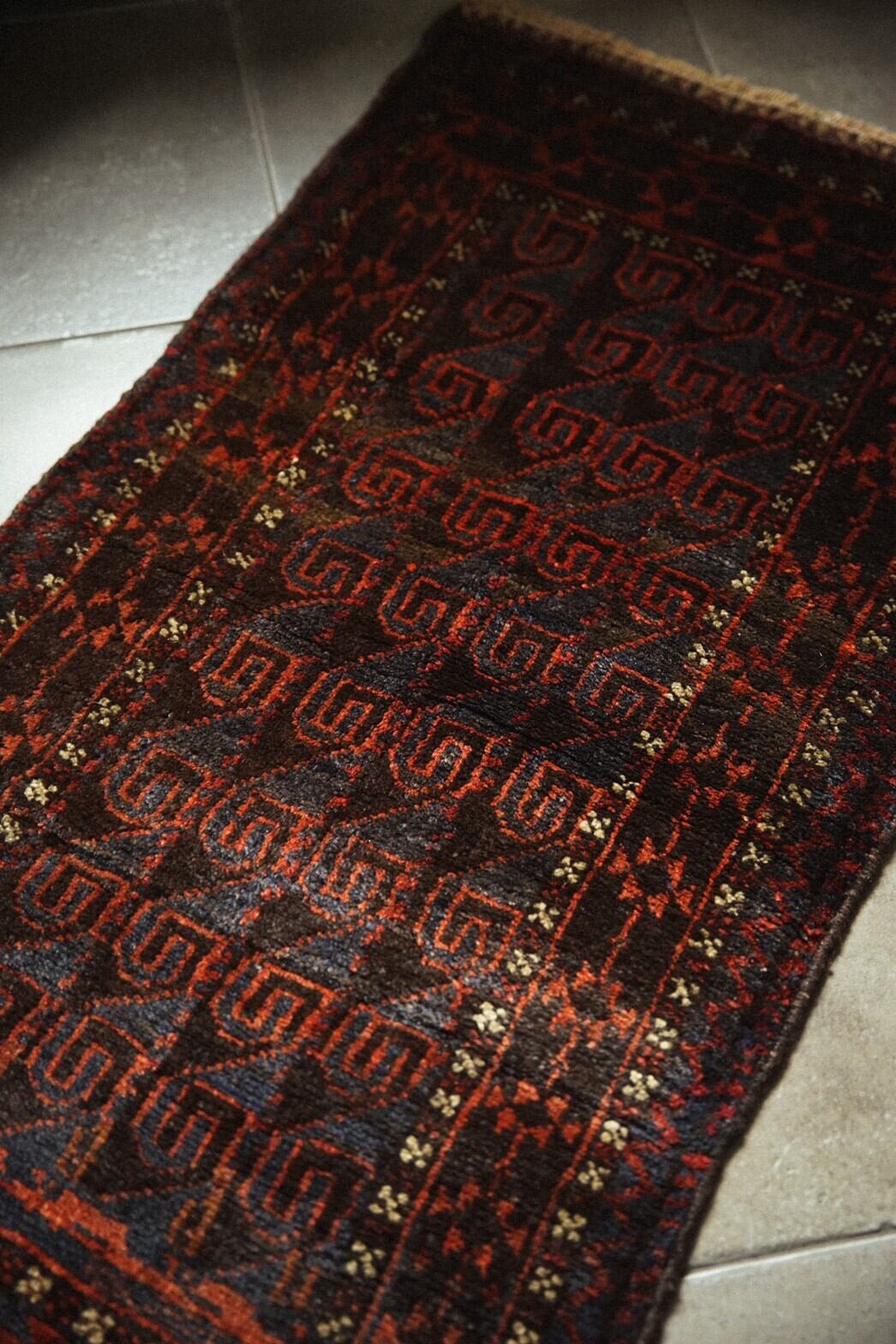 艶のあるネイビーとレッドが美しいバルーチ族のバーリシトをラグに仕立ててもらいました。全体的に渋めの色合いにボーダー部分の白い小花柄がアクセントとなり癒しを与えてくれます。フリンジ部分はキリムエンド。