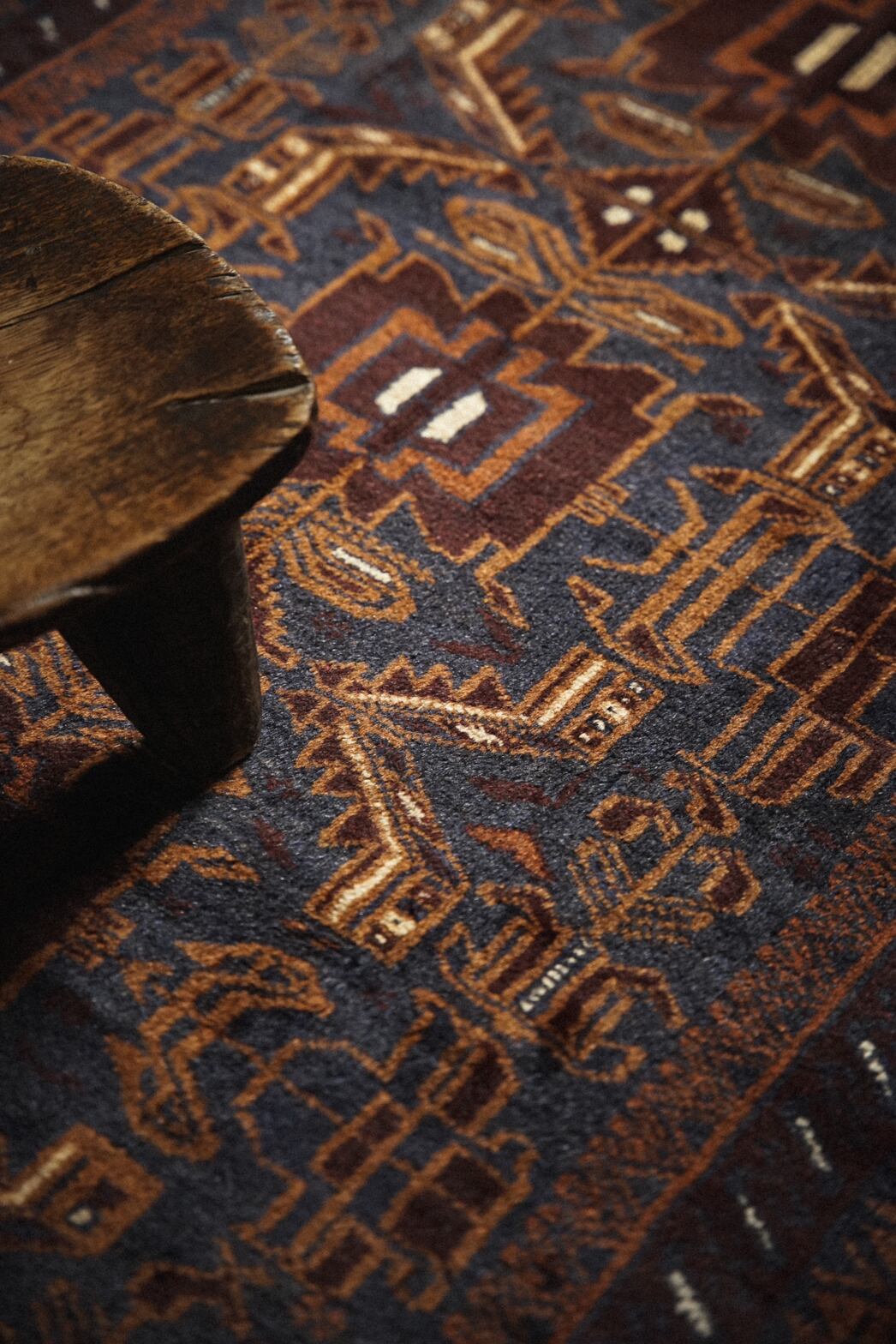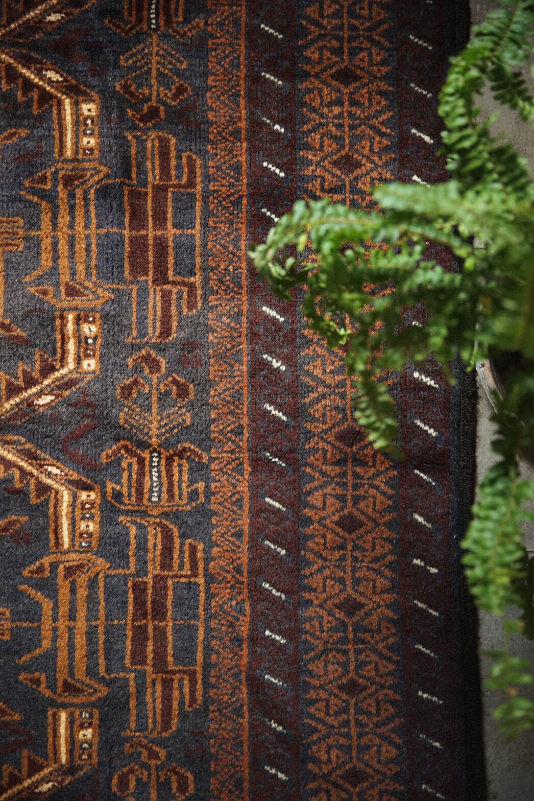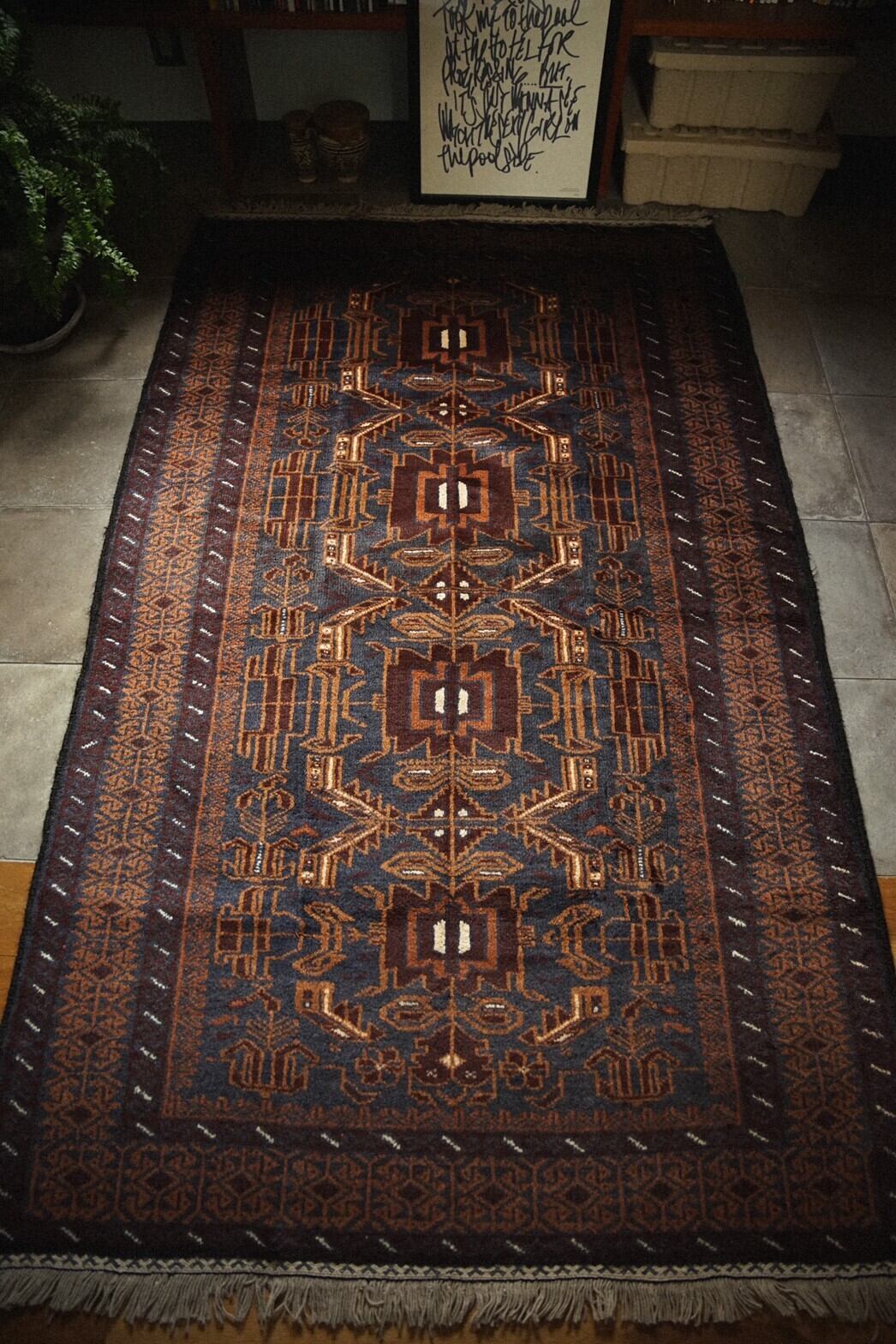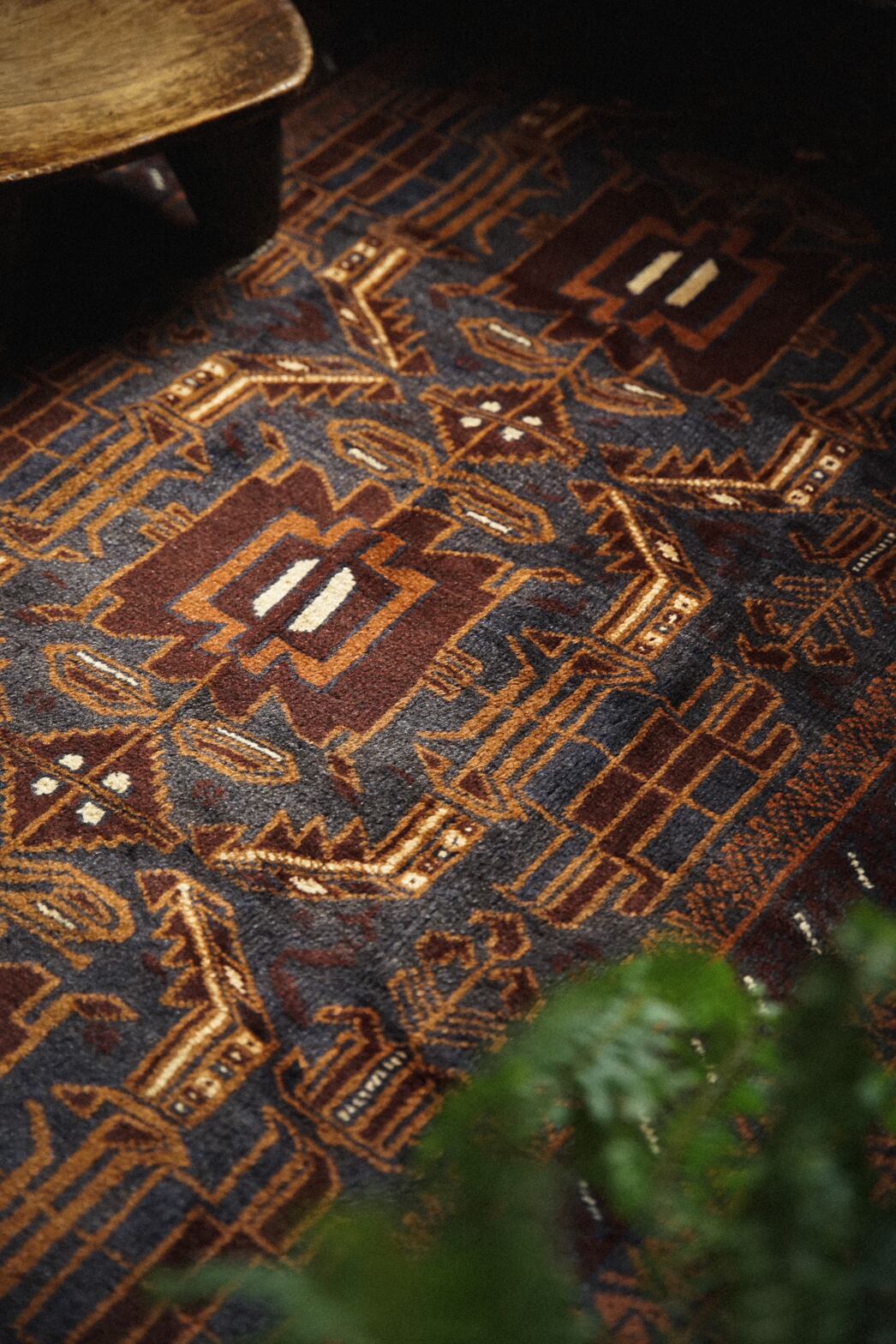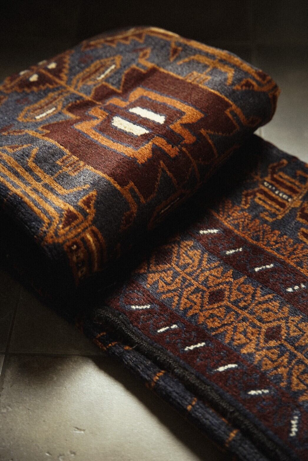 ネイビー×ブラウンベースの艶感が美しいバルーチラグ。