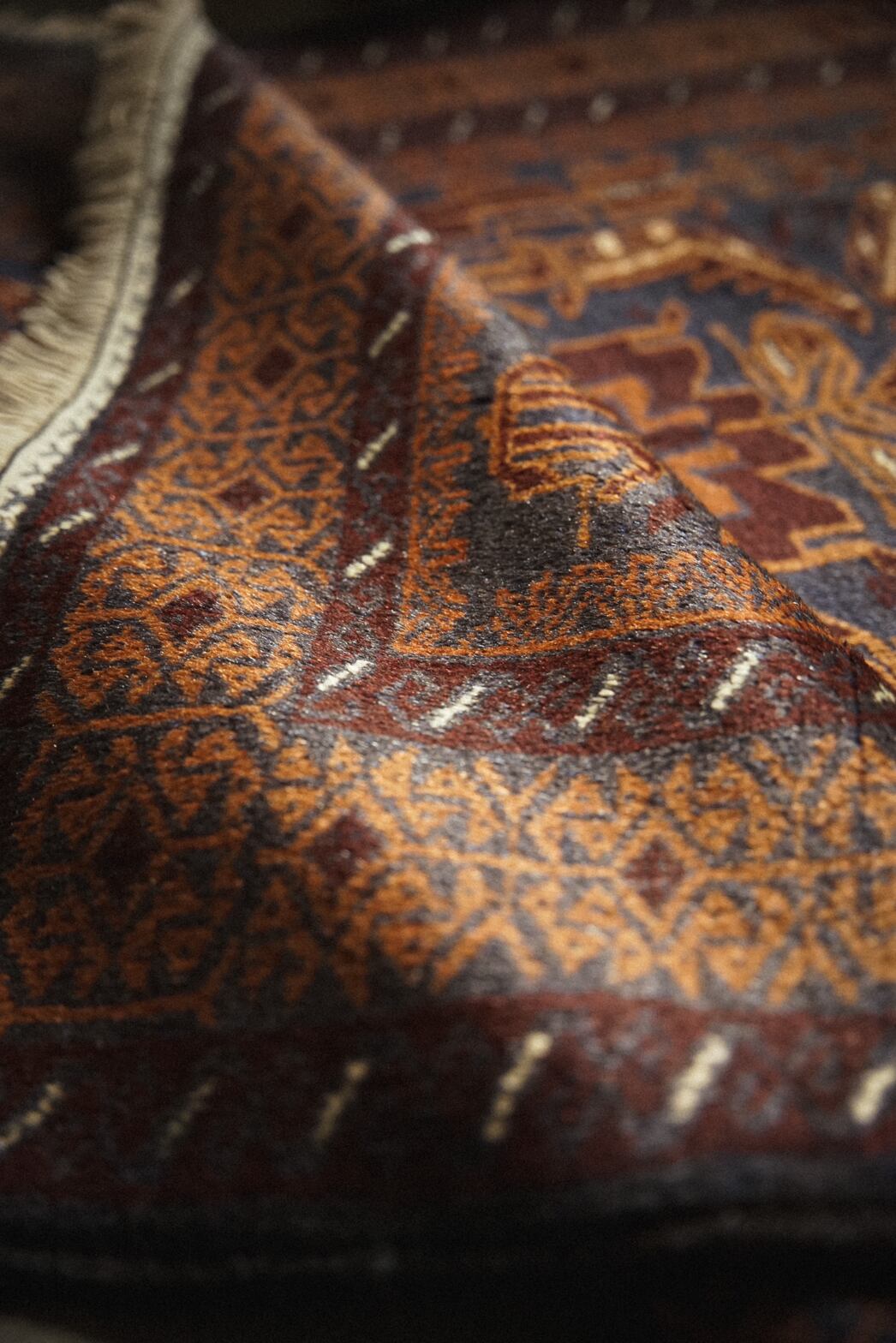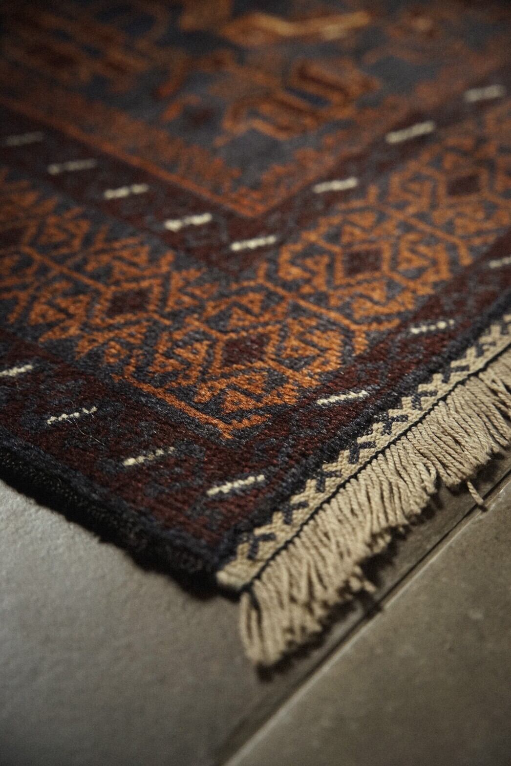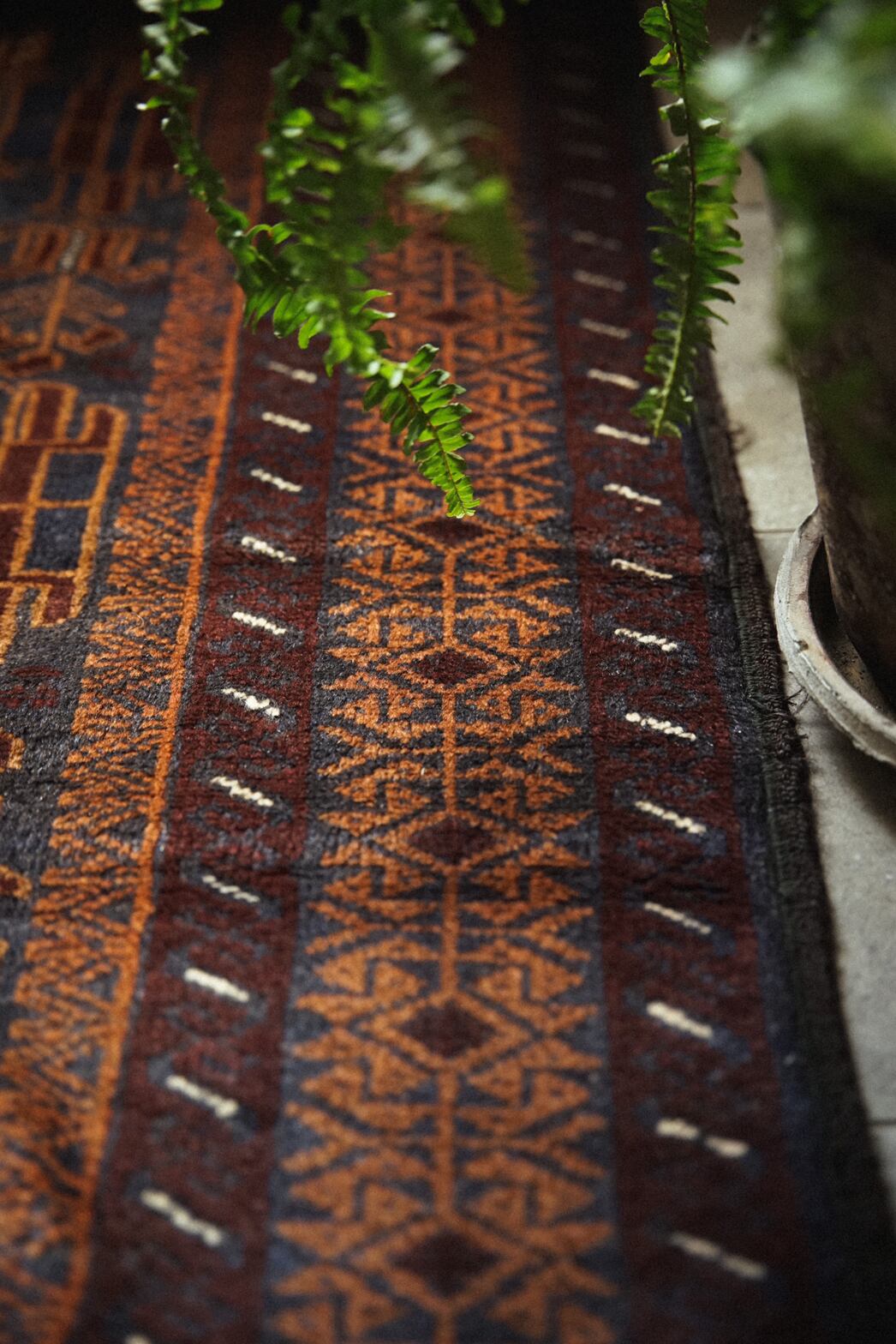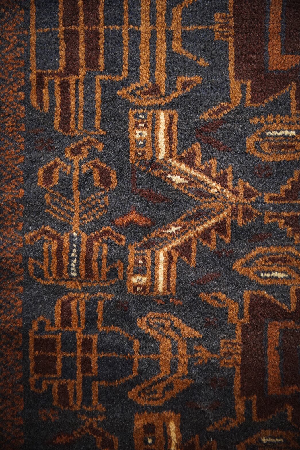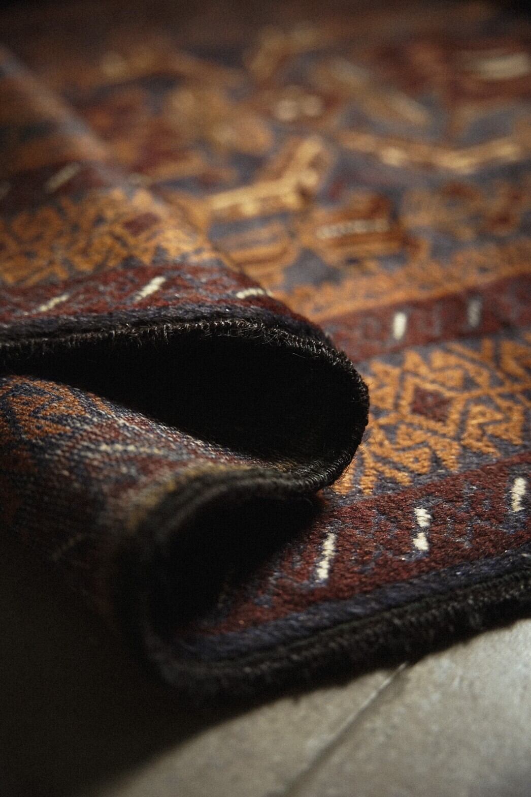 ネイビー×ブラウンベースの艶感が美しいバルーチラグ。