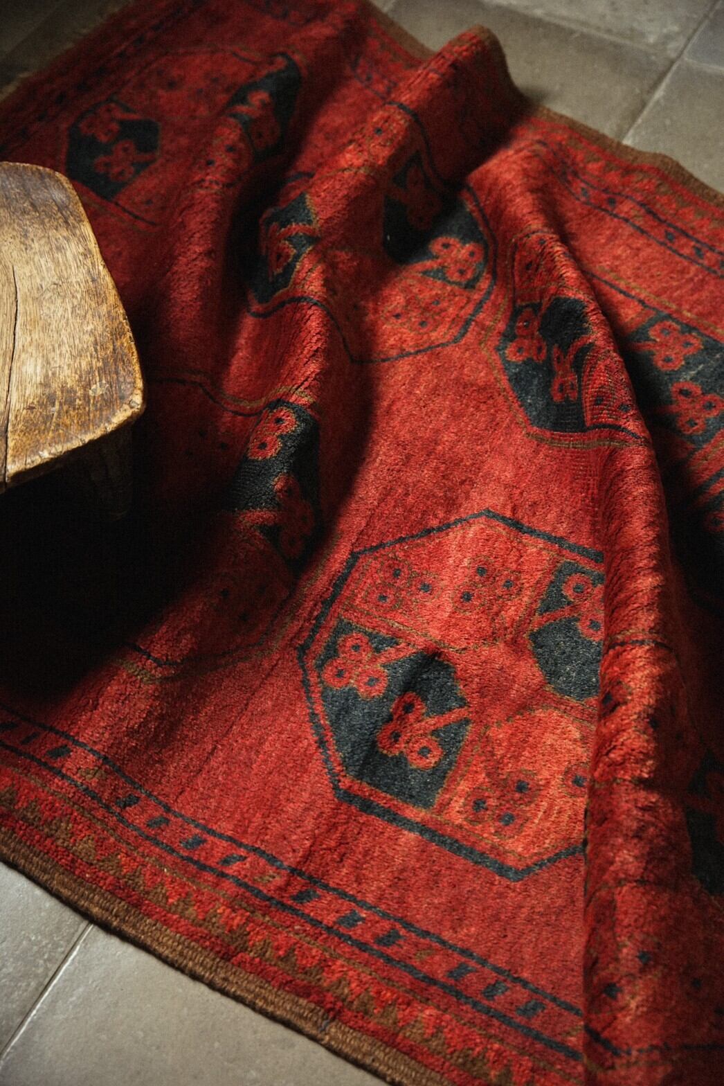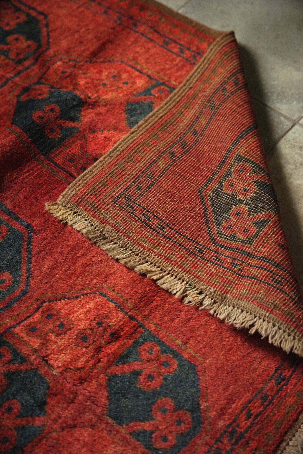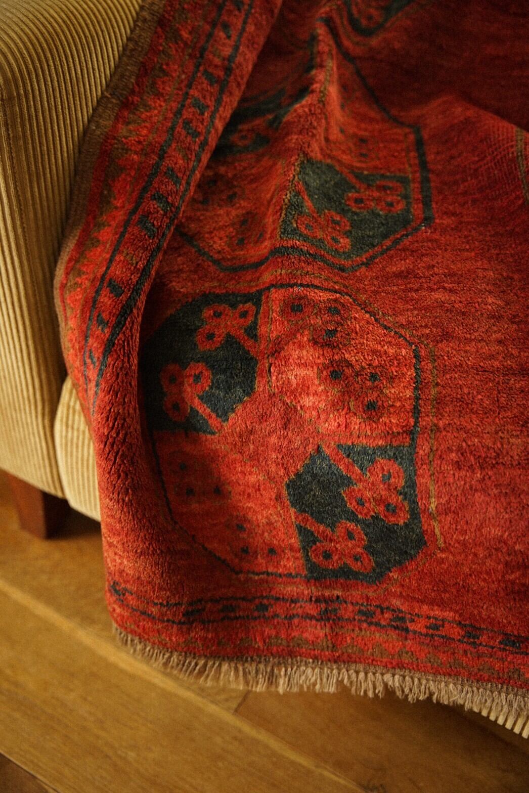 大切に保管されていたようで、目立ったダメージや補修跡はなくグッドコンディション。トルクメンラグならではの密度の詰まった細かい織りは手触りもとても滑らか。