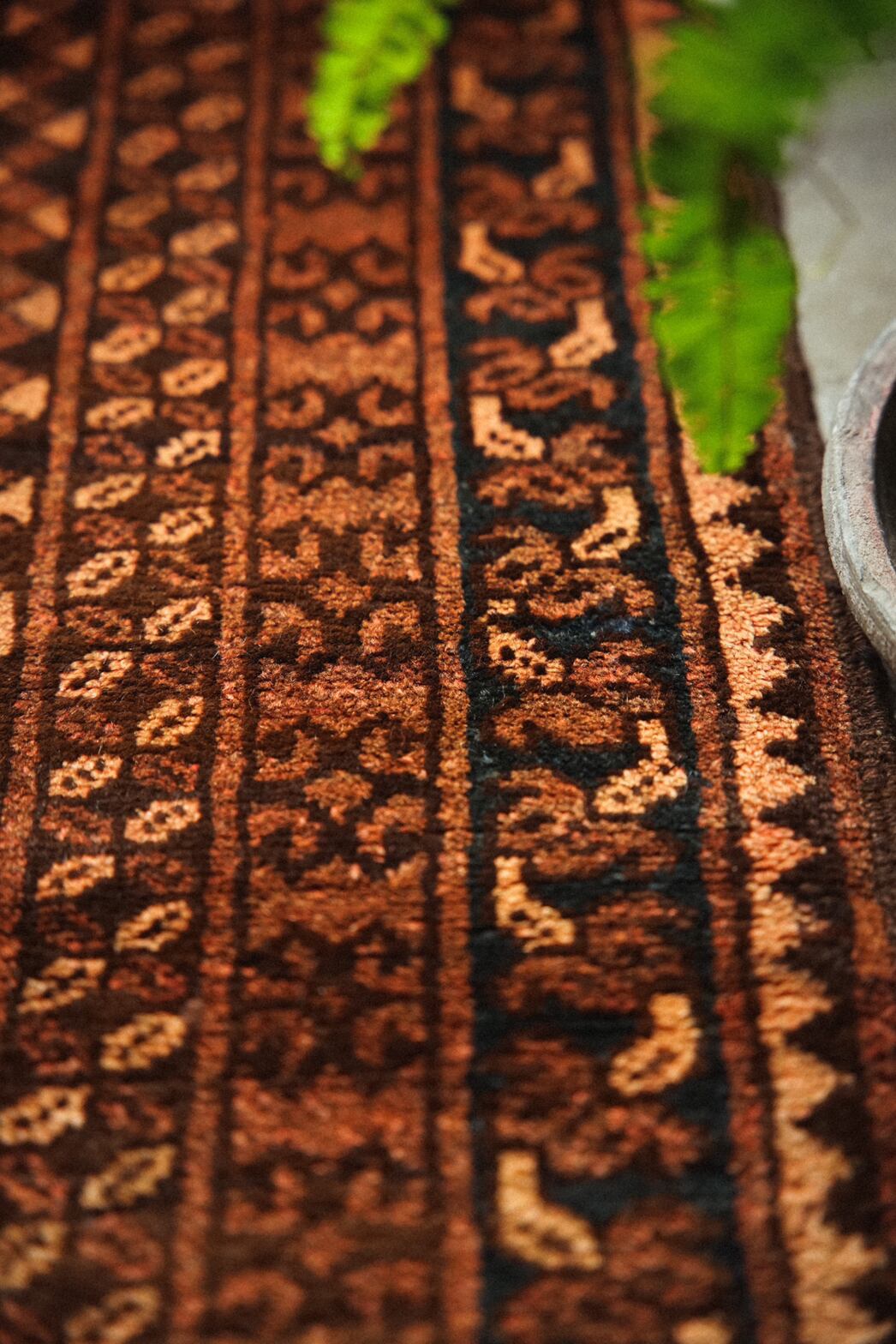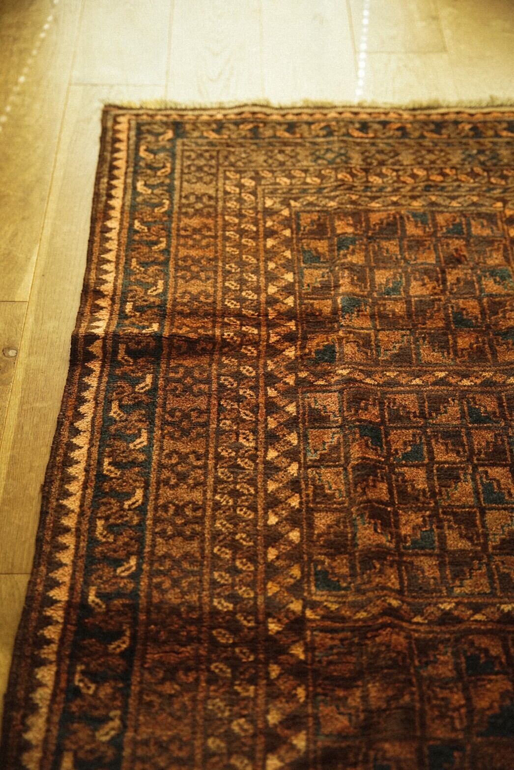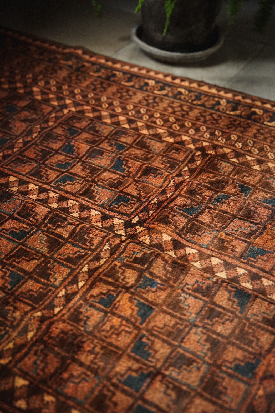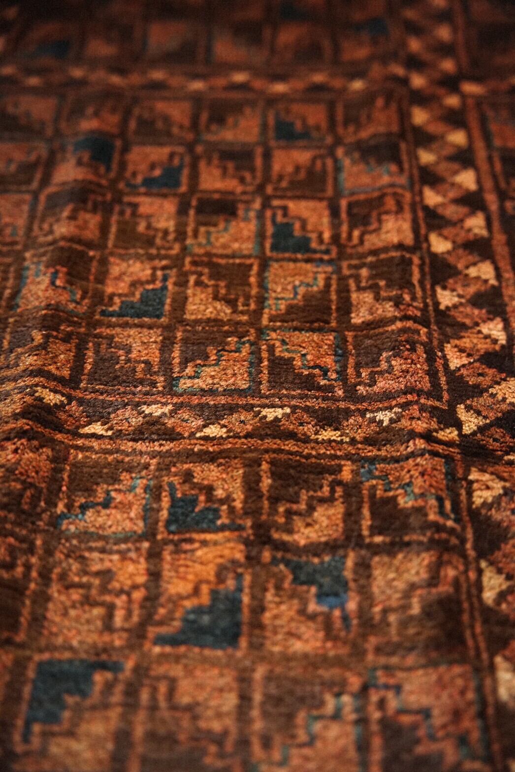 美しい艶を放つブラウン系の経年90年のトルクメンラグ。