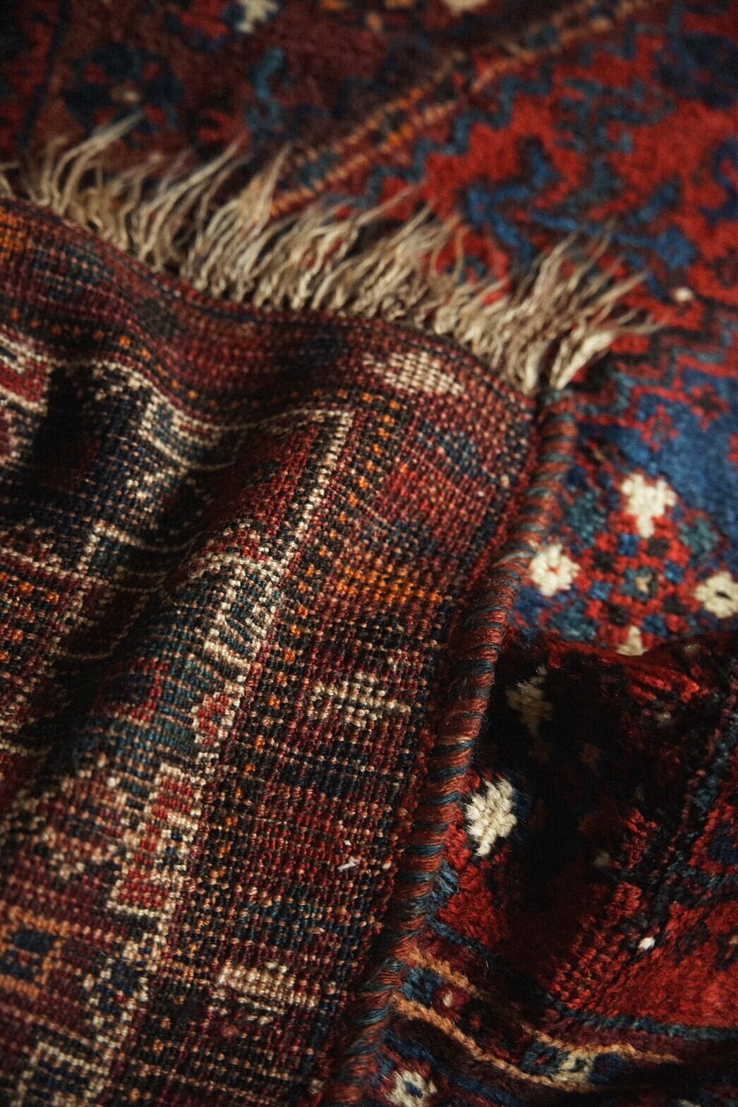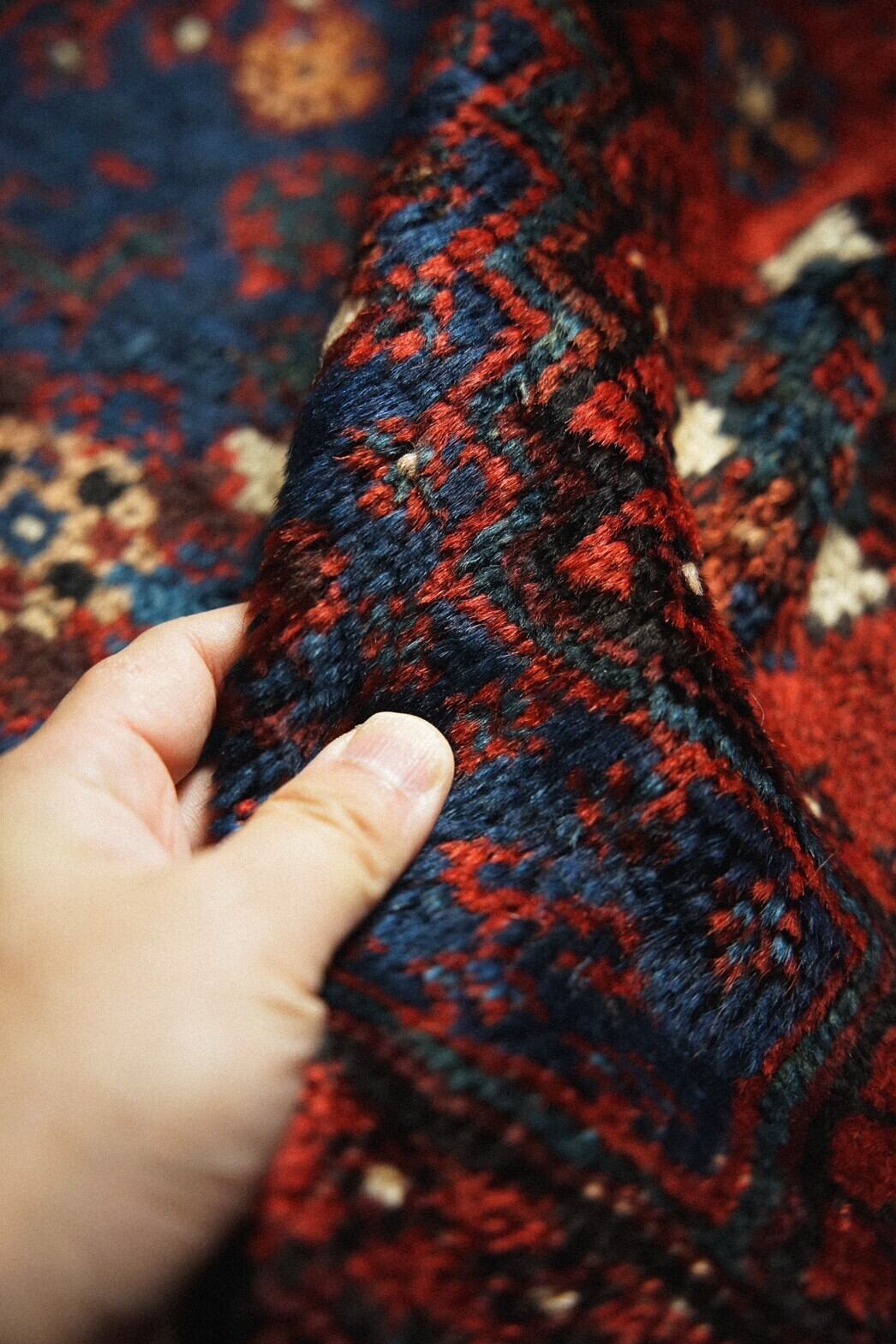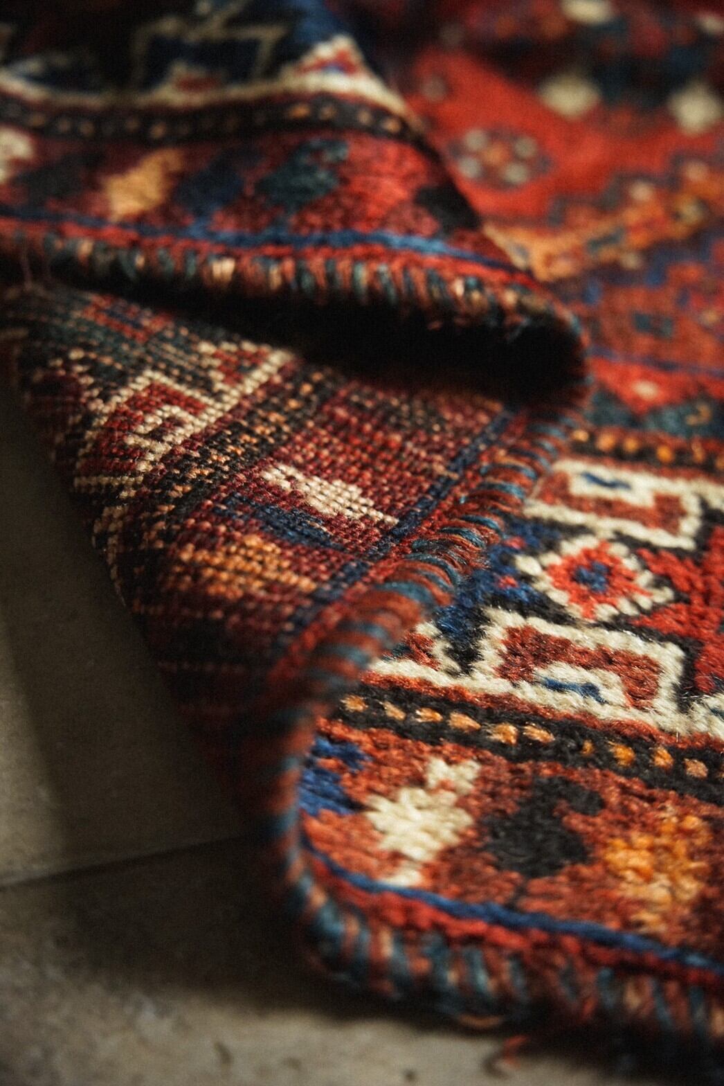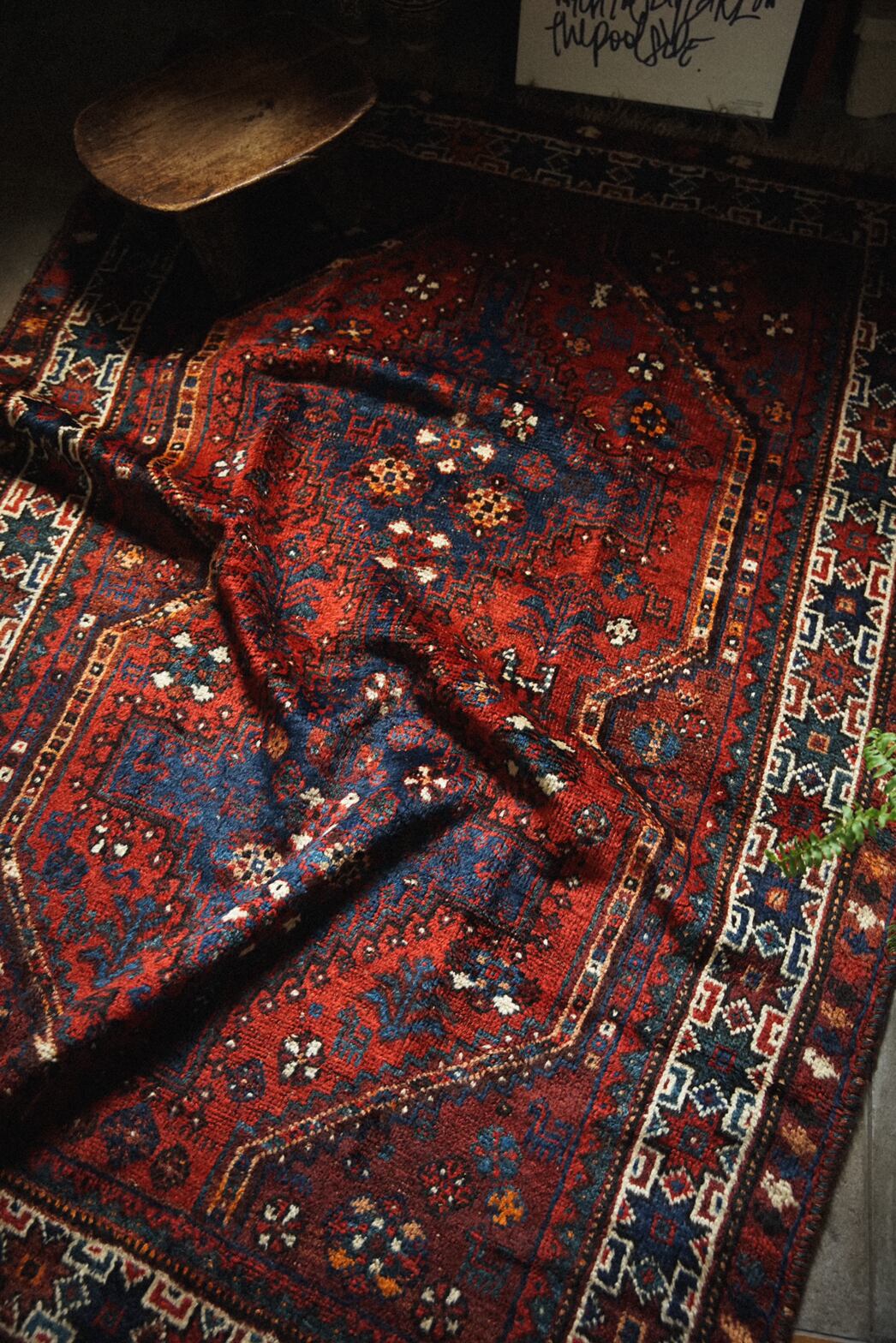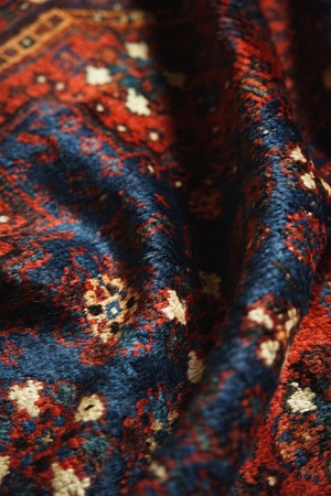 ラグにはたくさんの鳥や動物モチーフ、花や生命の樹などカシュガイ族の伝統的なモチーフが並んでいる華やかなデザイン。ボーダー部分のカラフルな八角星がカジュアルな雰囲気でインテリアのアクセントになってくれます。