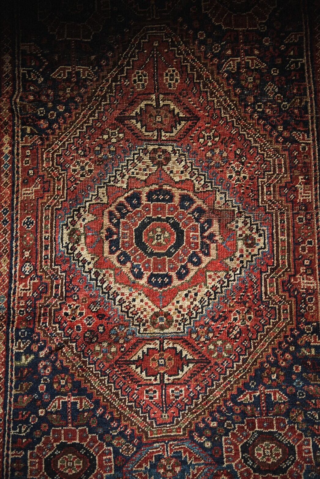 大きなメダリオンを中心に動物や花など伝統的なモチーフが細かく描かれていて見ているだけでも飽きない魅力あるラグ。