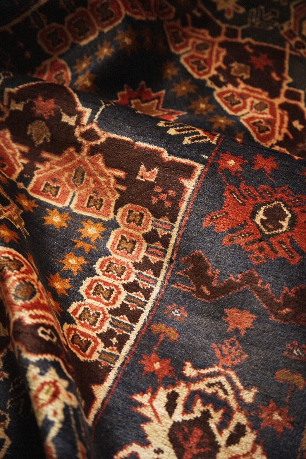 艶のあるネイビーベースに、レッド、アイボリー、オリーブ、ブラウンなど全体的に落ち着いた色合い。
