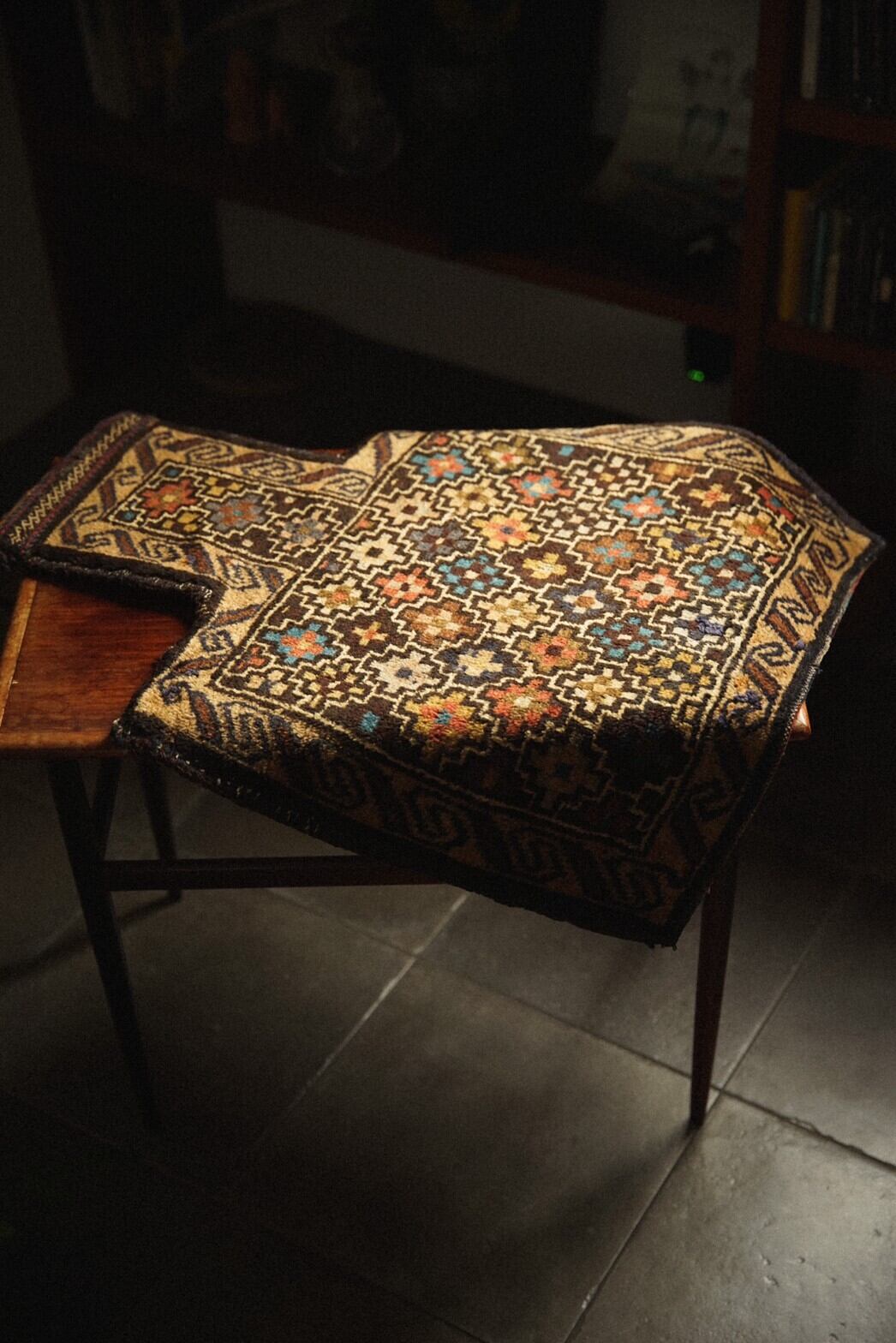 カラフルな色合いが見ていて楽しい気分に。ブラウン系ベースなので大人っぽくまとまっています。裏面はキリム。