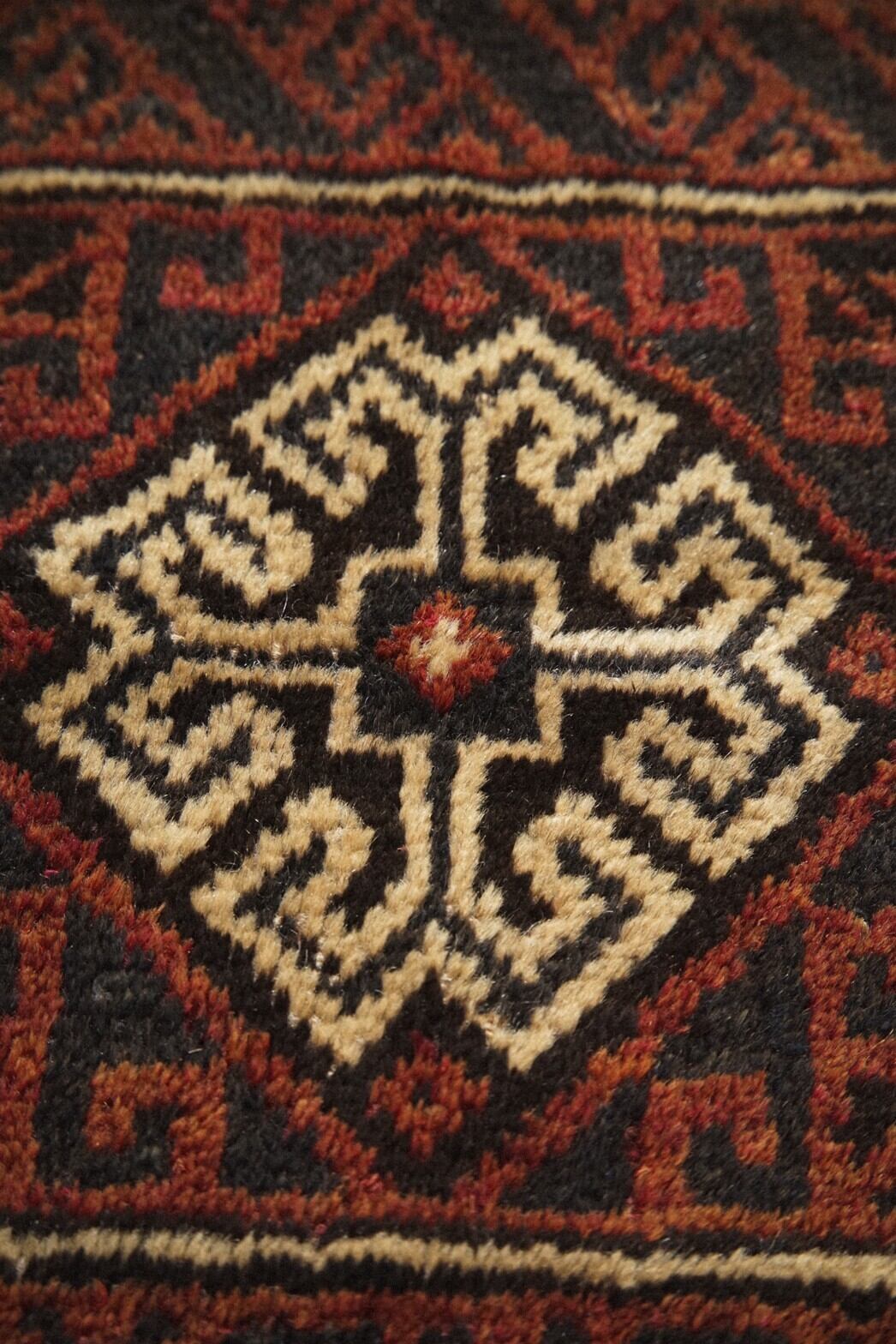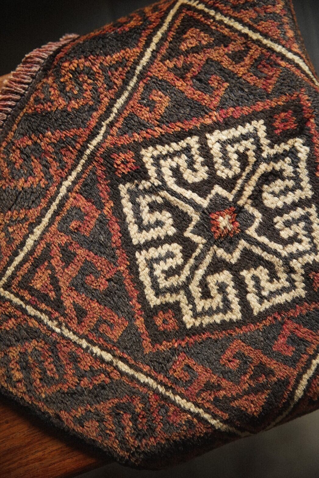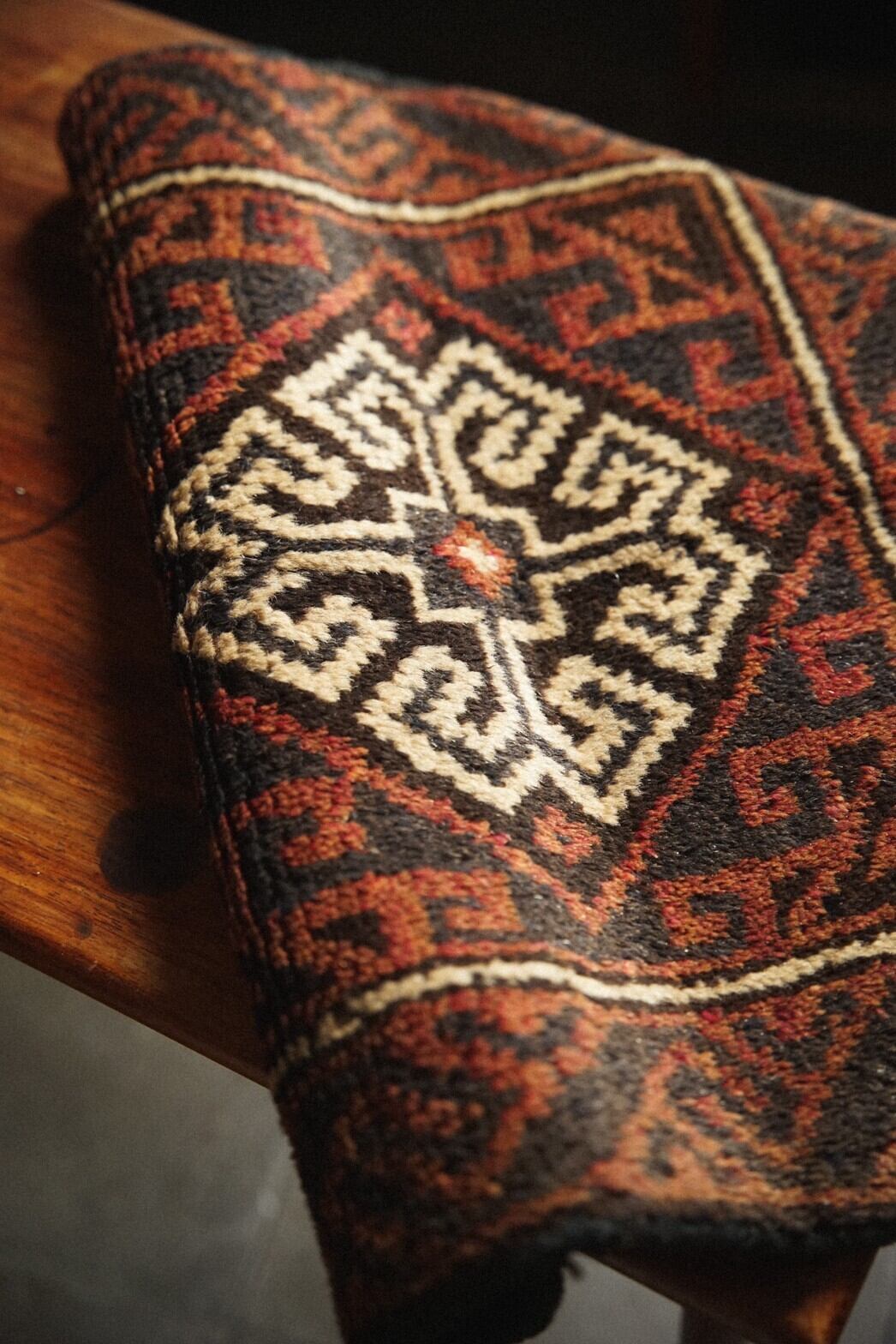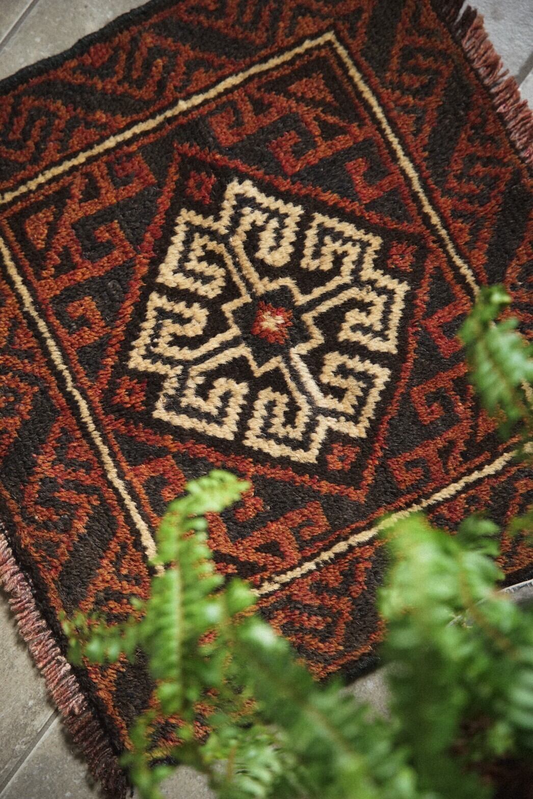真ん中にメダリオンが描かれているシンプルなデザインのバルーチのミニラグ。経年により赤茶になった色合いが渋くてかっこいいです。目立ったダメージは特になし。持ち運びしやすいサイズ感で部屋の色んなところに試し敷きしてとっておきの場所を見つけてみるのもいいですね♪キャンプやピクニックなどのアウトドアでのご使用もおすすめです。