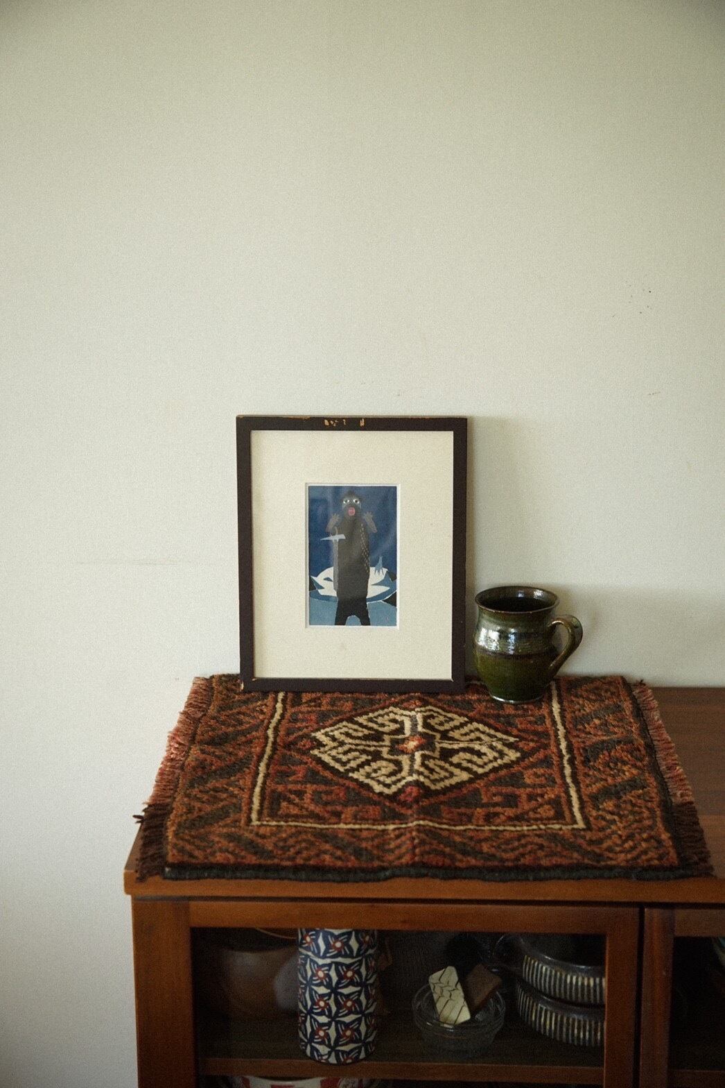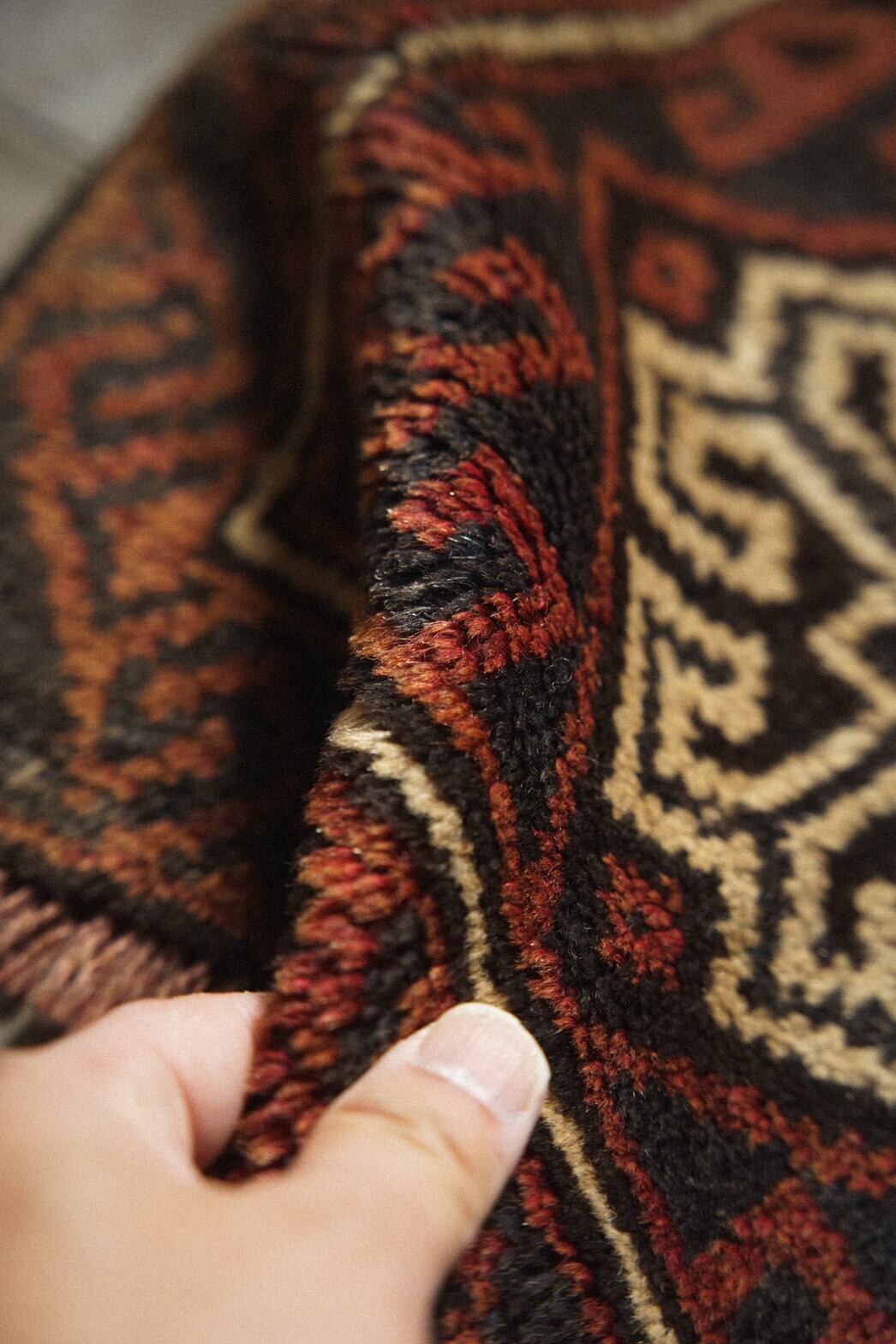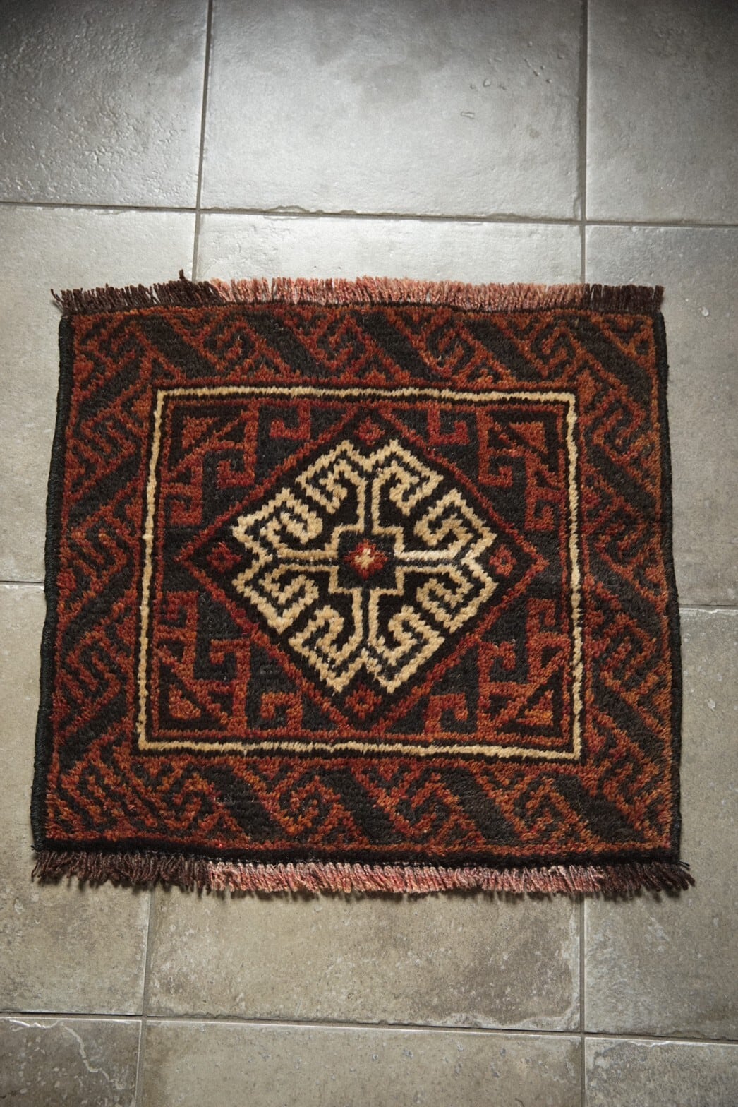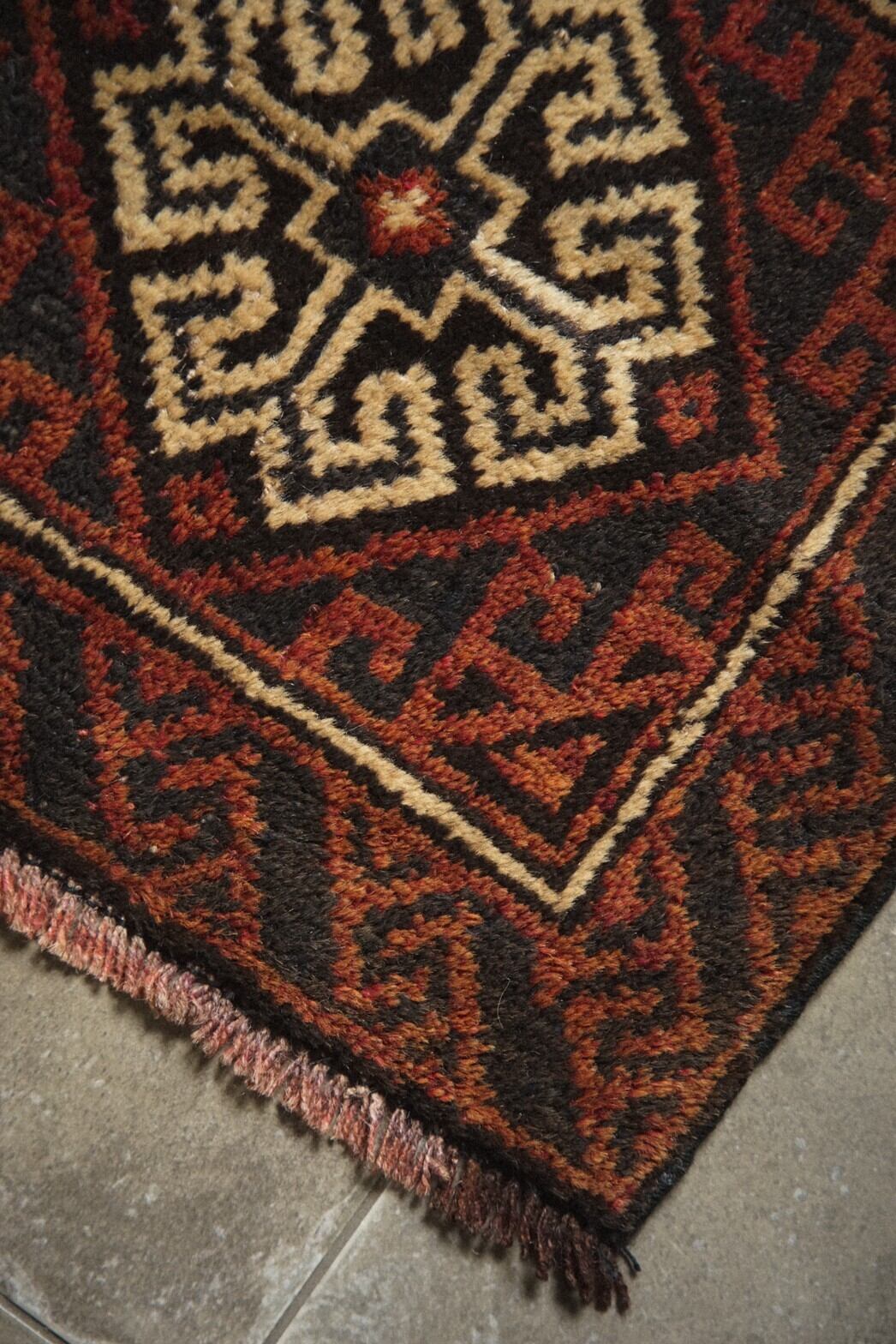 真ん中にメダリオンが描かれているシンプルなデザインのバルーチのミニラグ。経年により赤茶になった色合いが渋くてかっこいいです。目立ったダメージは特になし。持ち運びしやすいサイズ感で部屋の色んなところに試し敷きしてとっておきの場所を見つけてみるのもいいですね♪キャンプやピクニックなどのアウトドアでのご使用もおすすめです。