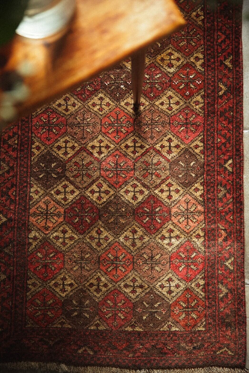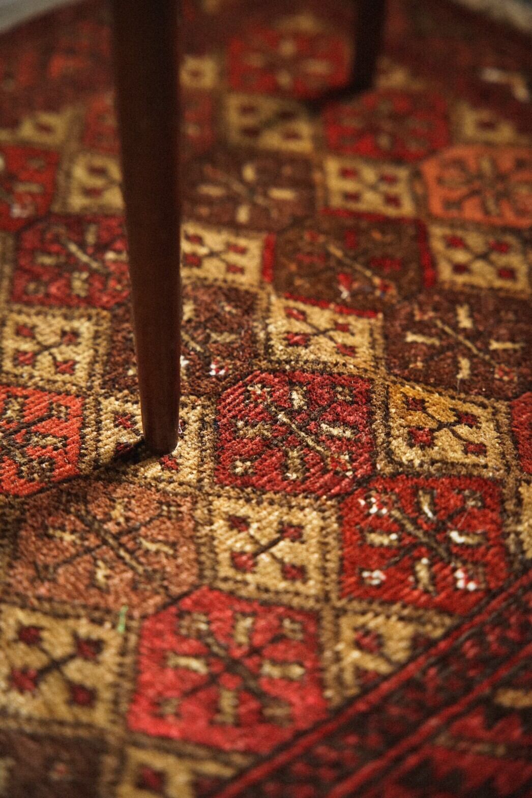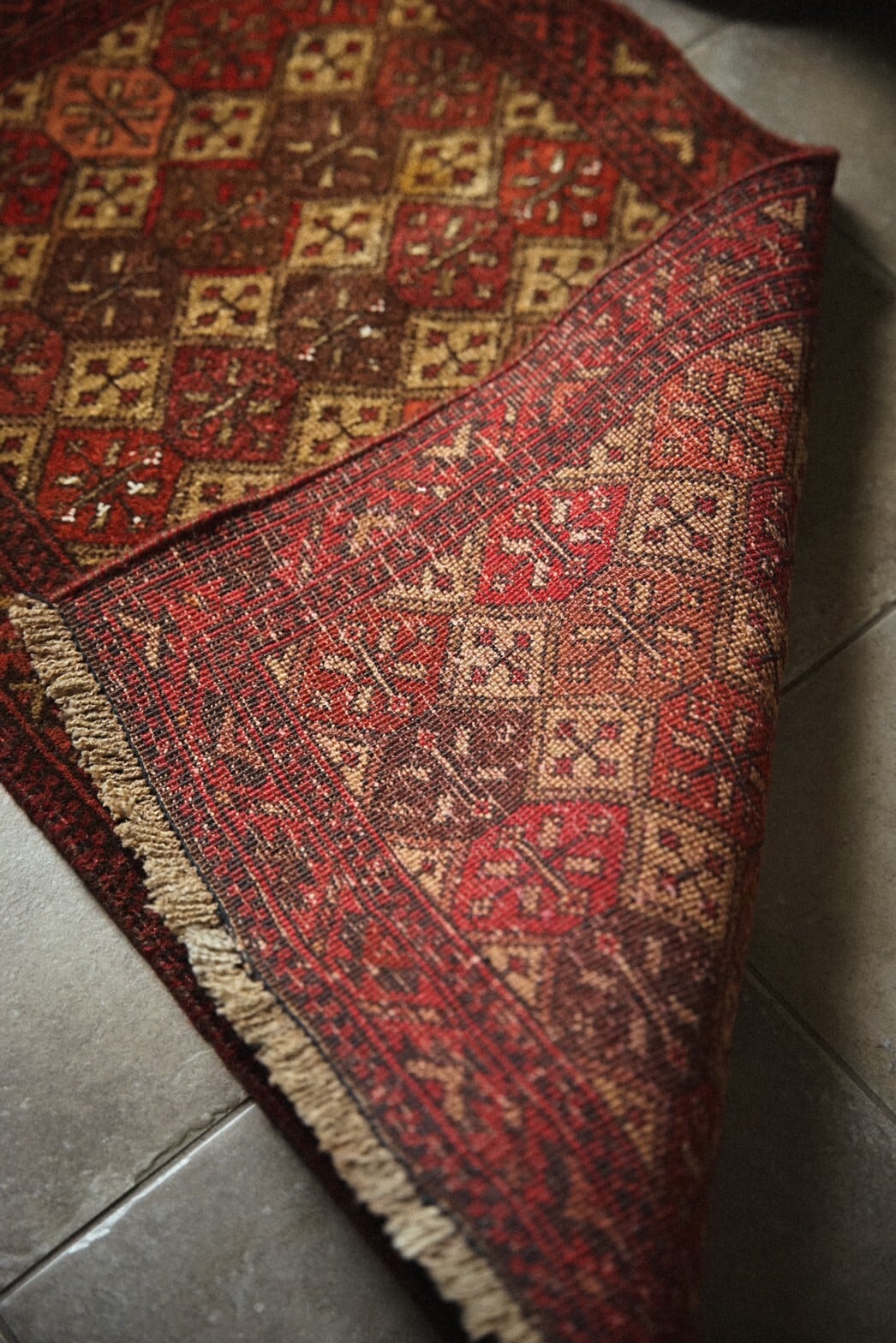 1970年代のトルクメンラグ。バリエーション豊かな赤色とベージュの組み合わせの菱形モチーフが並んでいます。パイルは短めですが、トルクメンラグならではの細かい織りで滑らかな手触り。目立ったダメージはございません。温かみのある色合いなので植物と組み合わせたり、ナチュラルインテリアとの相性もバッチリ。玄関やキッチン、パソコンデスクの下など使いやすいサイズ感なのでお気に入りの場所に敷いてみてください♪