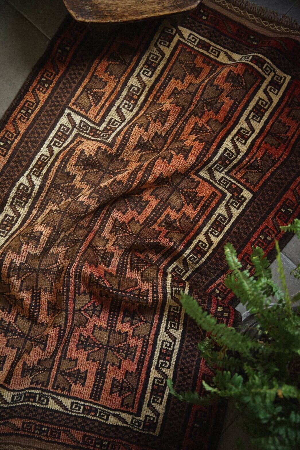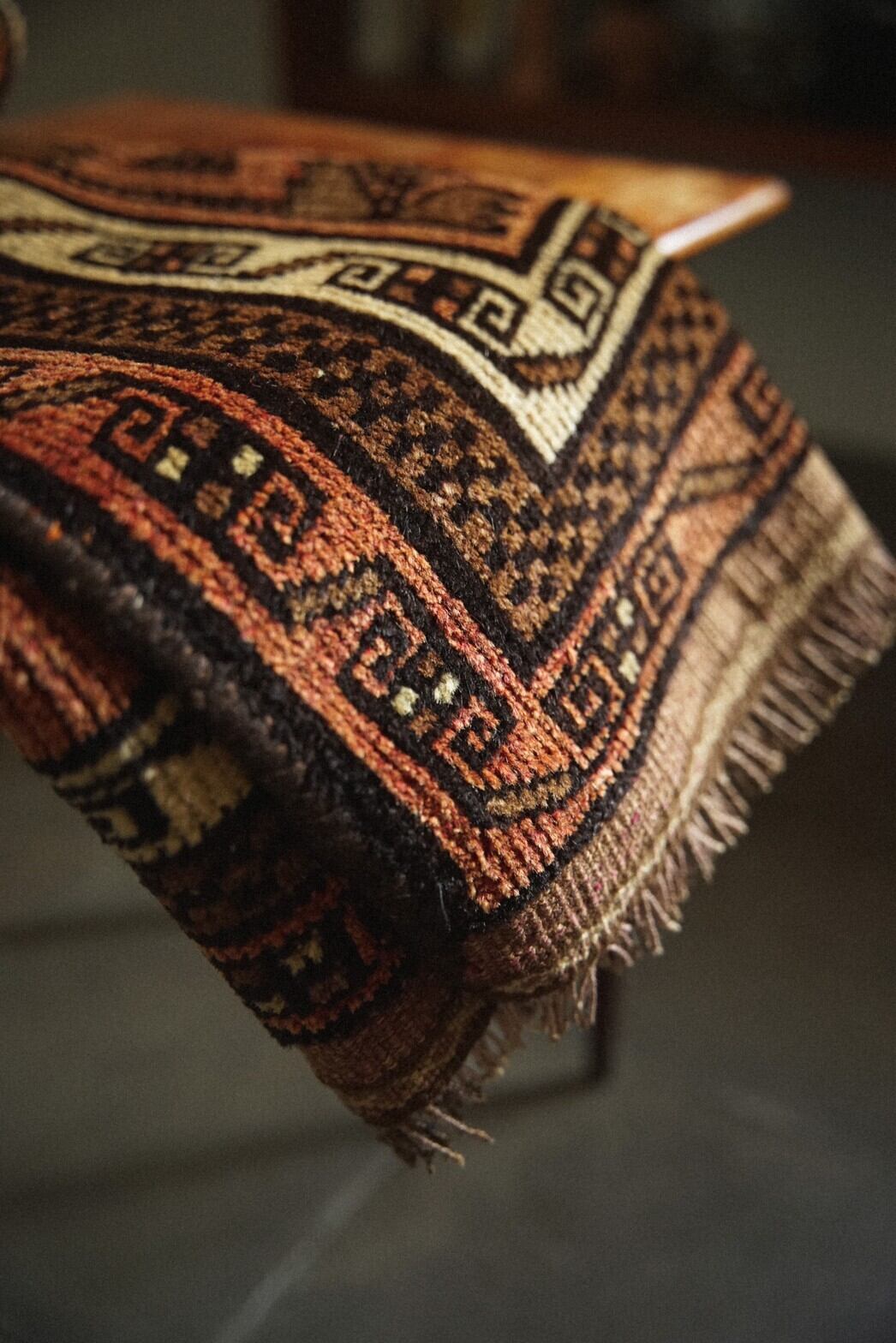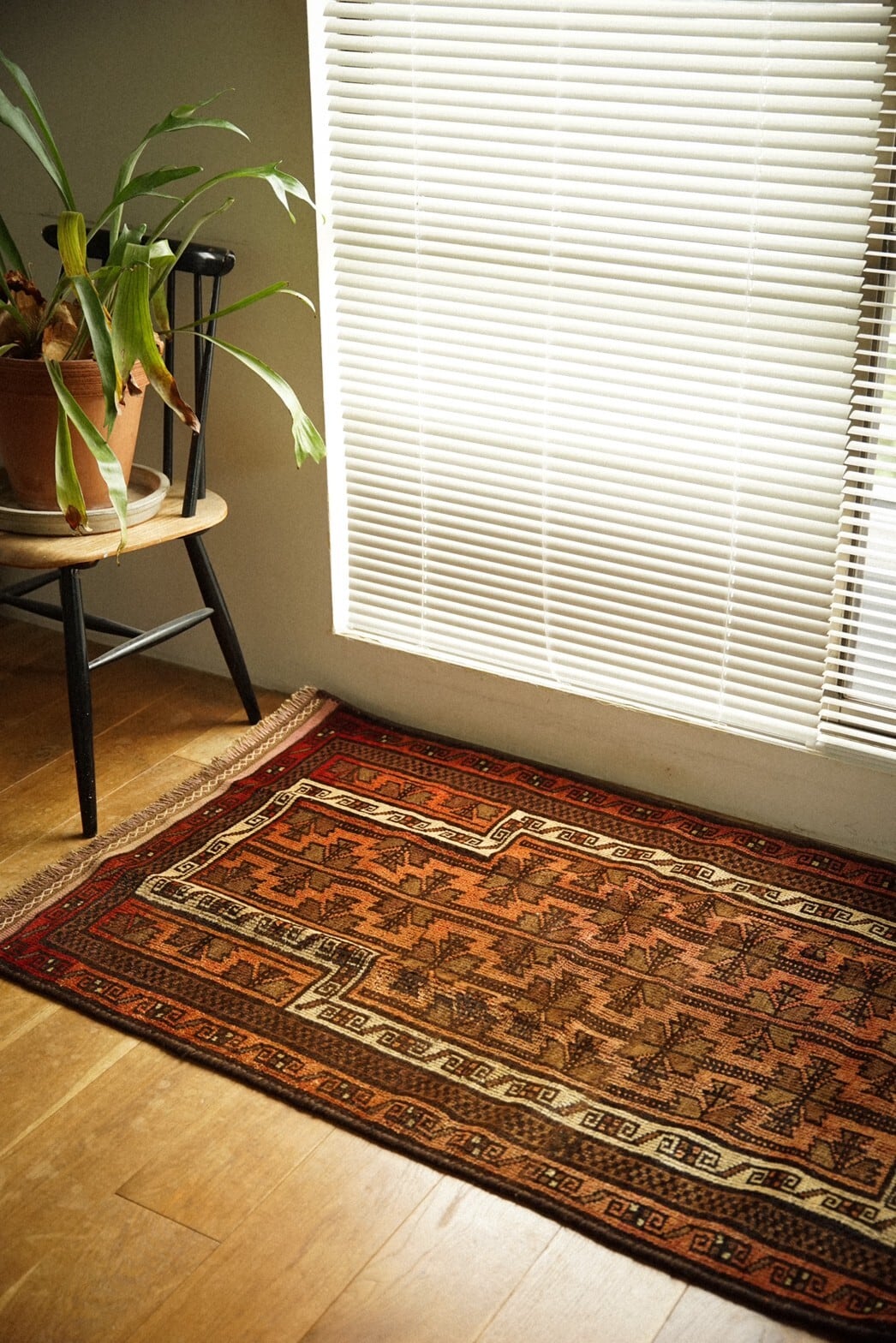 全体にチナール紋様が描かれたプレイヤーラグ。経年により元は茜色だったのが朱赤〜橙色に変化しとても優しい色合いになっています。タイマニ族ならではのざっくりとした織りとデザインは素朴でおおらかな雰囲気です。パイルは程よい厚みのフカフカ感があり、目立ったダメージは無し。キッチン、ベッドサイド、窓辺、玄関マットにちょうど良いサイズ感です。