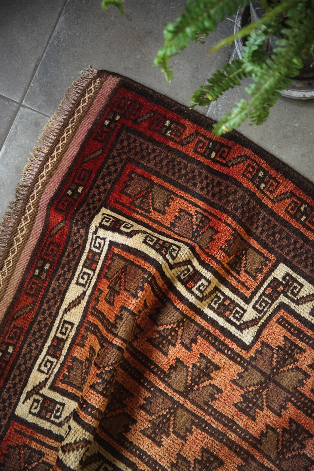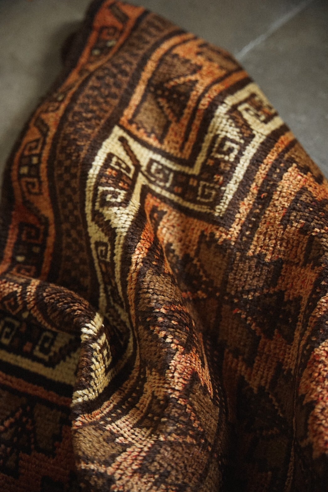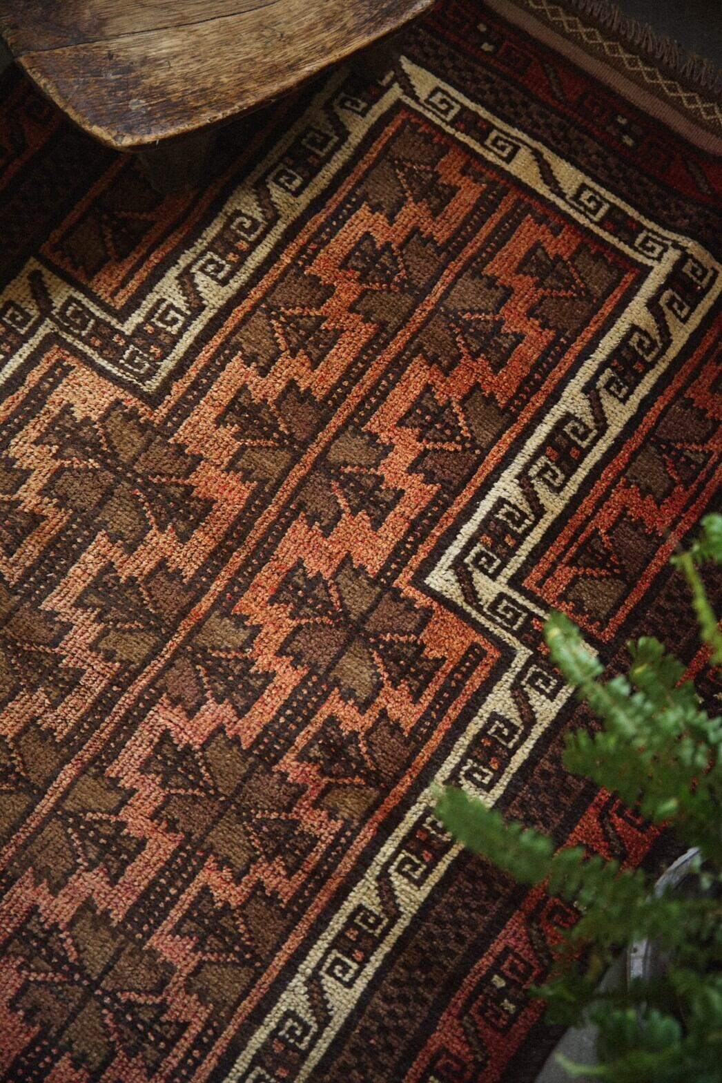 全体にチナール紋様が描かれたプレイヤーラグ。経年により元は茜色だったのが朱赤〜橙色に変化しとても優しい色合いになっています。タイマニ族ならではのざっくりとした織りとデザインは素朴でおおらかな雰囲気です。パイルは程よい厚みのフカフカ感があり、目立ったダメージは無し。キッチン、ベッドサイド、窓辺、玄関マットにちょうど良いサイズ感です。