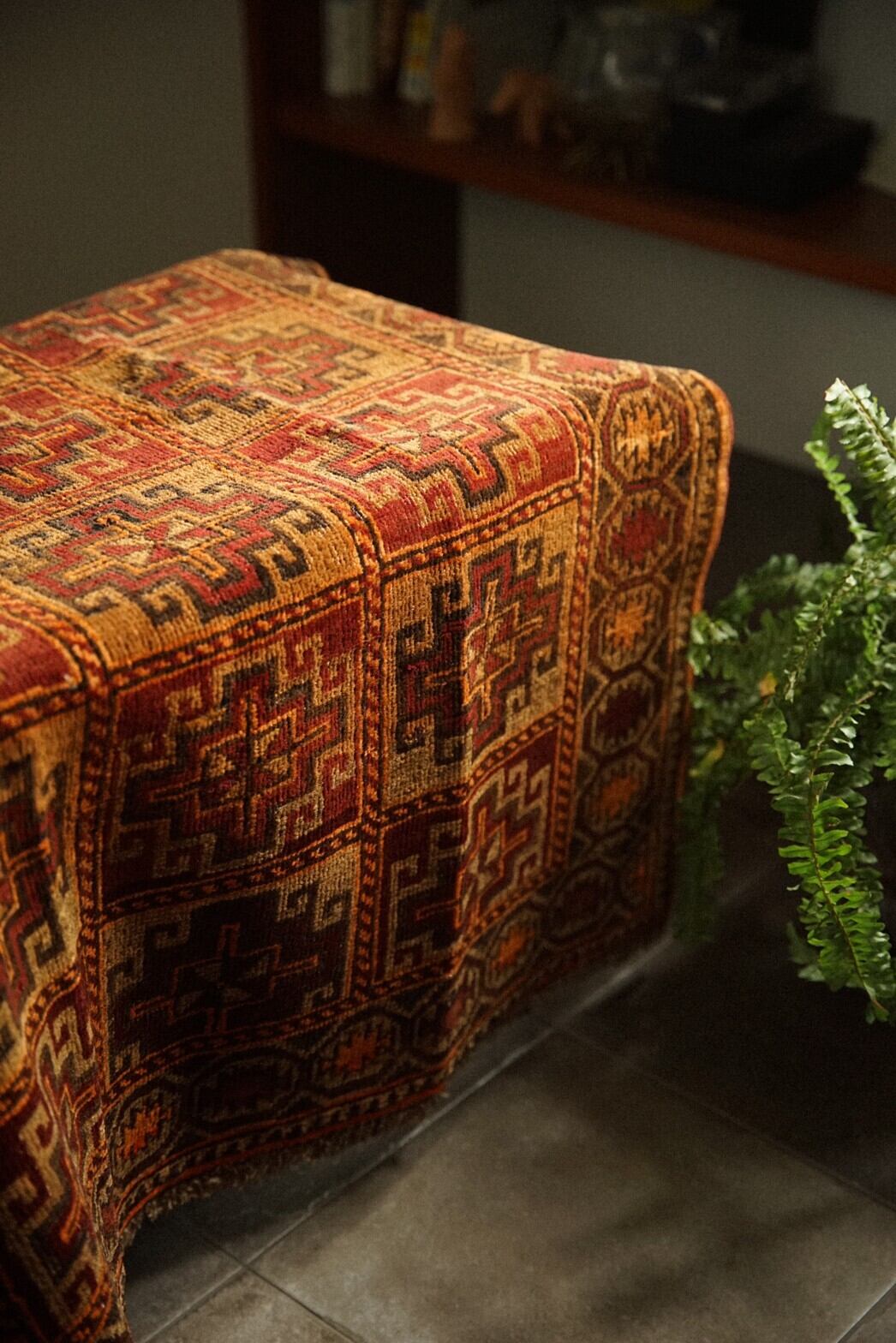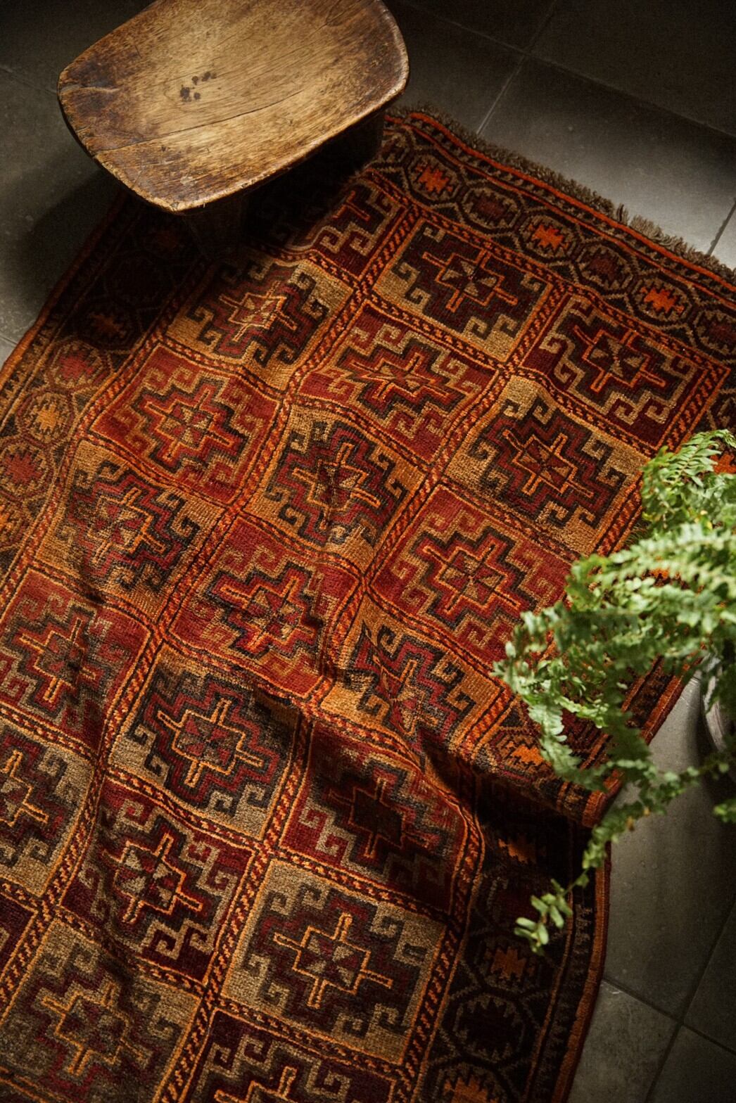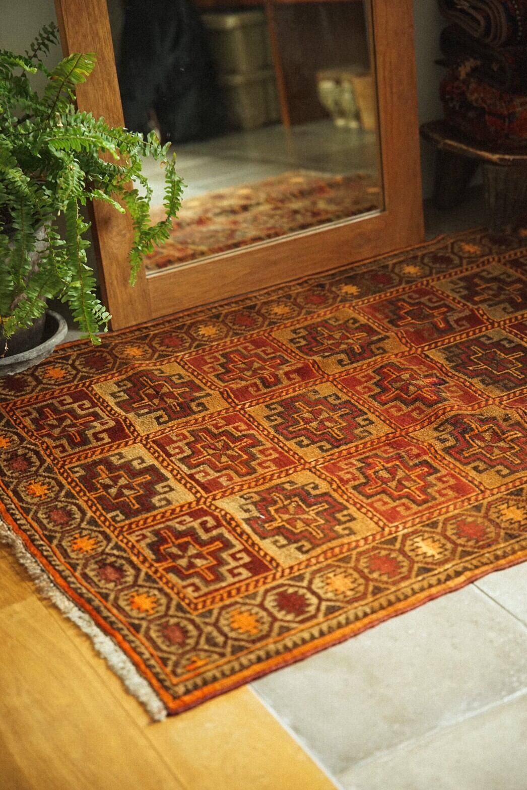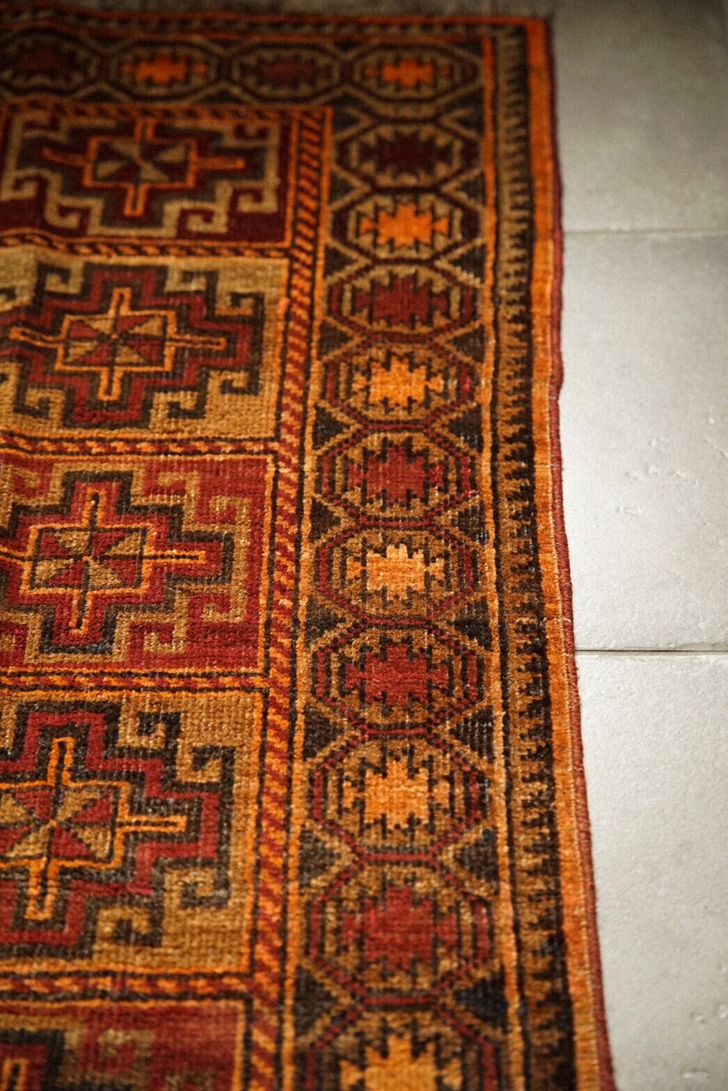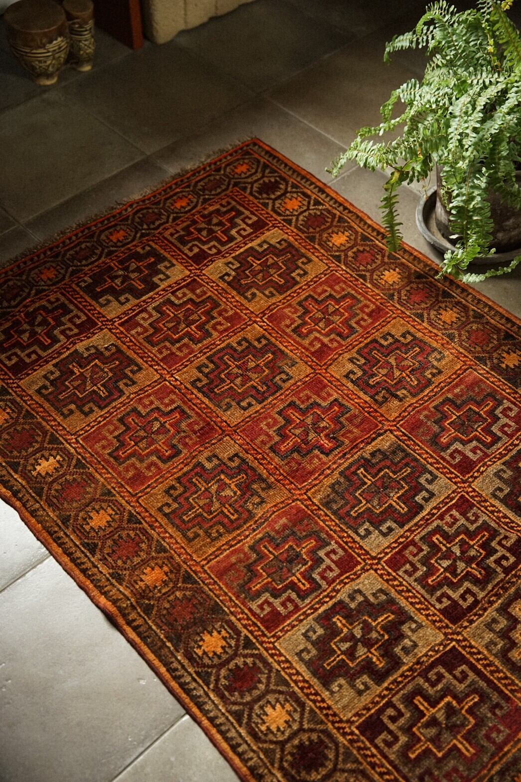 ベージュとブラウンベースに赤やオレンジなどが使用されている暖色系の優しい雰囲気のアリホジャラグ。