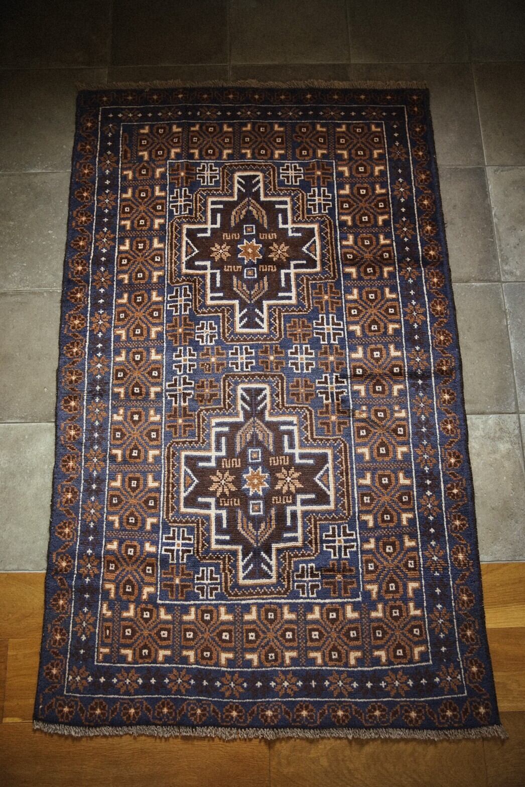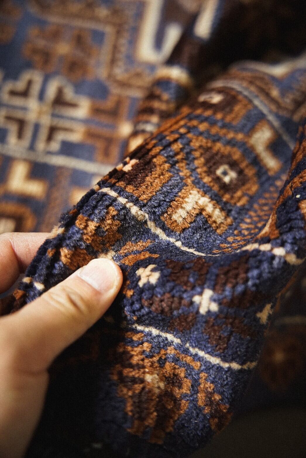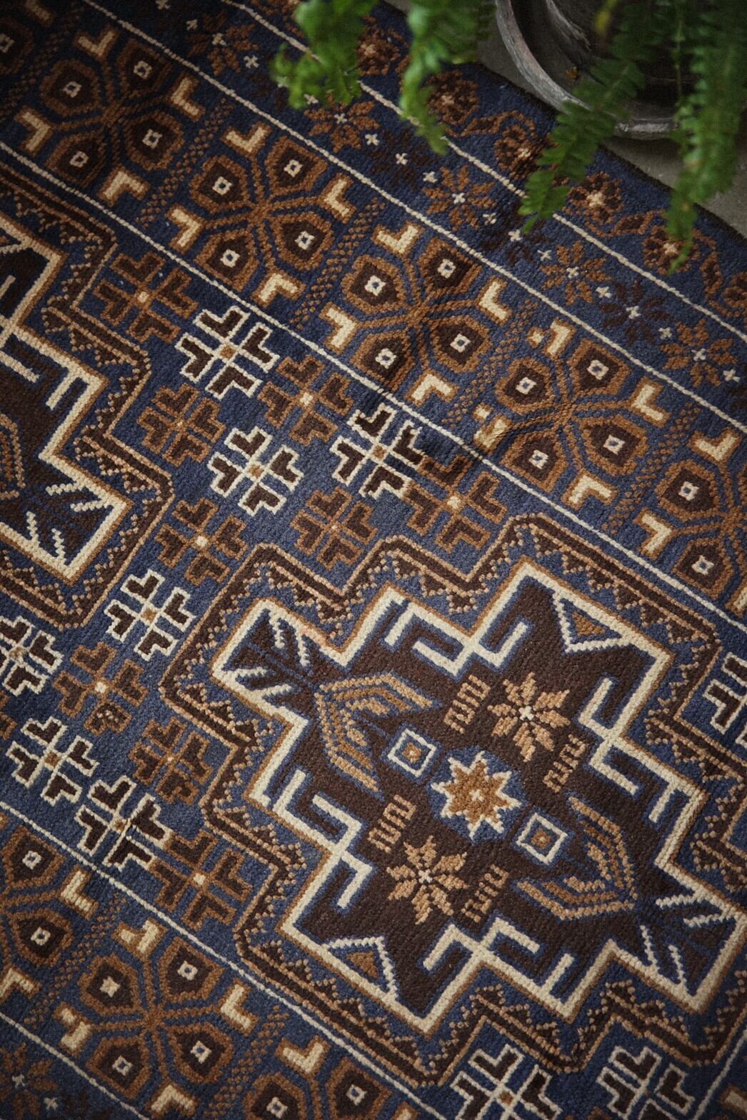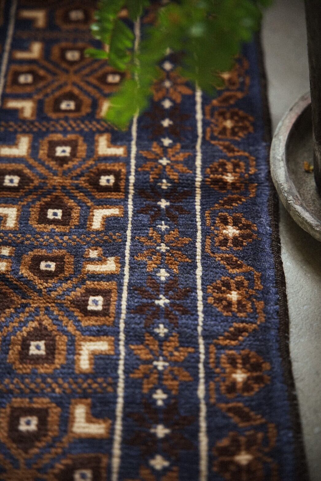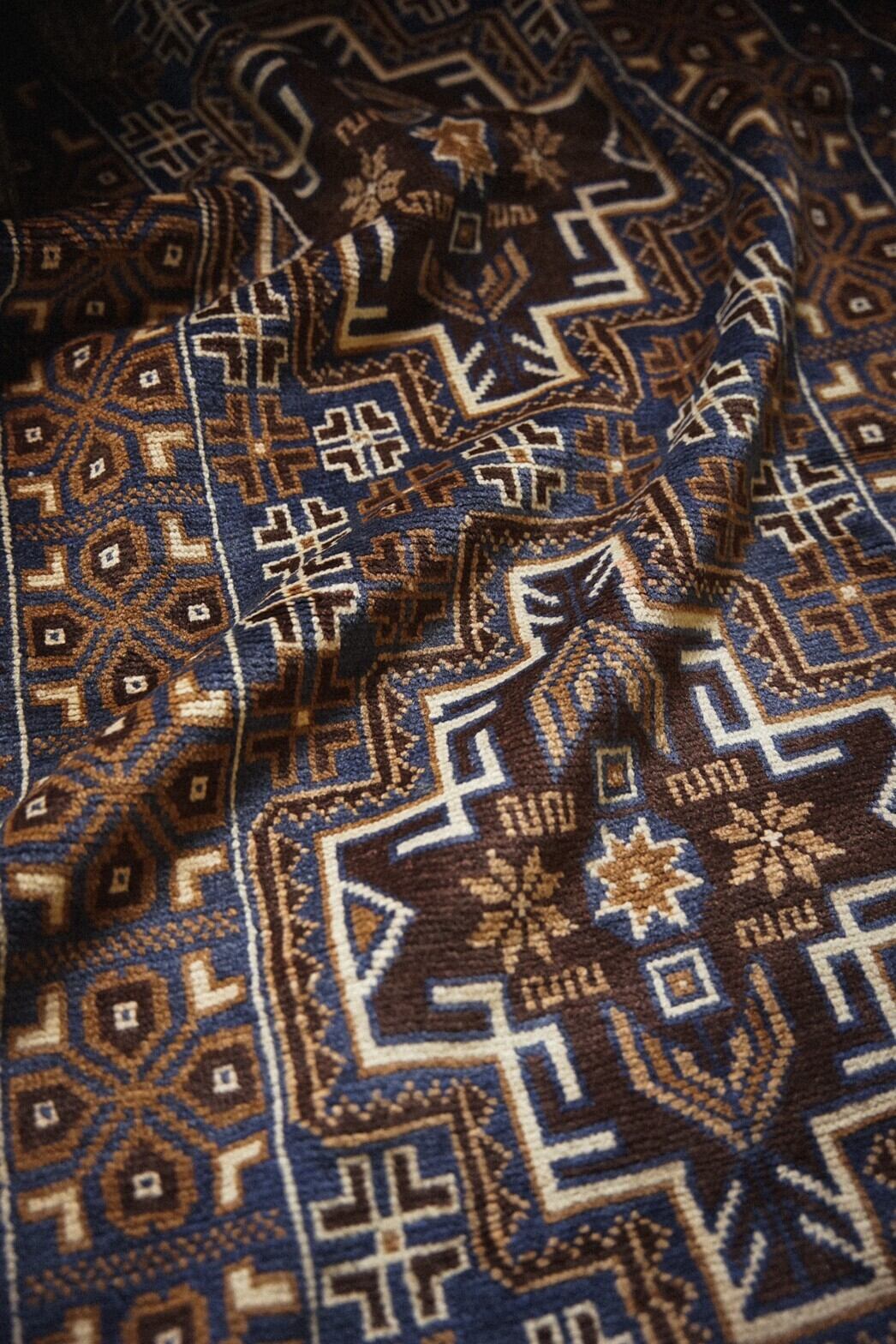 ブルーベースにブラウン、アイボリー、ベージュなどの色構成がかっこいいバルーチラグ。1980年代に作られた若めのラグで状態も良く、パイルもとてもきれいに残っています。真ん中に2つのメダリオンが配置され、ボーダー部分には可愛らしい花が並びます。アシンメトリーなデザインなのですっきりとした印象で、どんなインテリアにも馴染んでくれそうです。程よい厚みがあり、リビングやソファ前、玄関やキッチンにもおすすめのサイズです。