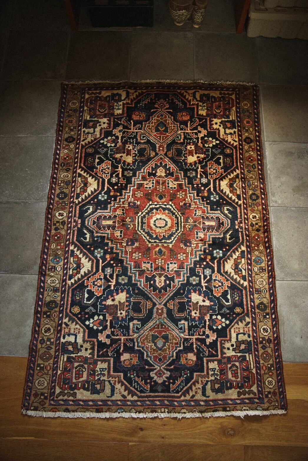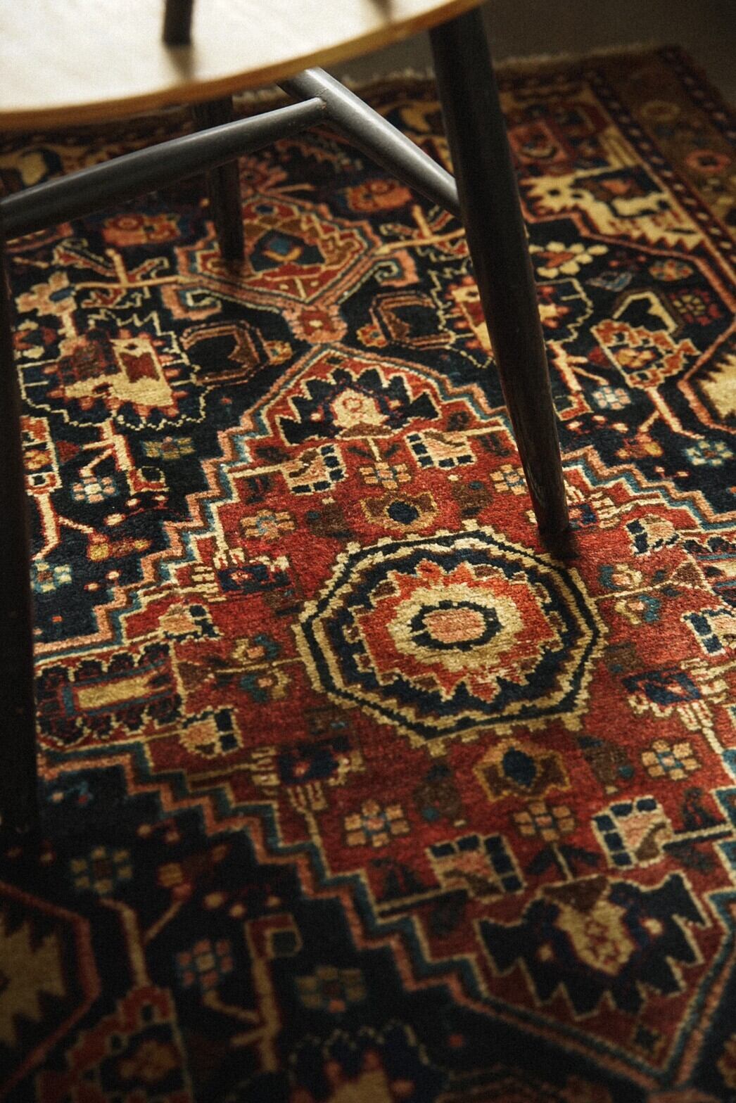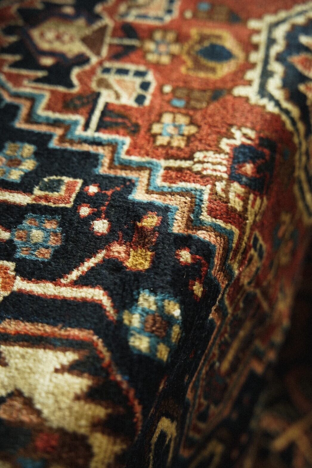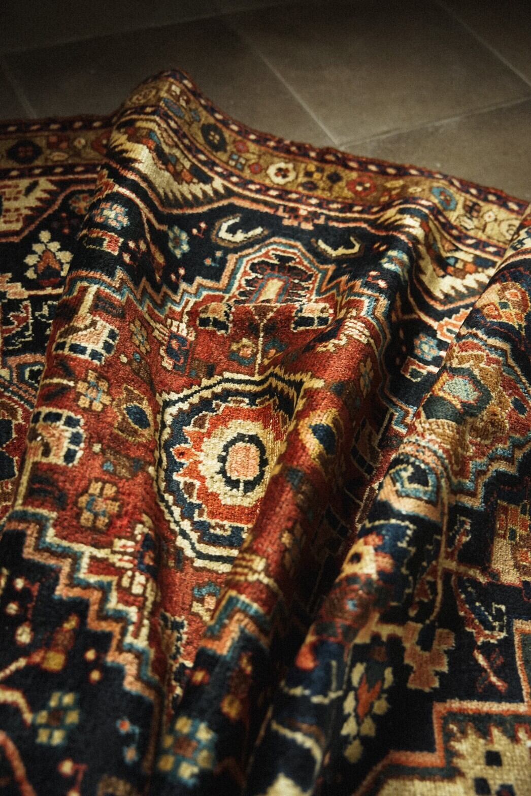 イランの北西部に位置する古都ハマダン周辺で織られたラグ。ハマダン絨毯の象徴でもある艶と光沢感が美しいキャメル色をベースにたくさんの花文様が幾何学的に並びます。メダリオン部分の朱赤とフィールドの深いネイビーのメリハリがデザインのかっこよさを引き立て、気品を感じる一枚。