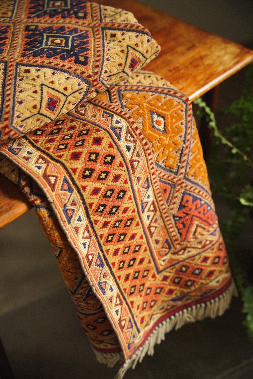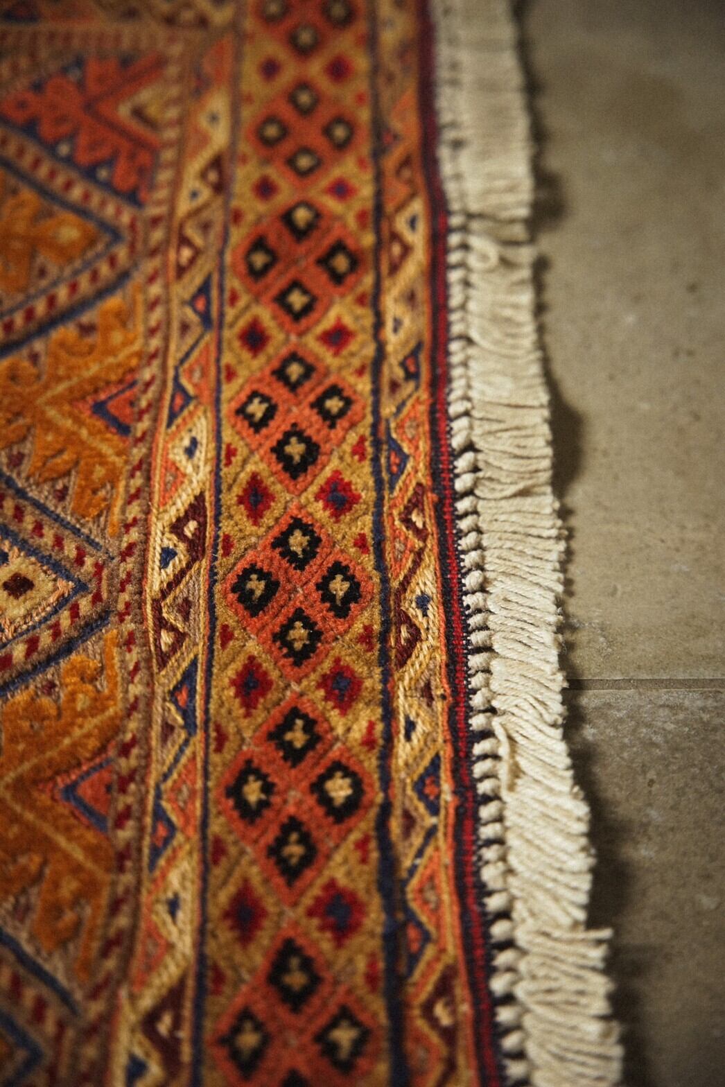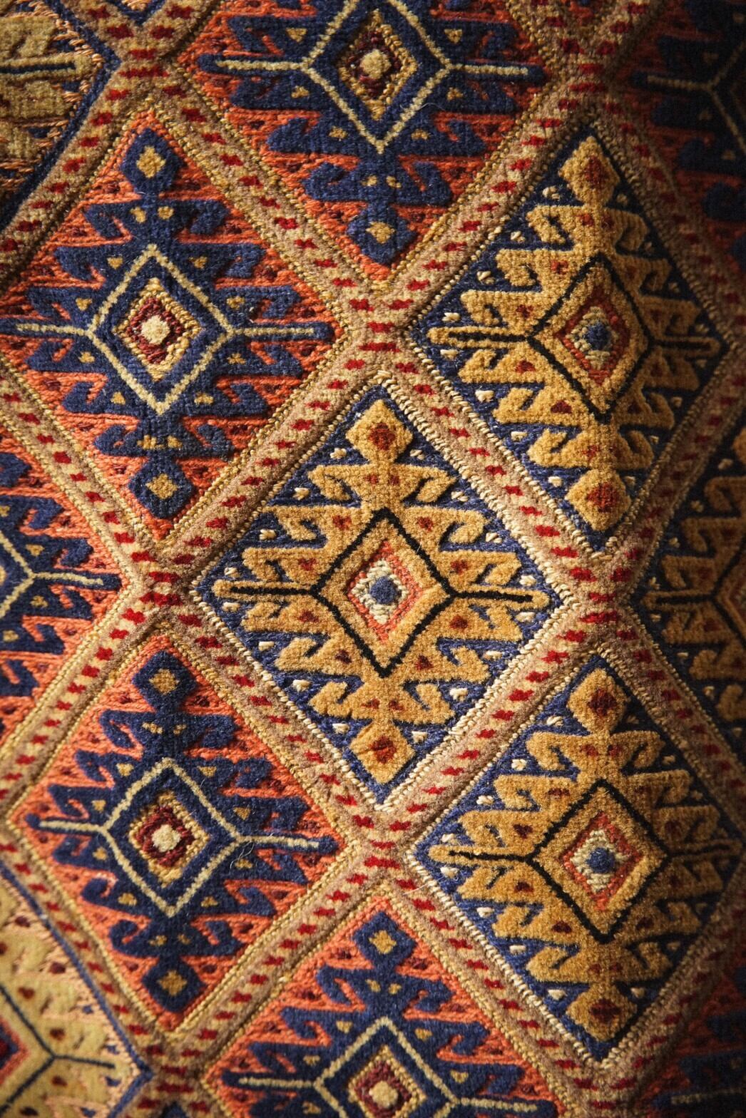 触り心地はしっとりとしており、キリム部分だけでなくパイル織との組み合わせのためチクチク感は全くありません。