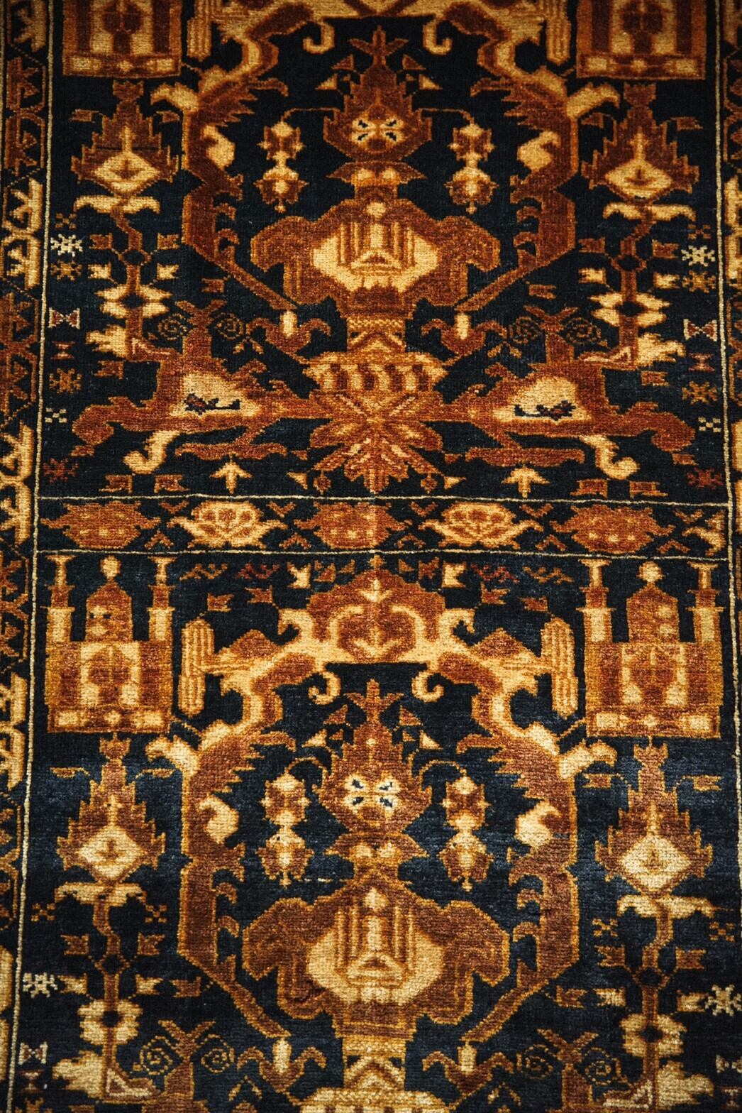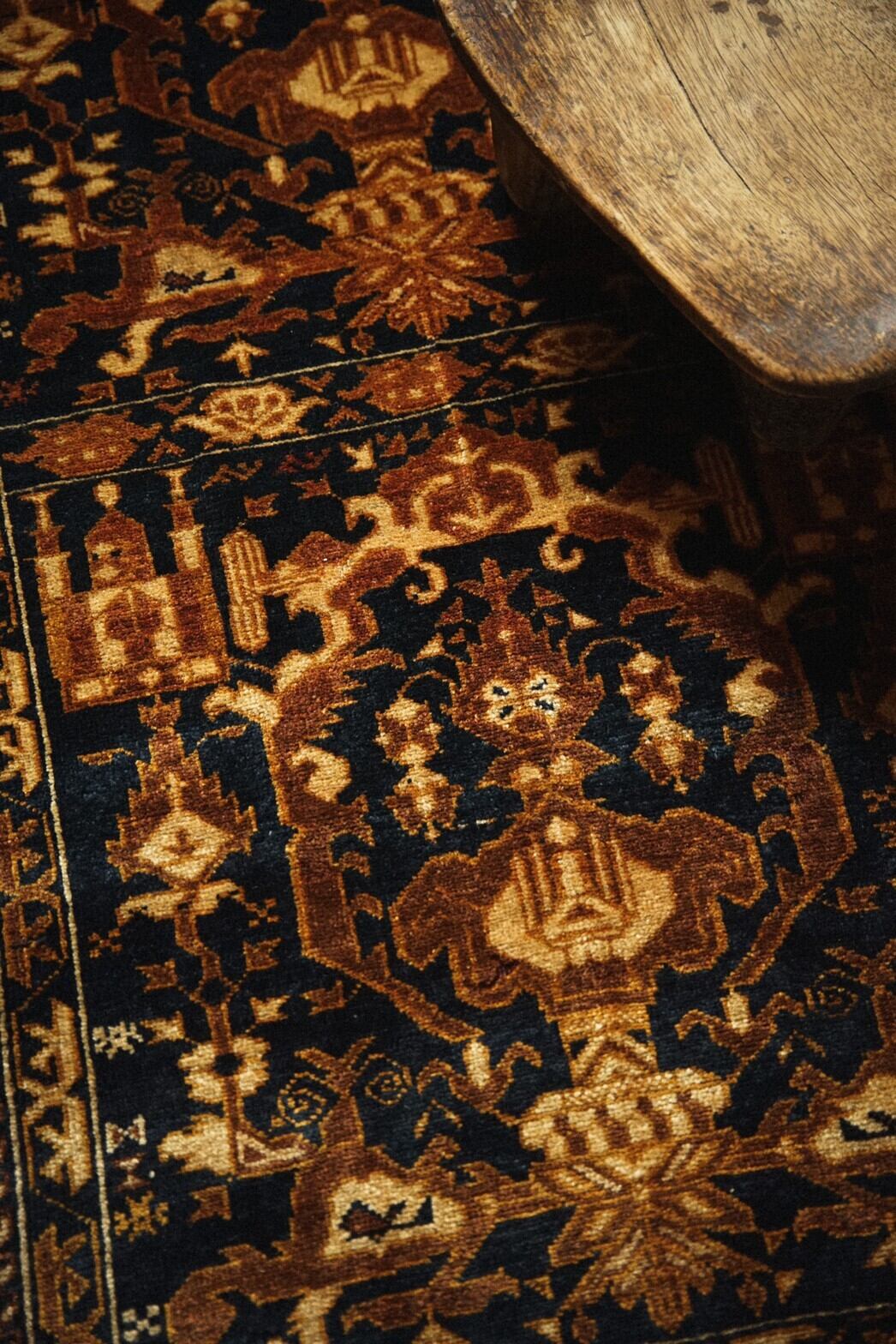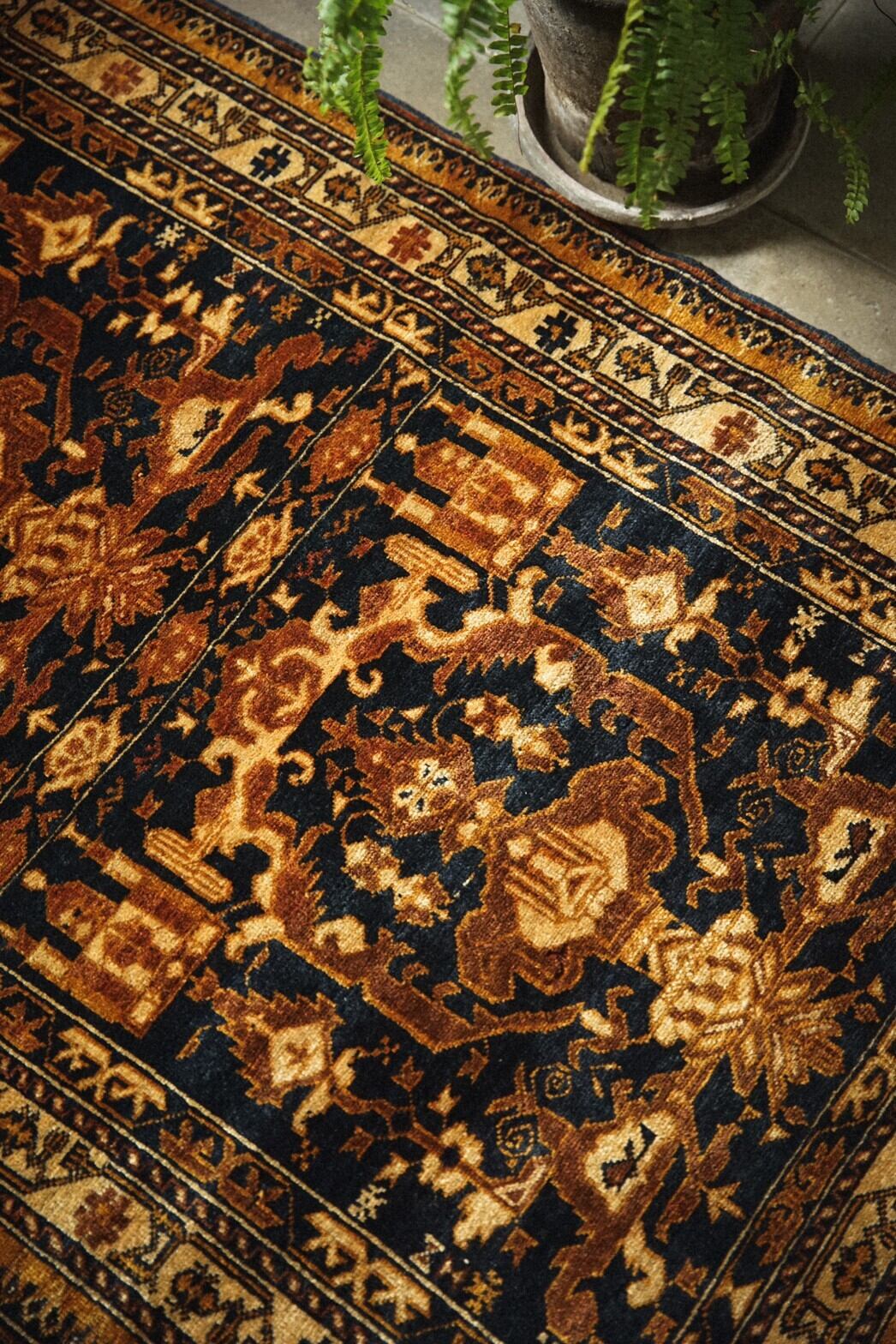 ブラウンとネイビーがベースの渋めの色合いがとても魅力的なアリホジャラグ。フィールドに大きく描かれているのはキャンドルモチーフです。周りにはミフラーブや炎のようなモチーフが幾何学的に描かれています。華やかなデザインですが、落ち着いた色味でまとまっているため、お部屋に敷いてもしっくりと馴染んでくれます。パイルは短めですがトルクメン族特有の細かい打ち込みでしっとりと滑らか。ダメージもなくコンディションも良好です。使いやすいサイズ感ですので、お気に入りの場所にどうぞ!